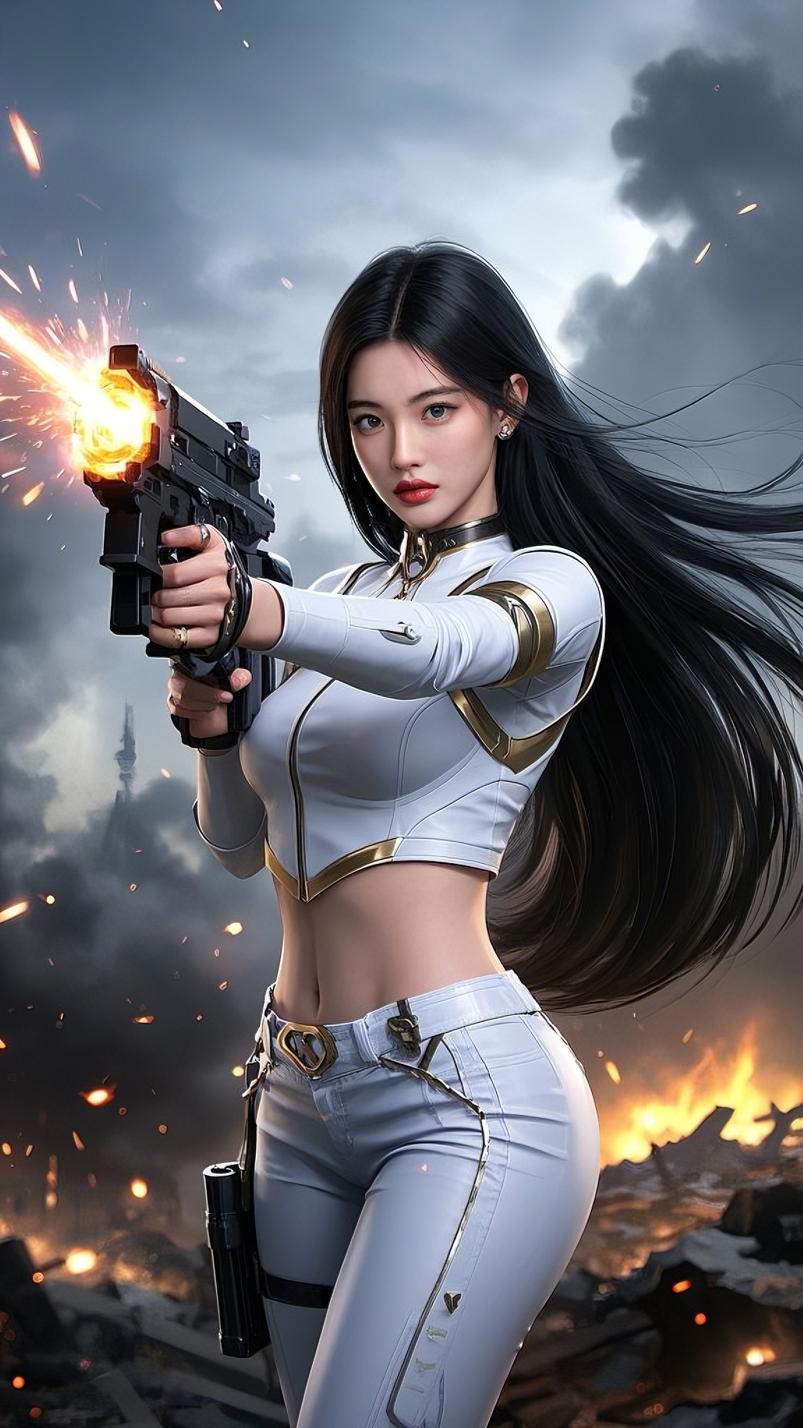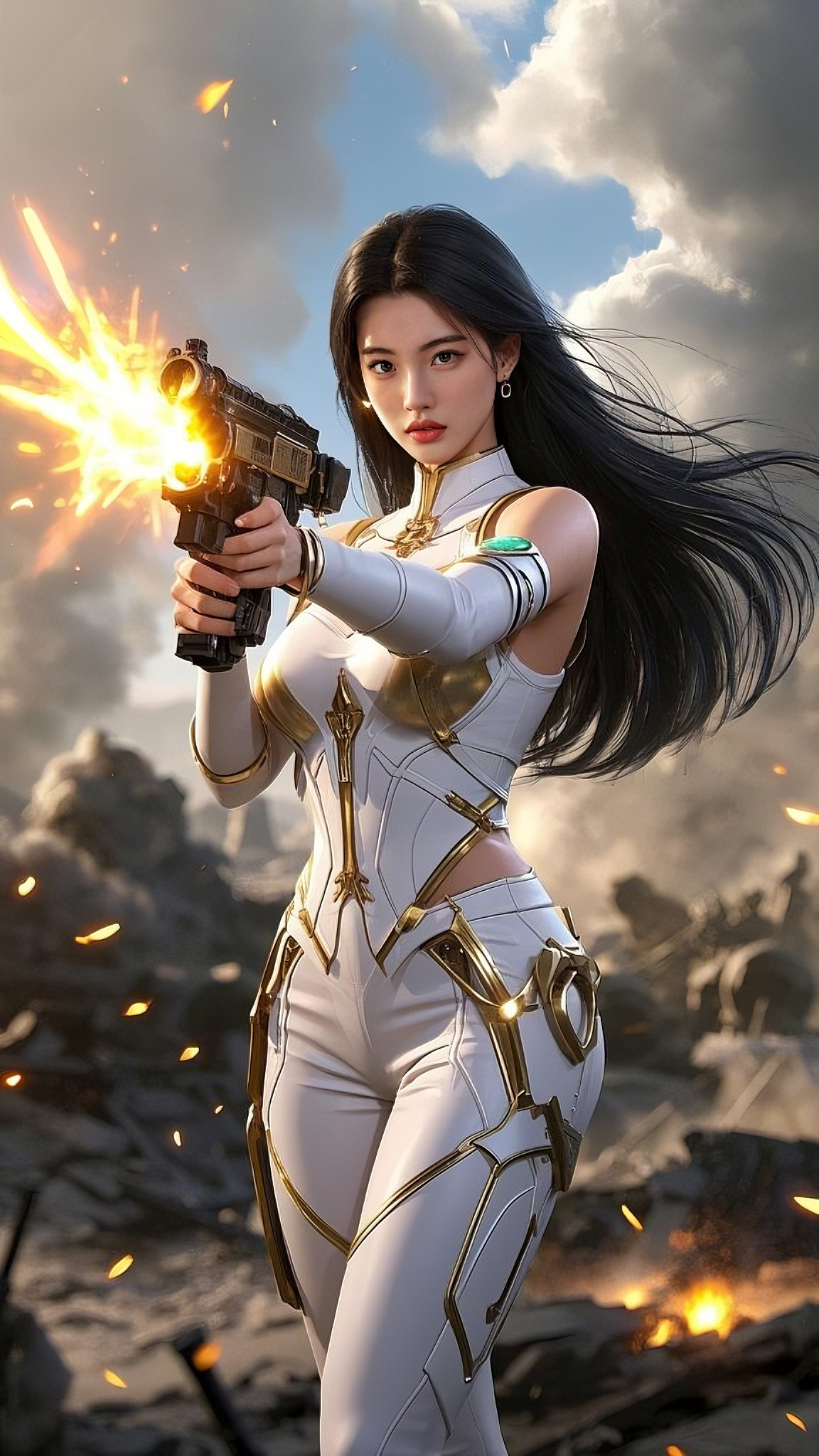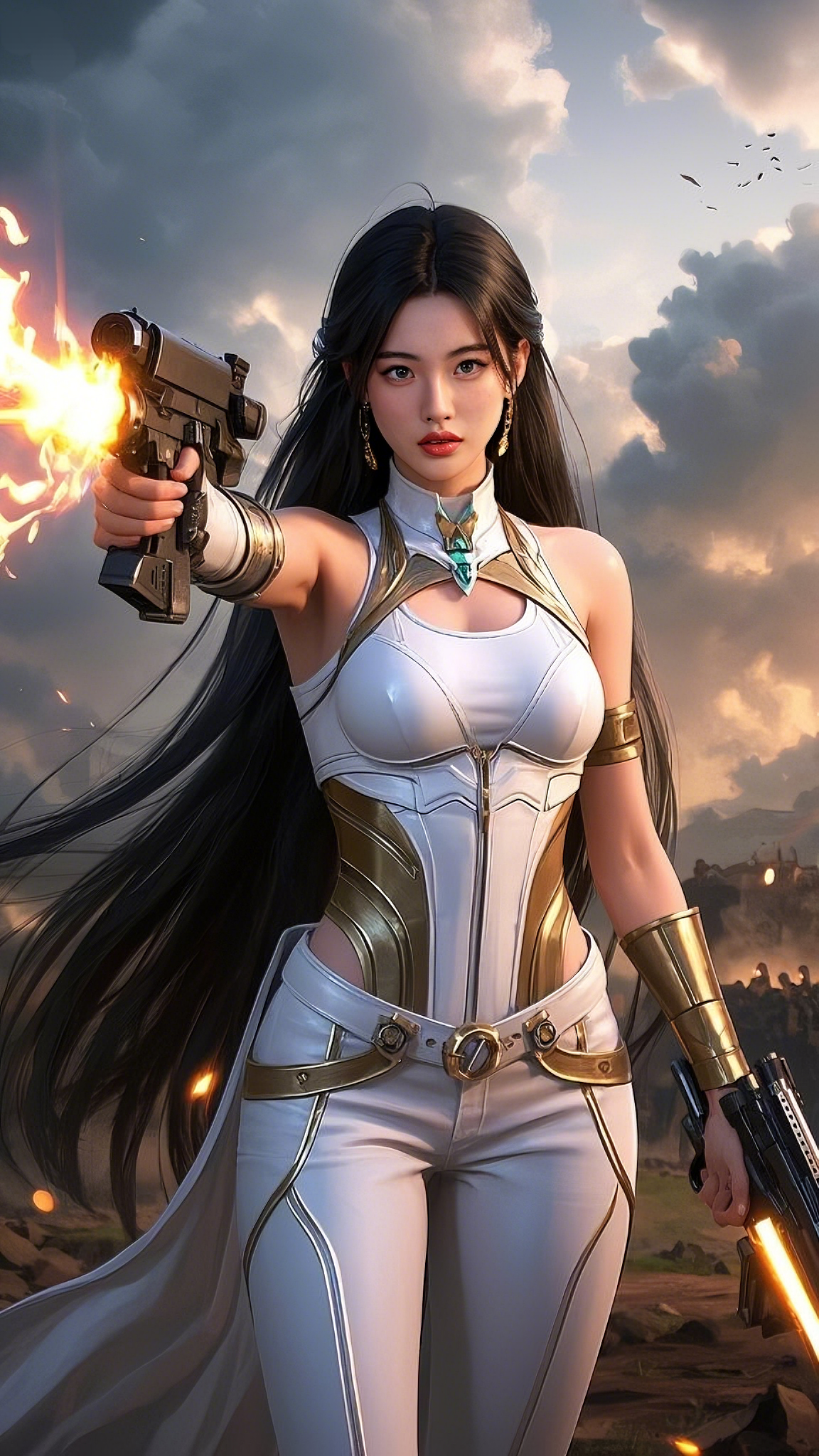 Her emerald-blue eyes burned with unwavering focus, locked onto her enemies. Long, jet-black hair cascaded down her back, strands flowing in the wind like the banners of a forgotten empire. Her armor was an intricate fusion of beauty and strength—a fitted white and gold combat suit, molded to perfection, designed not just for battle but as a declaration of power.
