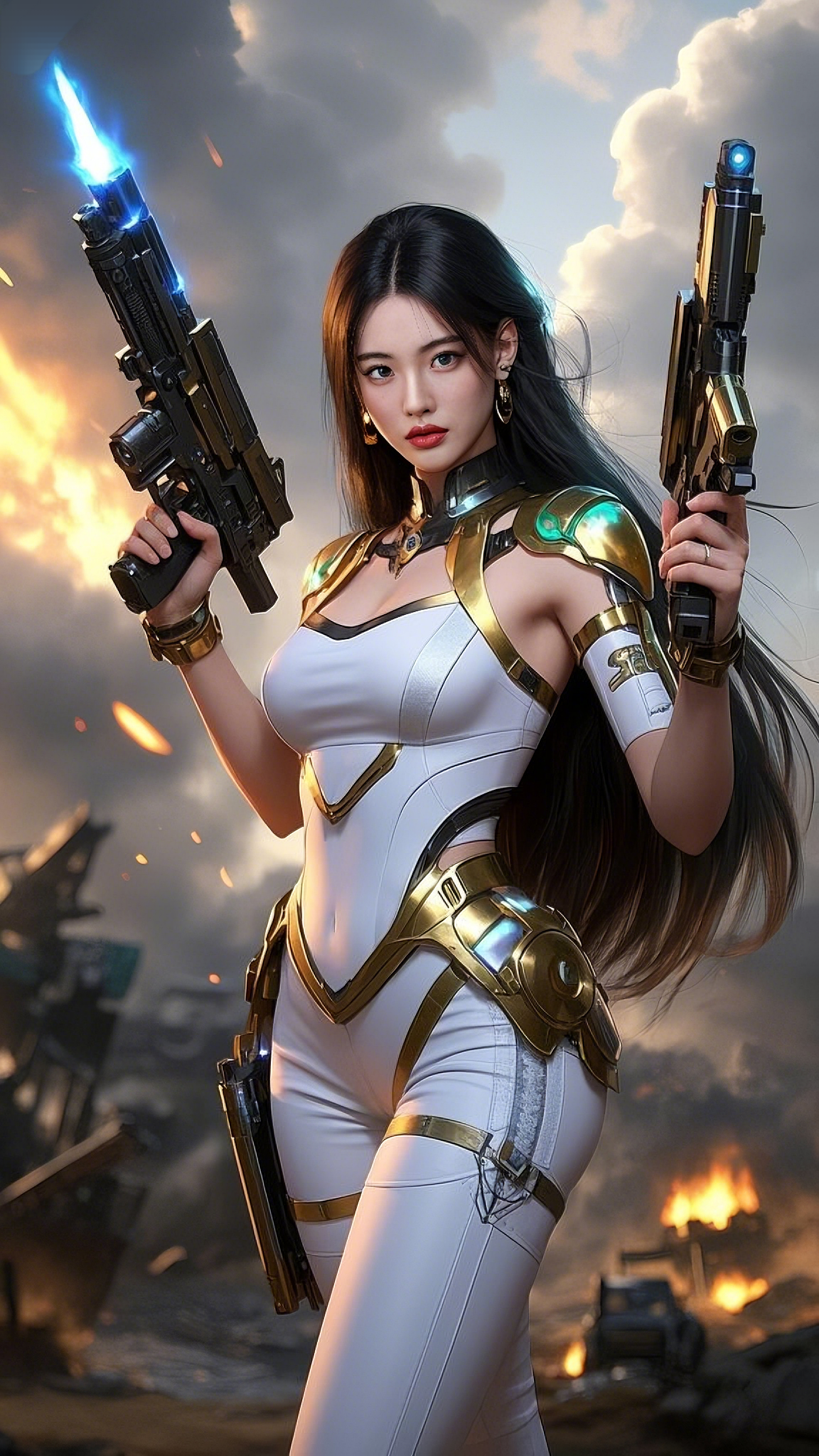 The battlefield roared with fire and fury. Smoke coiled into the sky like a serpent, curling around the dying light of the sun. The air was thick with the acrid scent of burning metal and scorched earth, mingled with the distant screams of soldiers and the relentless echo of gunfire. Amidst the destruction, she stood—a goddess of war, wielding weapons of the future, her presence commanding the chaos around her.