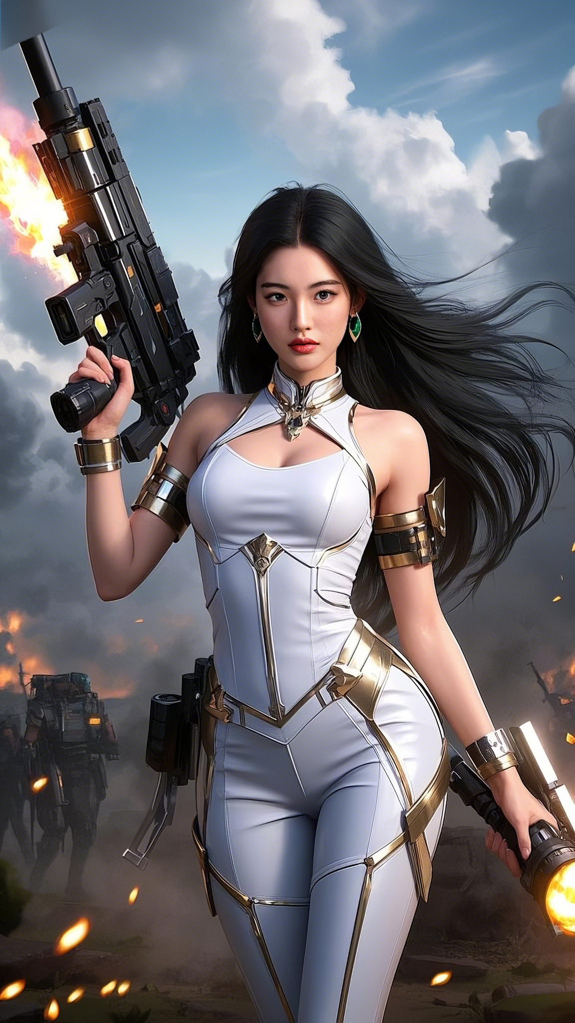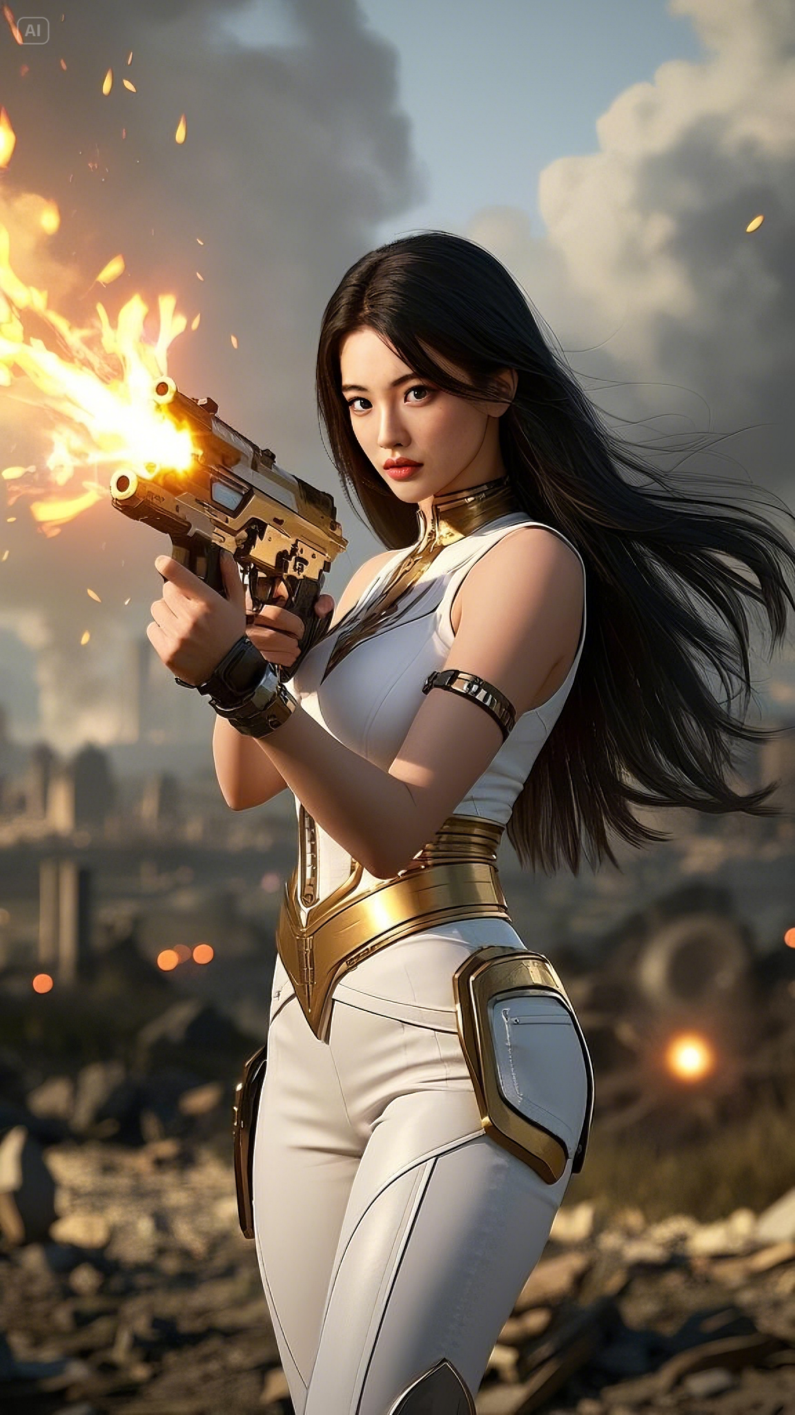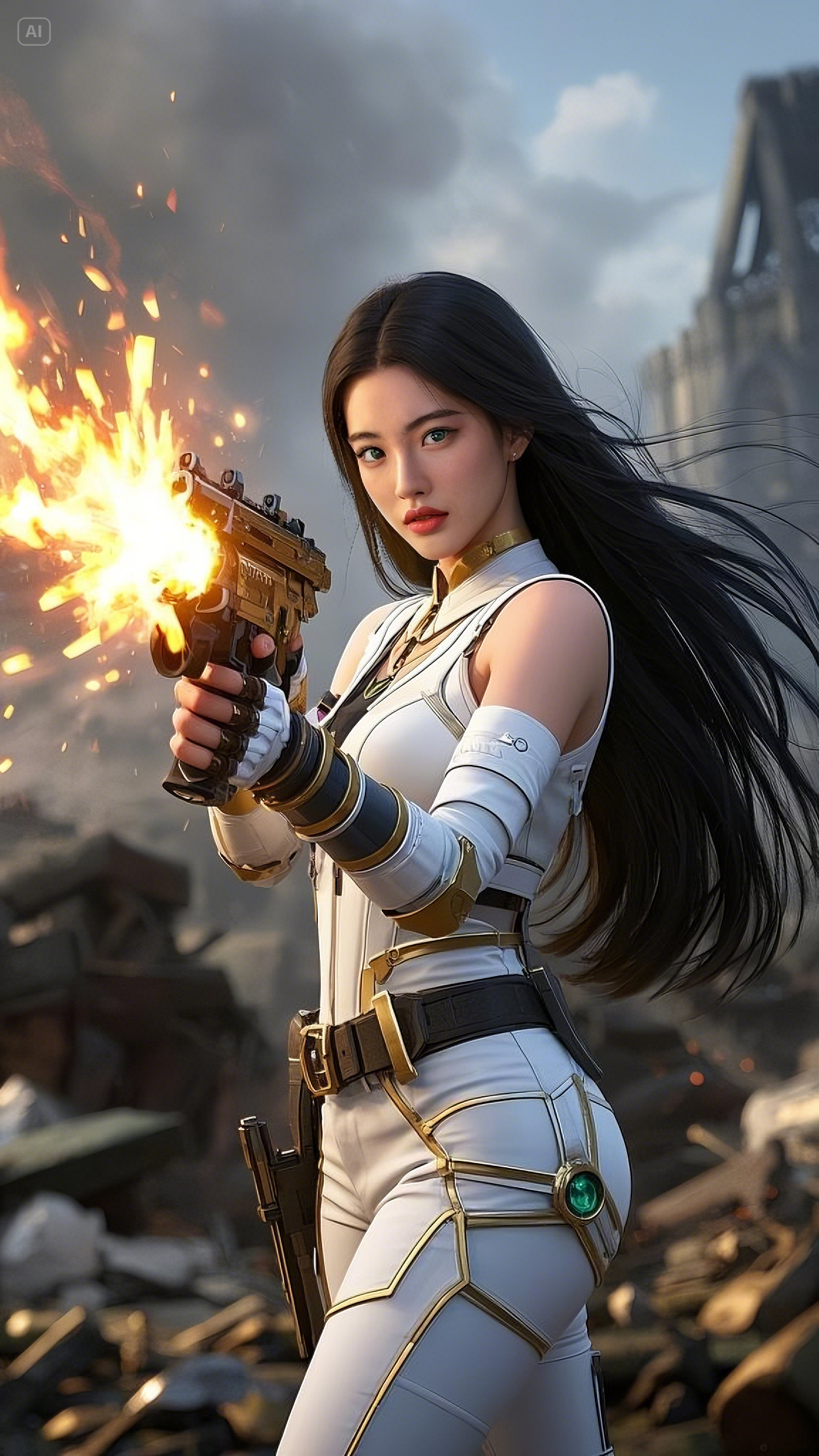 Her emerald-blue eyes gleamed with unwavering determination, scanning the wreckage before her. Long, flowing black hair cascaded behind her, strands dancing in the fiery winds of war. Clad in a sleek, form-fitting white and gold combat suit, she moved with the effortless grace of a goddess.