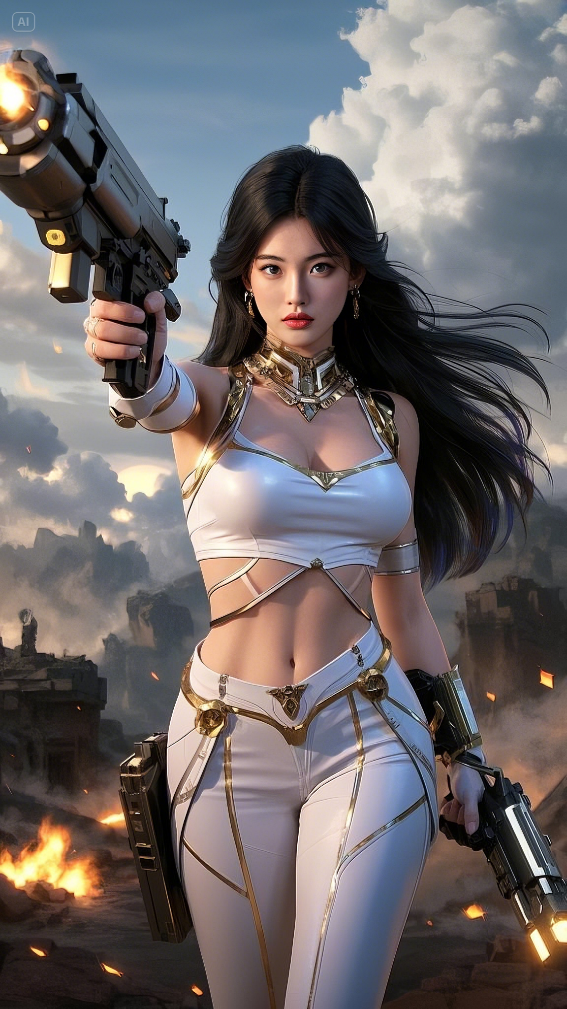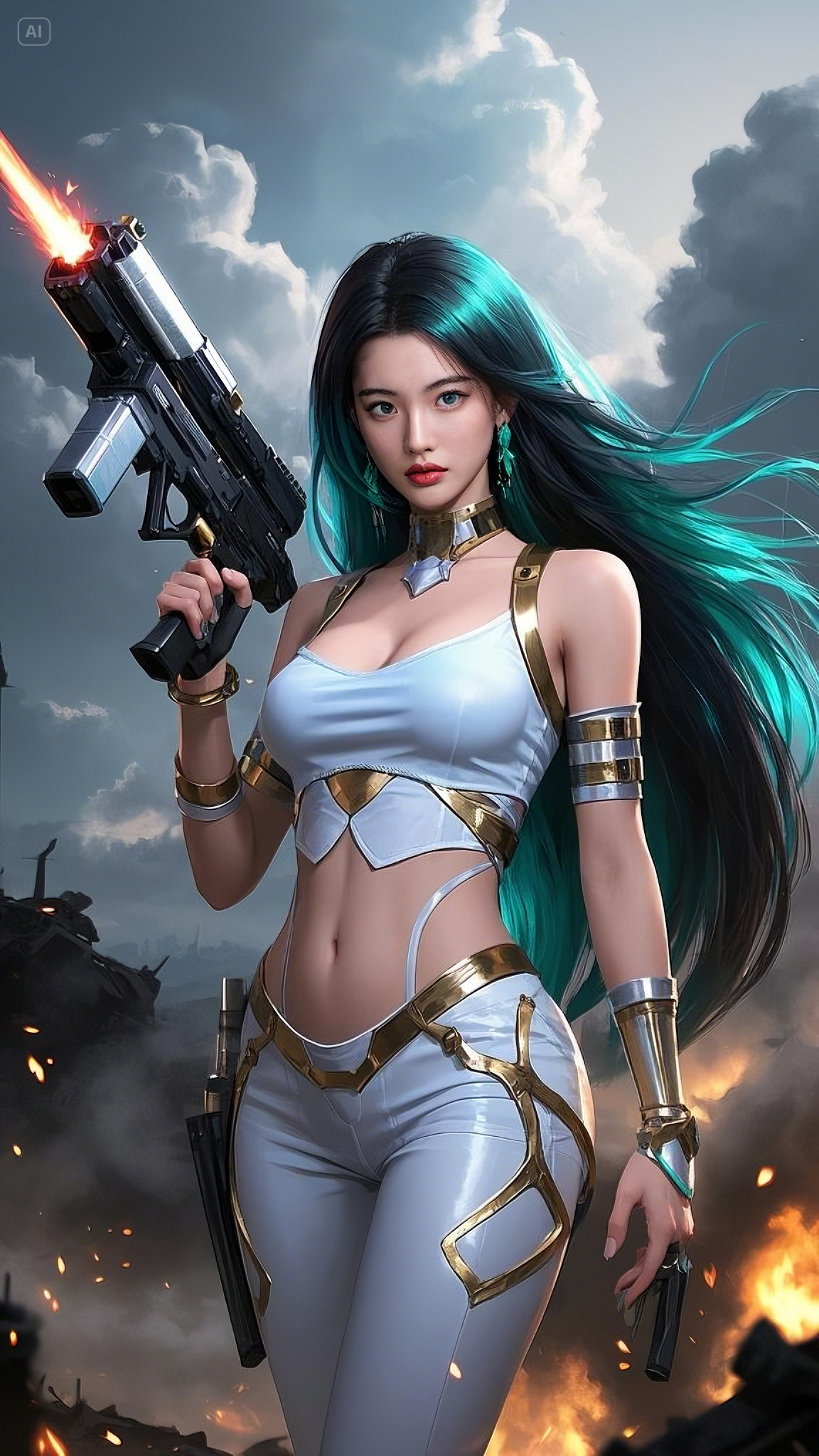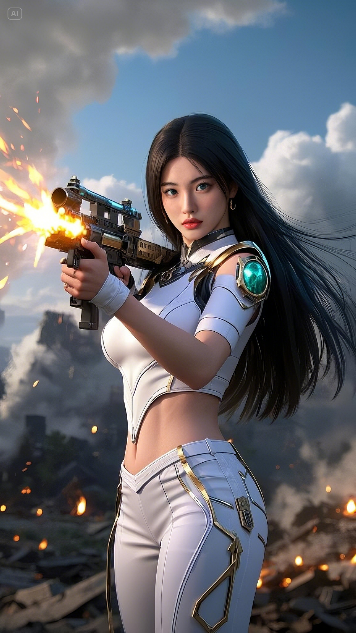 Her emerald-blue eyes gleamed with unwavering determination, scanning the wreckage before her. Long, flowing black hair cascaded behind her, strands dancing in the fiery winds of war. Clad in a sleek, form-fitting white and gold combat suit, she moved with the effortless grace of a goddess.