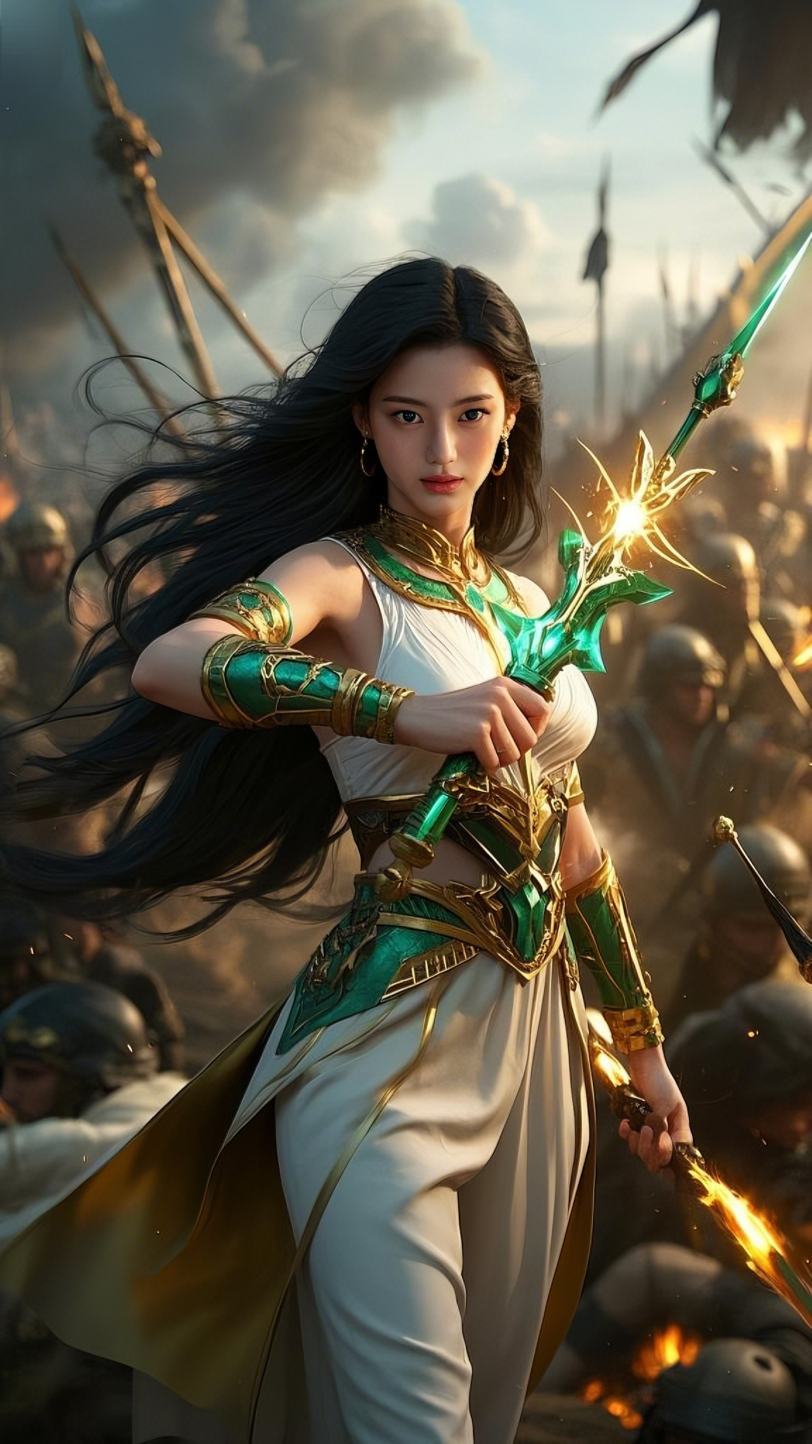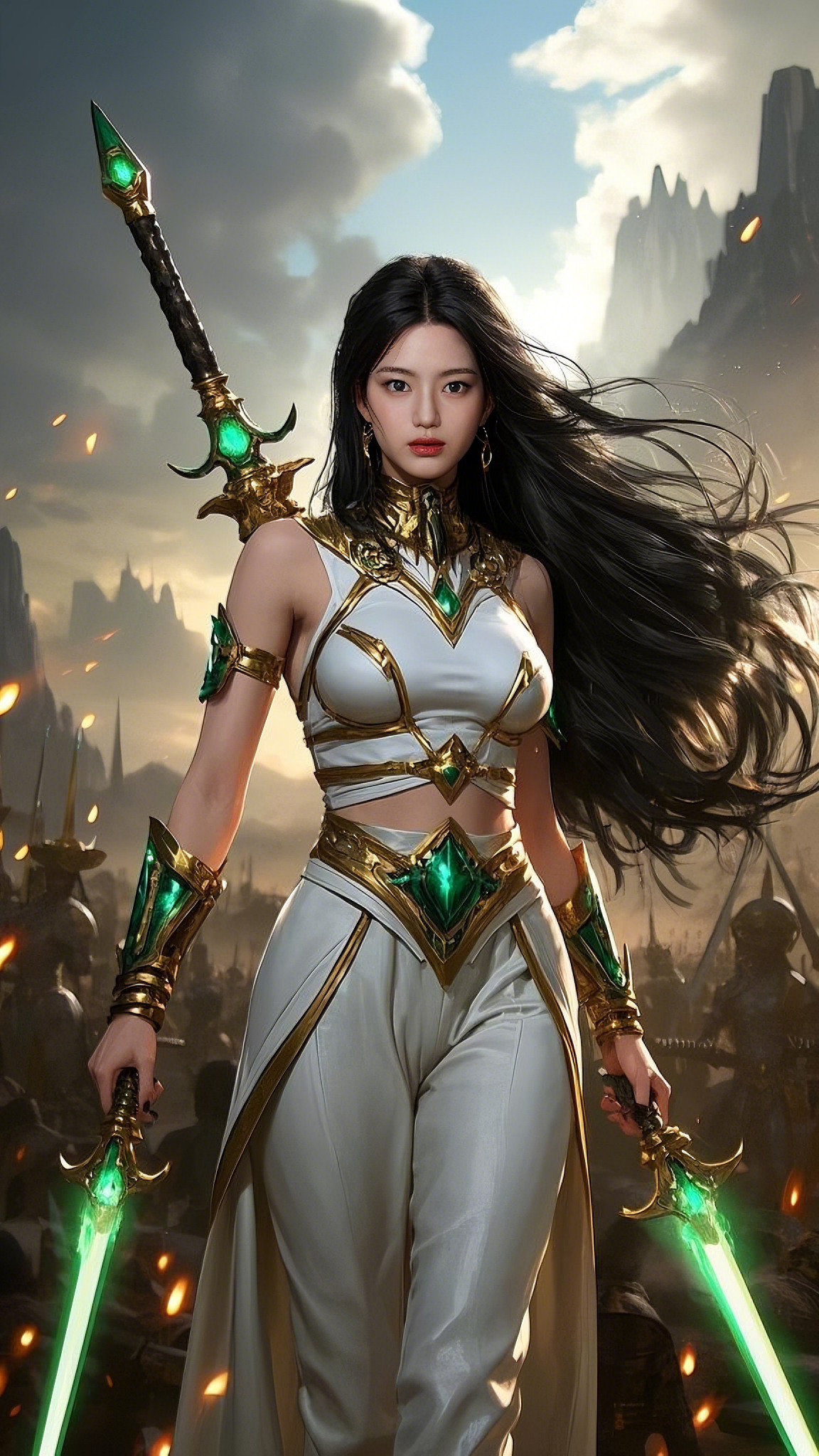Her emerald-blue eyes burned with unwavering resolve, locked onto the enemies that dared to challenge her. Long, flowing black hair cascaded around her, caught in the violent winds of war, its countless strands moving like living shadows.