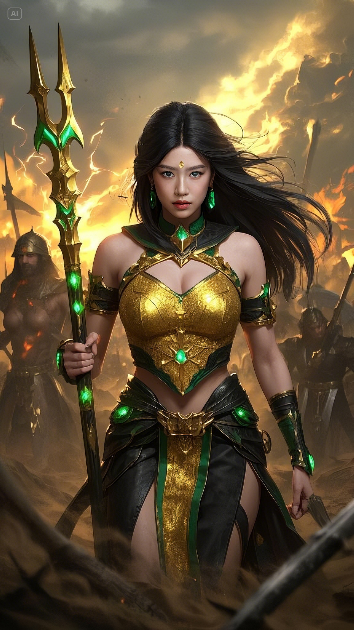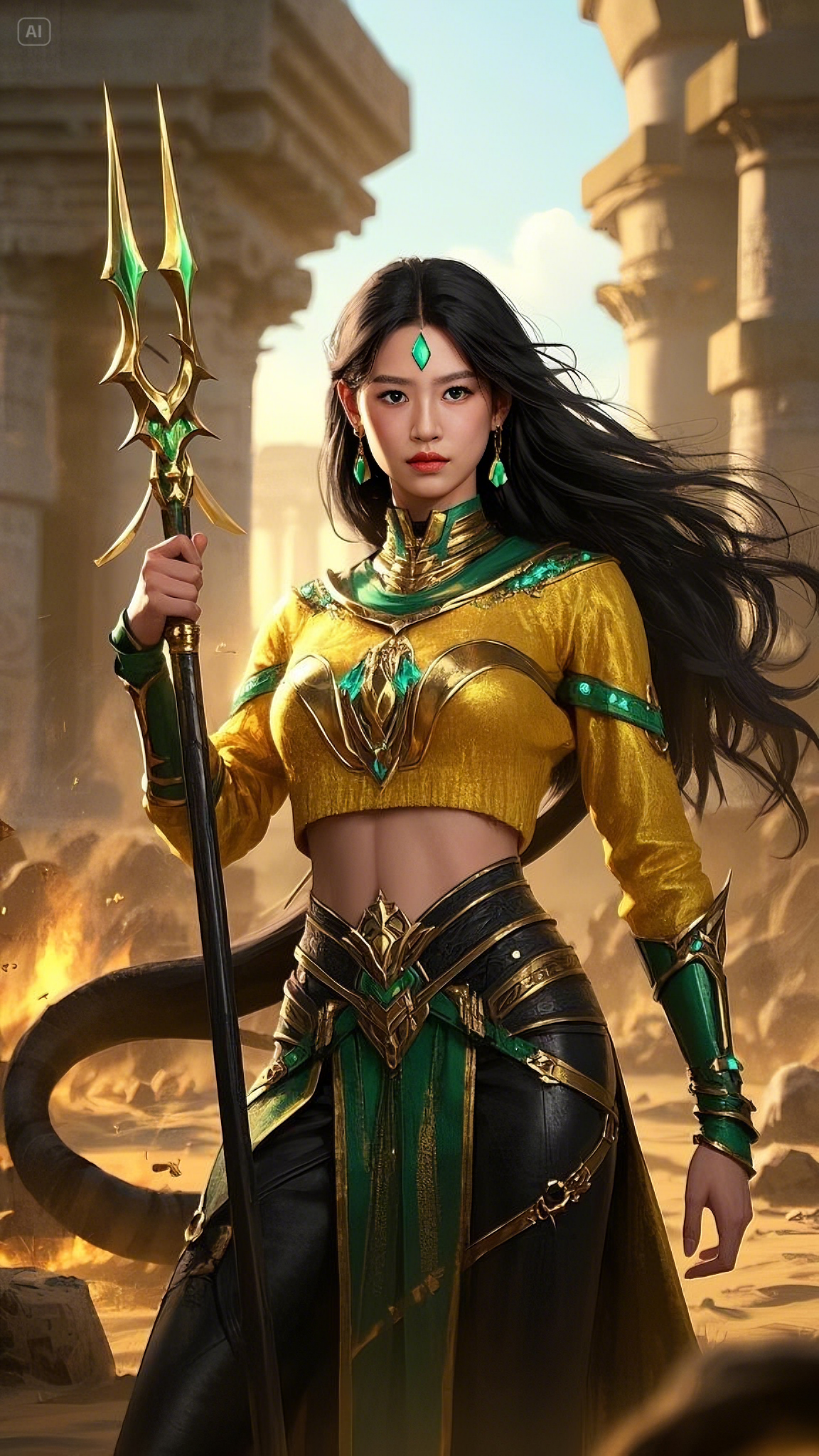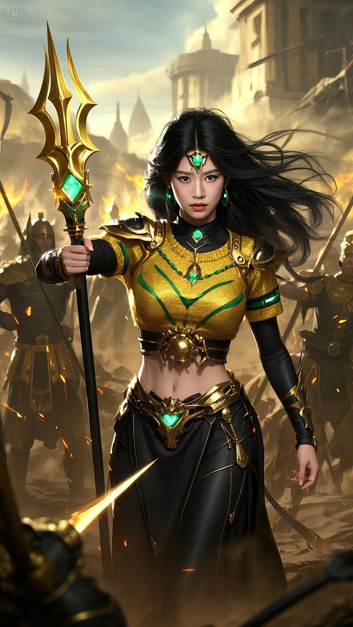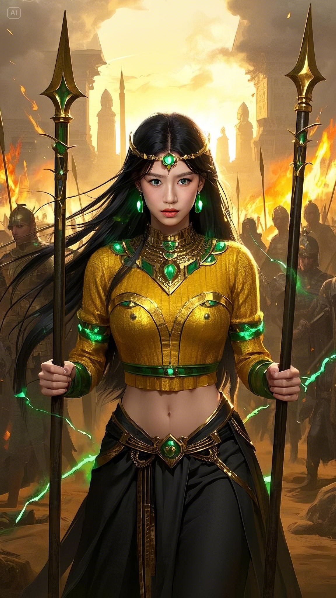 She strode forward, each step exuding an aura of power, her emerald-blue eyes burning with divine intensity. Her long black hair, adorned with golden ornaments, flowed like a midnight river, moving effortlessly in the scorching desert winds. She wore a golden and green battle outfit, its design seamlessly merging divine craftsmanship with the elegance of an ancient queen. Her emerald heart-shaped pendant pulsed with celestial energy, its light illuminating the battlefield like an eternal flame.