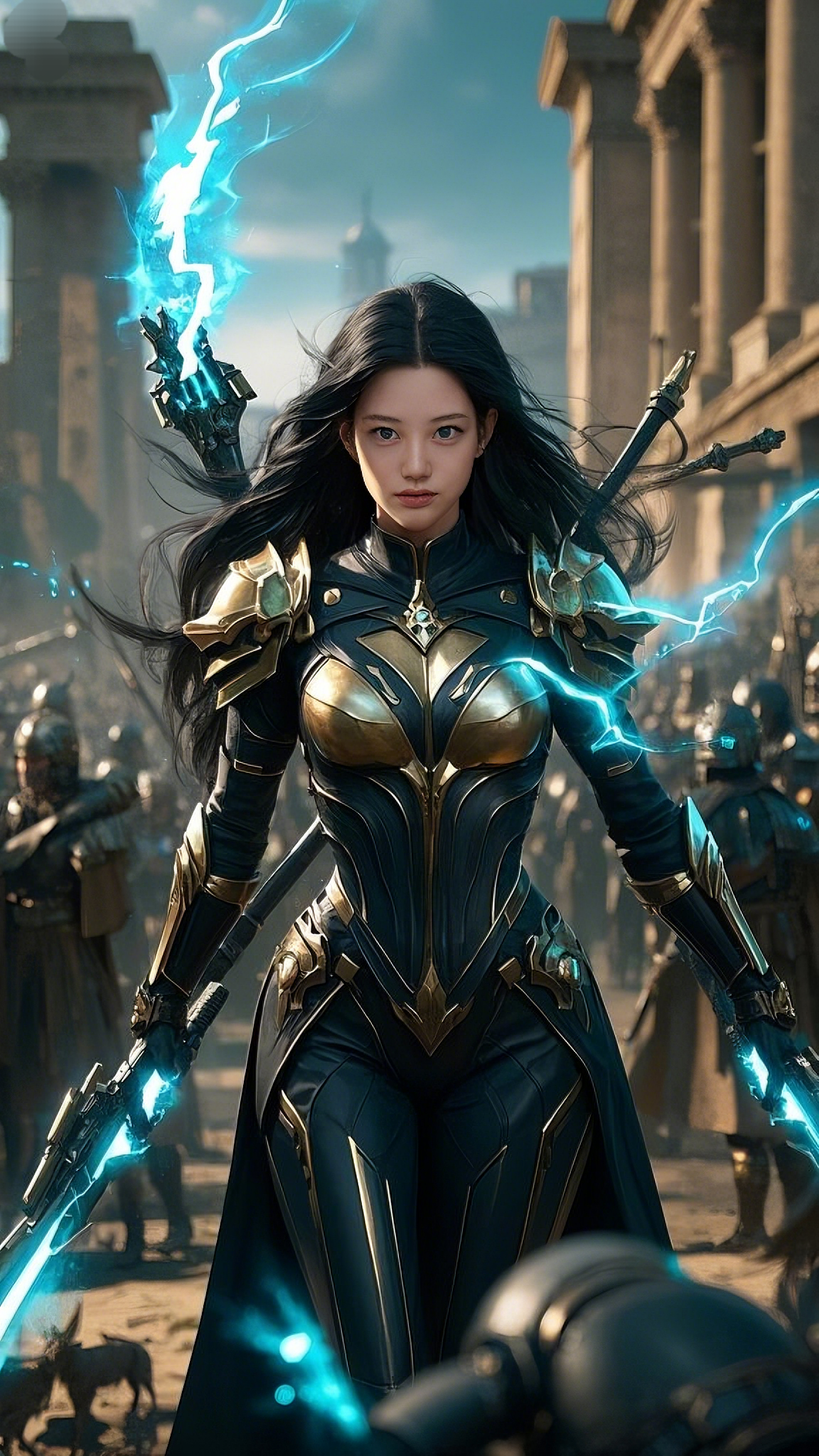 Her suit was unlike anything Rome had ever seen—a fusion of celestial armor and futuristic technology, woven with sleek black fabric and adorned with golden embellishments that shimmered in the sunlight. At her core, a pulsating blue energy source glowed with an otherworldly light, casting a celestial aura around her.