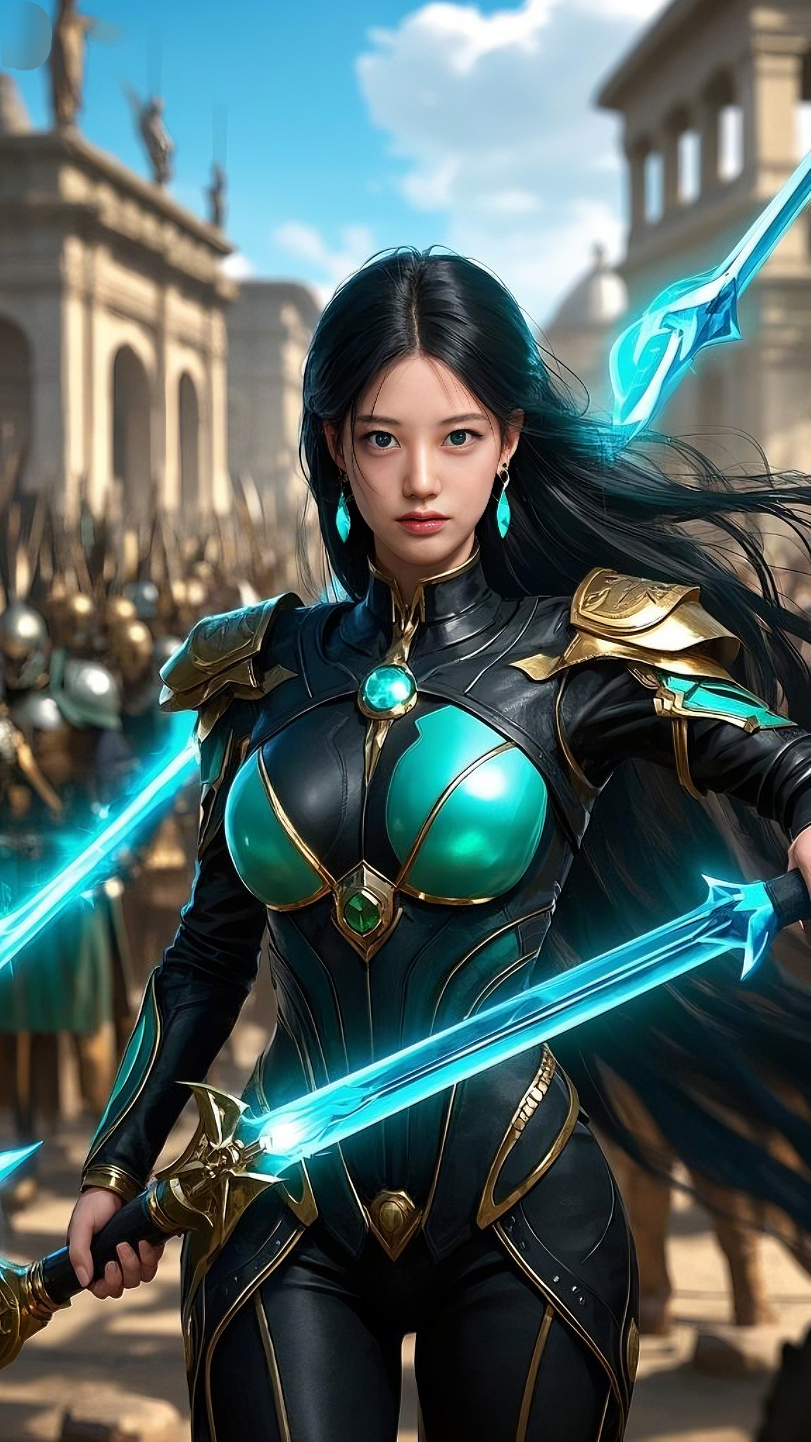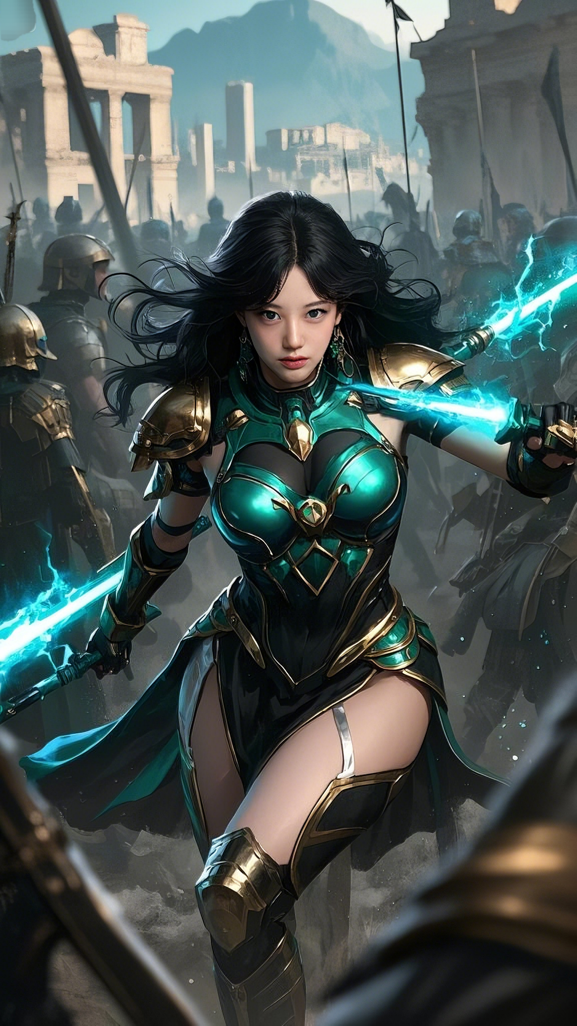 Twin blades of pure energy, forged from a civilization far beyond the stars, crackled in her grip. The weapons pulsed with a blue and emerald radiance, their light splitting through the smoke like the wrath of the gods themselves.