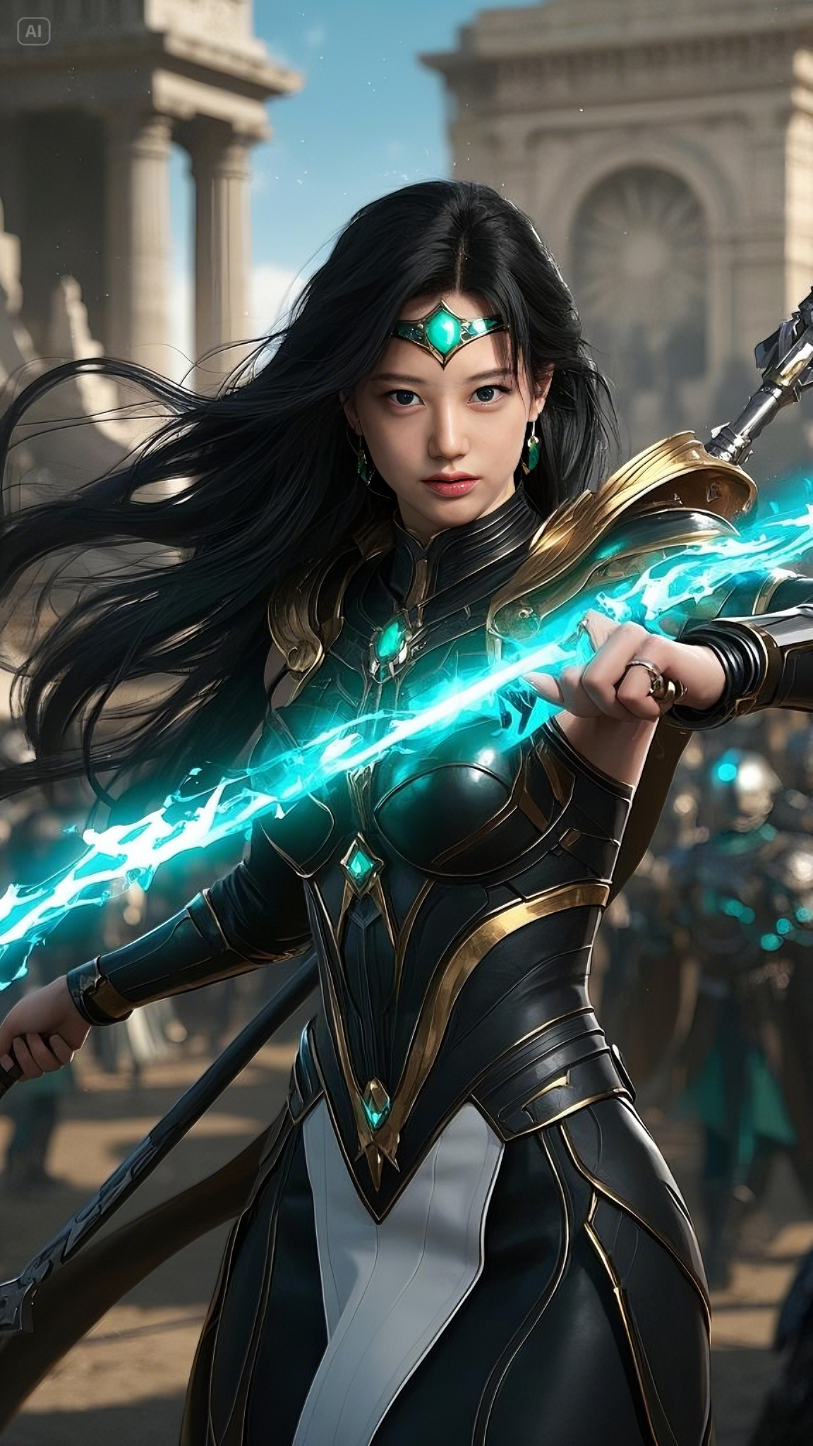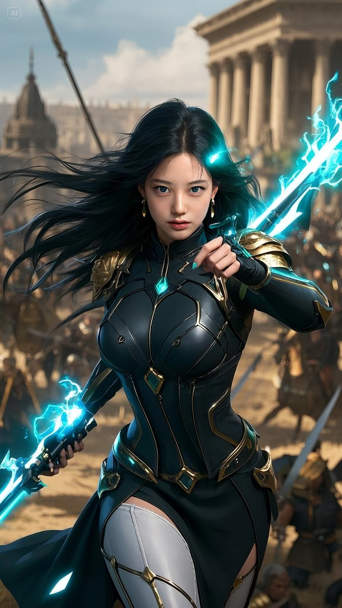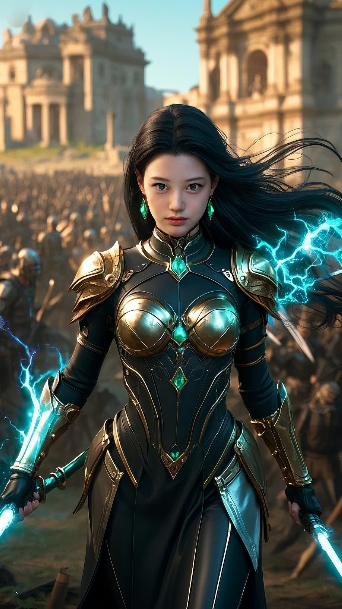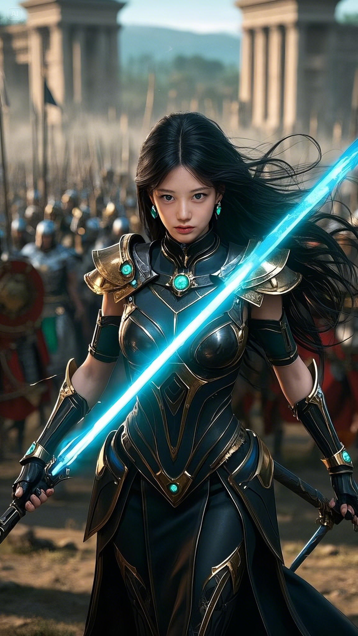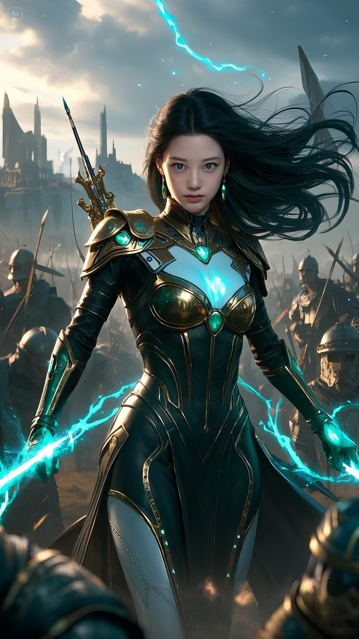 She walked forward with measured steps, her piercing emerald-blue eyes scanning the battlefield with unwavering intensity. Her long black hair, thick as the night itself, flowed behind her like an untamed river, strands dancing in the violent winds of war.