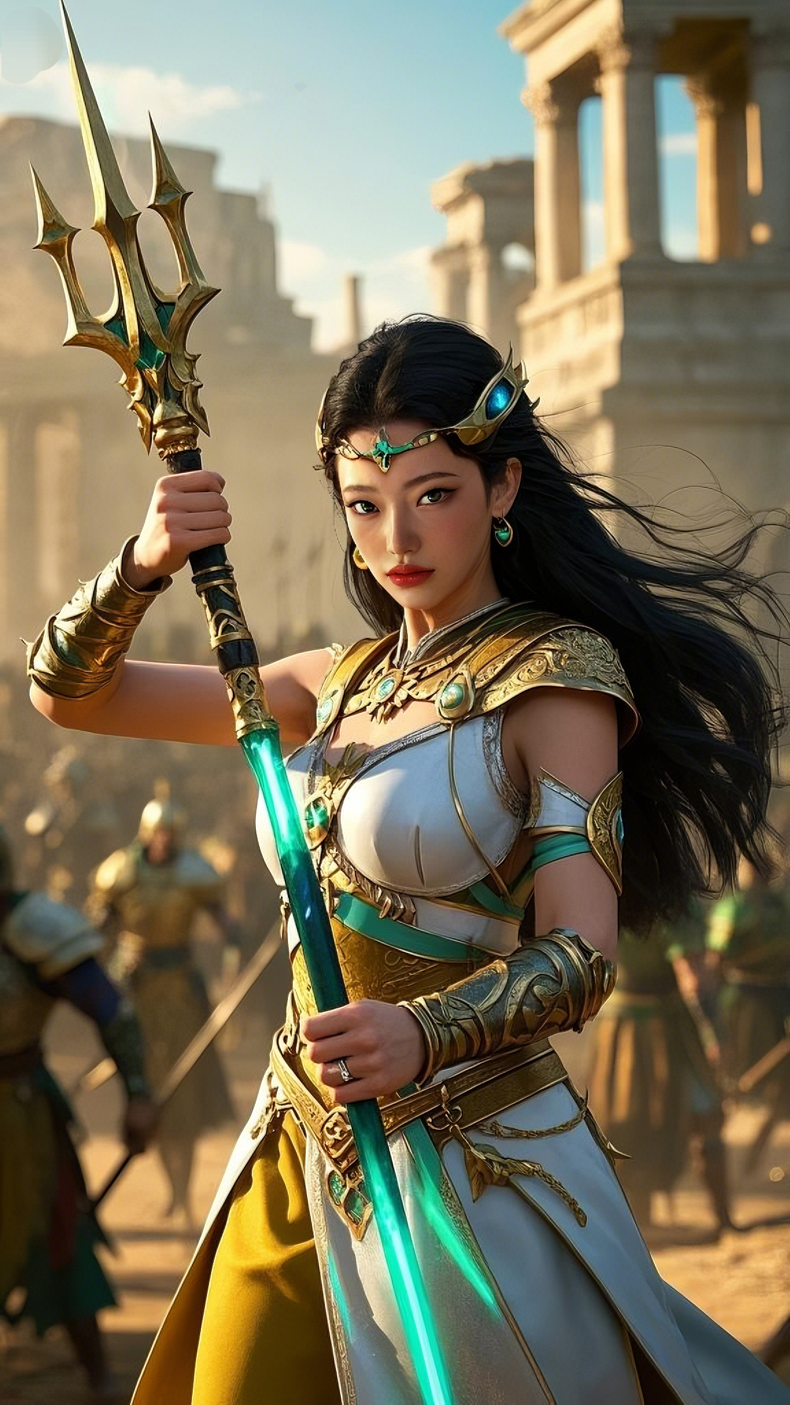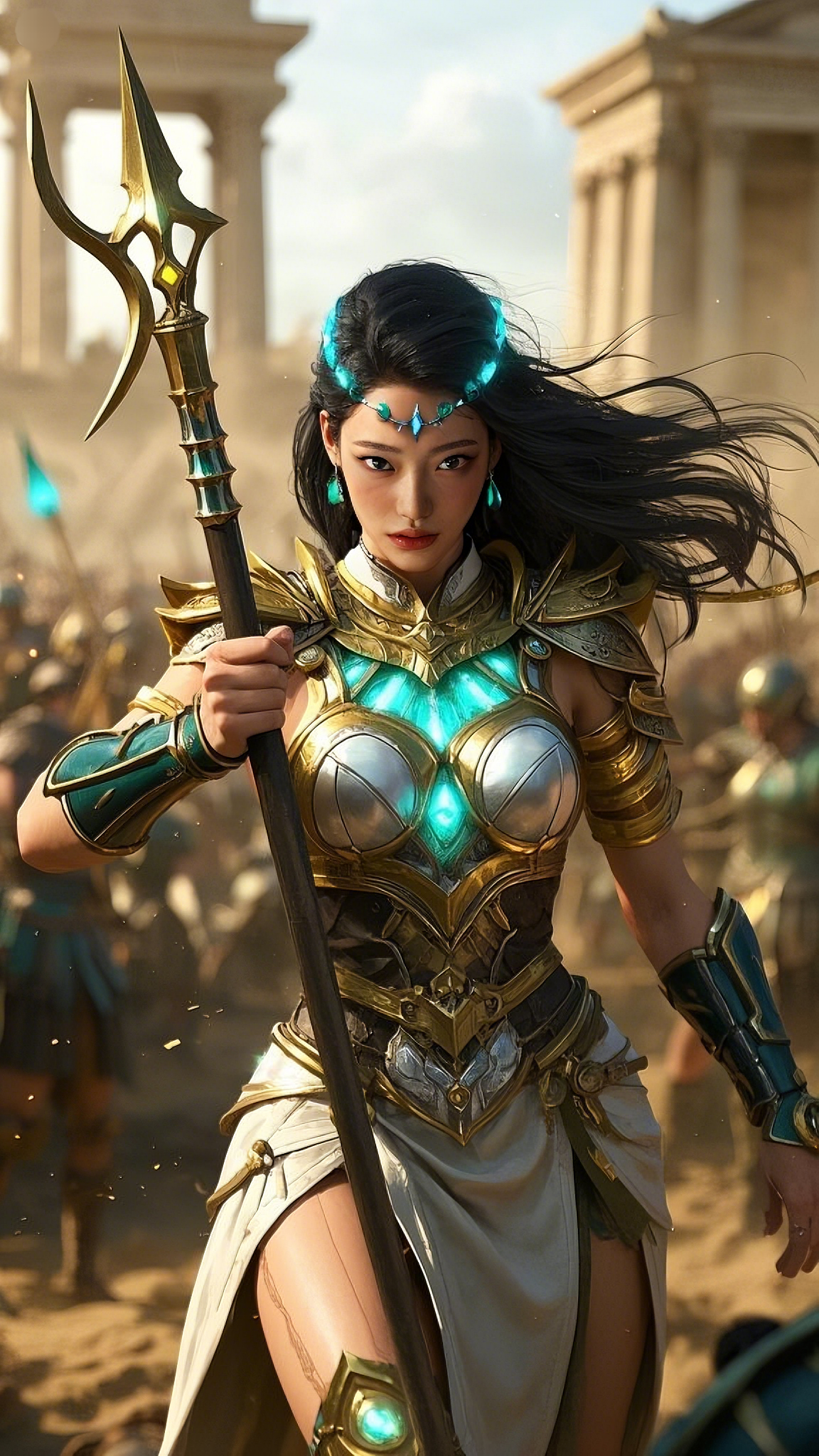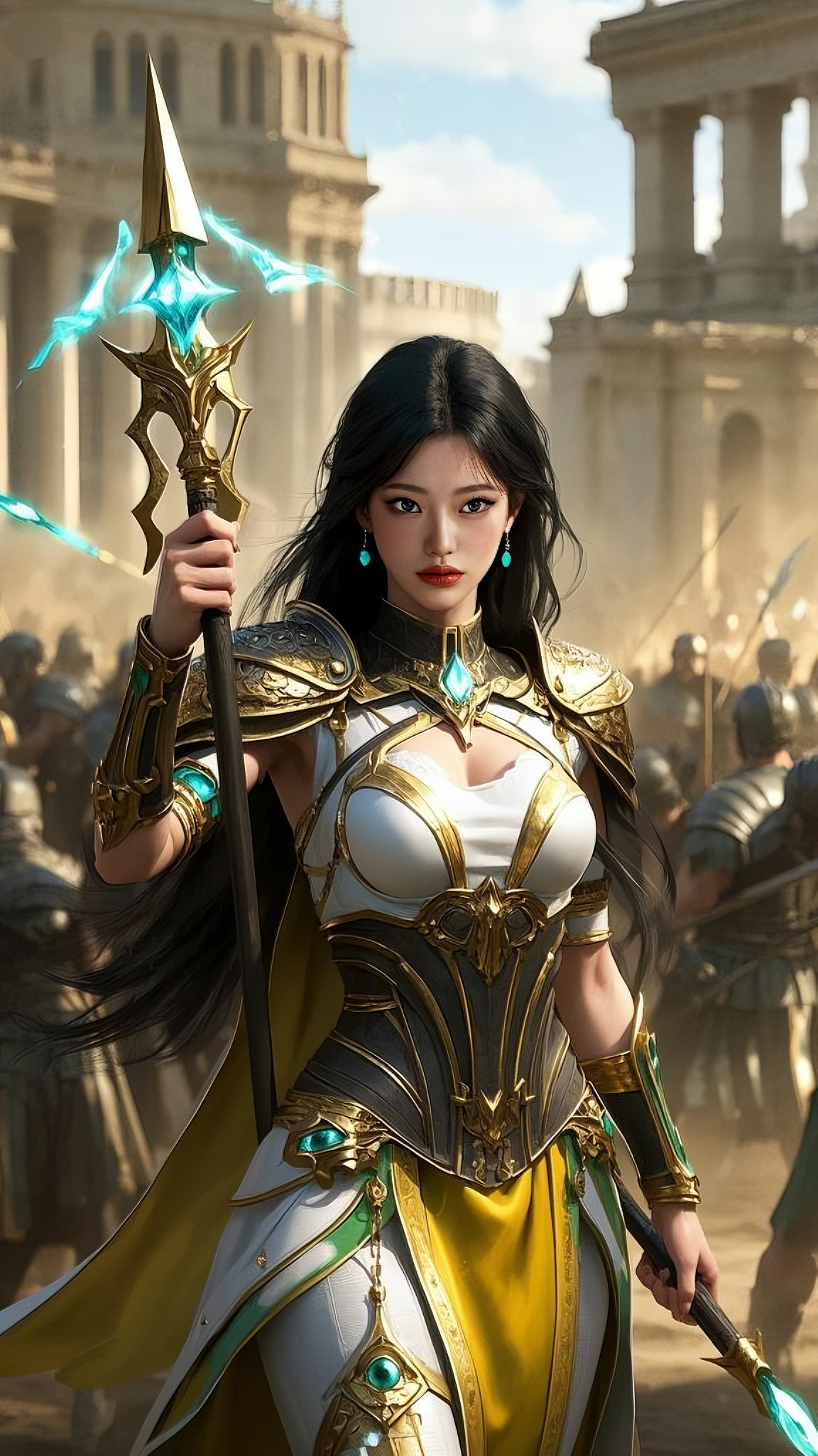 A squadron of enemy soldiers charged toward her, their swords raised high. She reacted in a blur of motion, faster than the human eye could track. With a graceful pivot, she brought her golden spear crashing down, releasing a shockwave of energy. The impact sent the nearest attackers flying, their armor crumbling under the force.