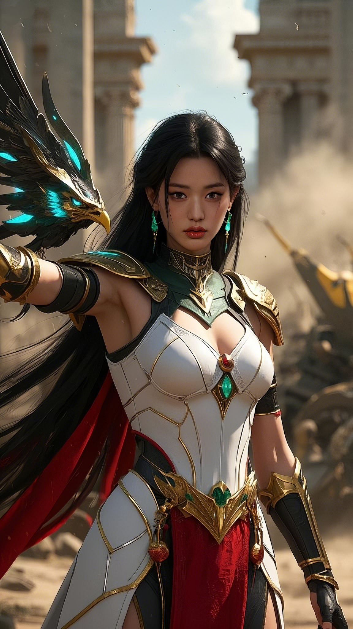 Her presence commanded the battlefield. Clad in a regal yet battle-hardened outfit of white, gold, and deep red, she was an image of both divinity and war. The intricate golden filigree on her armor shimmered with the radiance of the sunlight, reflecting her indomitable spirit. Her piercing emerald-blue eyes burned with an intensity that sent shivers through both allies and enemies alike.