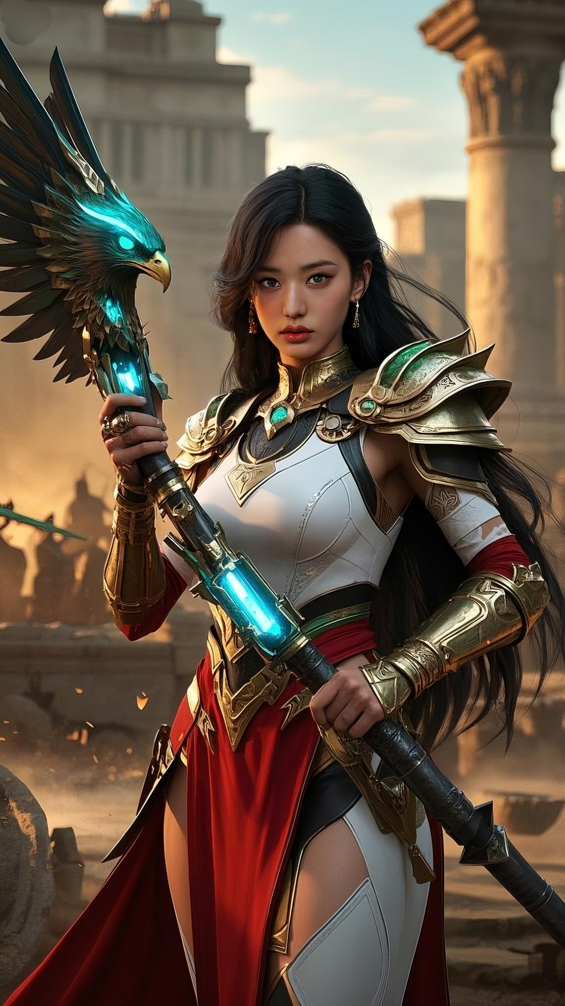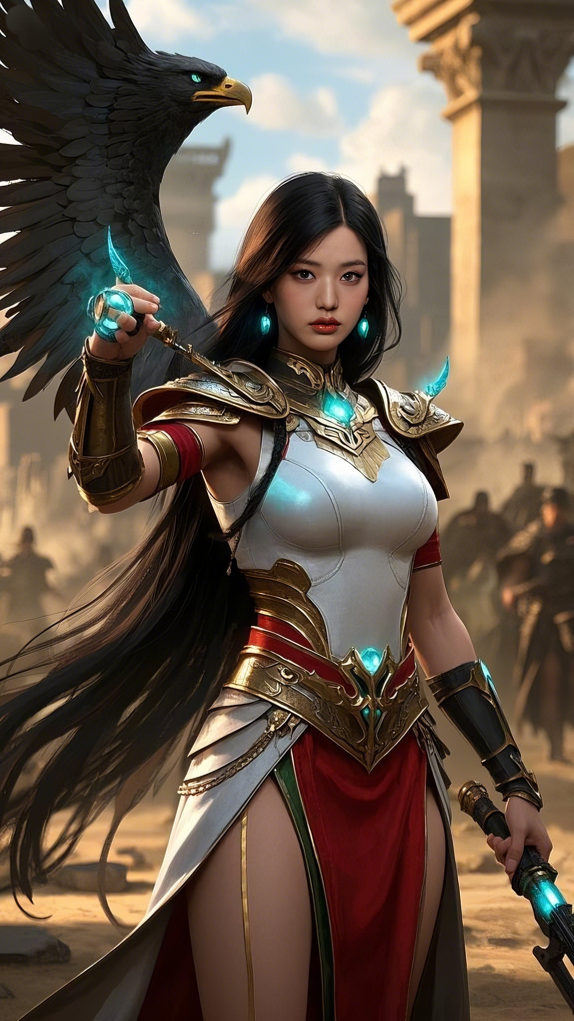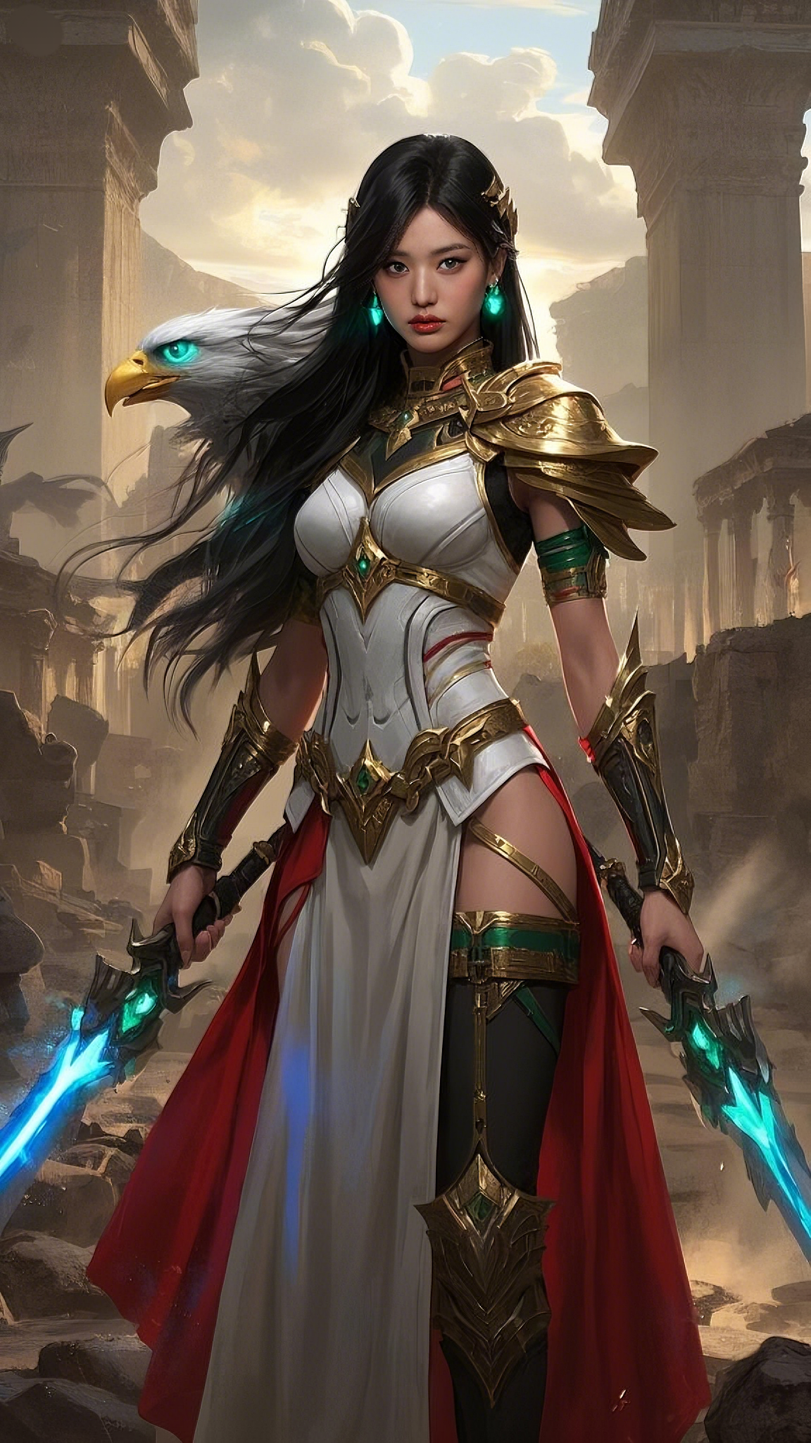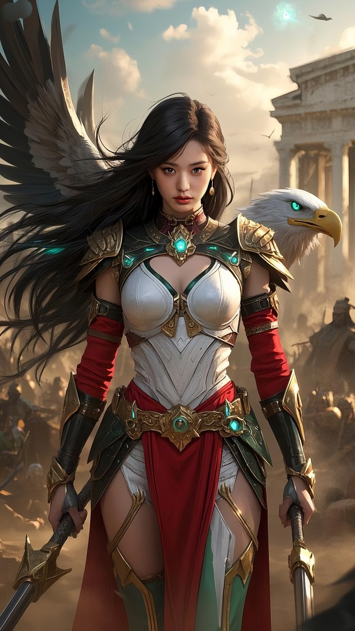 Resting on her shoulder was a majestic eagle, its piercing gaze mirroring hers. Its golden feathers shimmered with an almost supernatural glow, and from its eyes, golden beams of energy pulsed, illuminating the battlefield like the wrath of a forgotten deity. The eagle was not merely her companion—it was an extension of her will, a weapon of unparalleled precision.