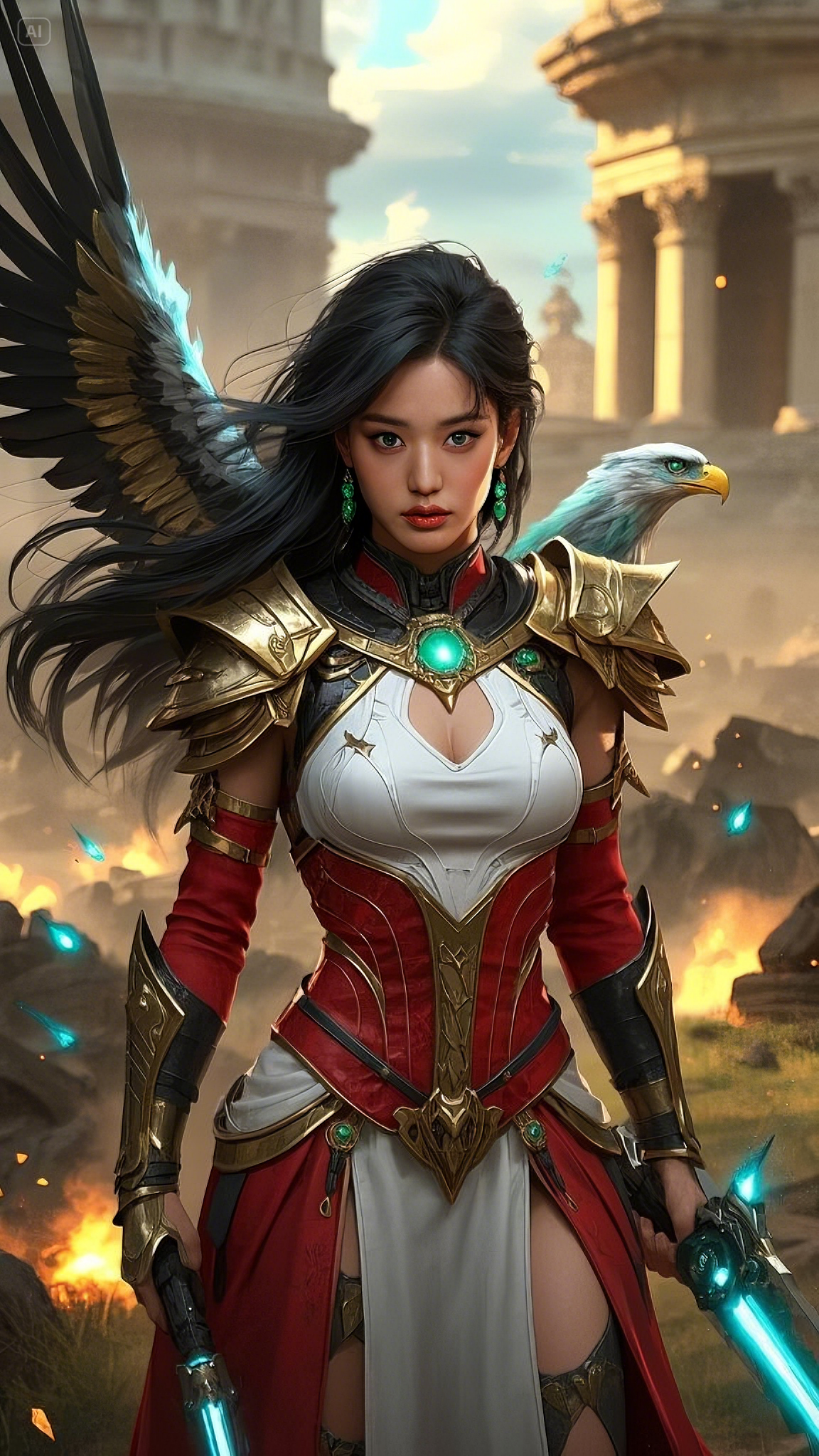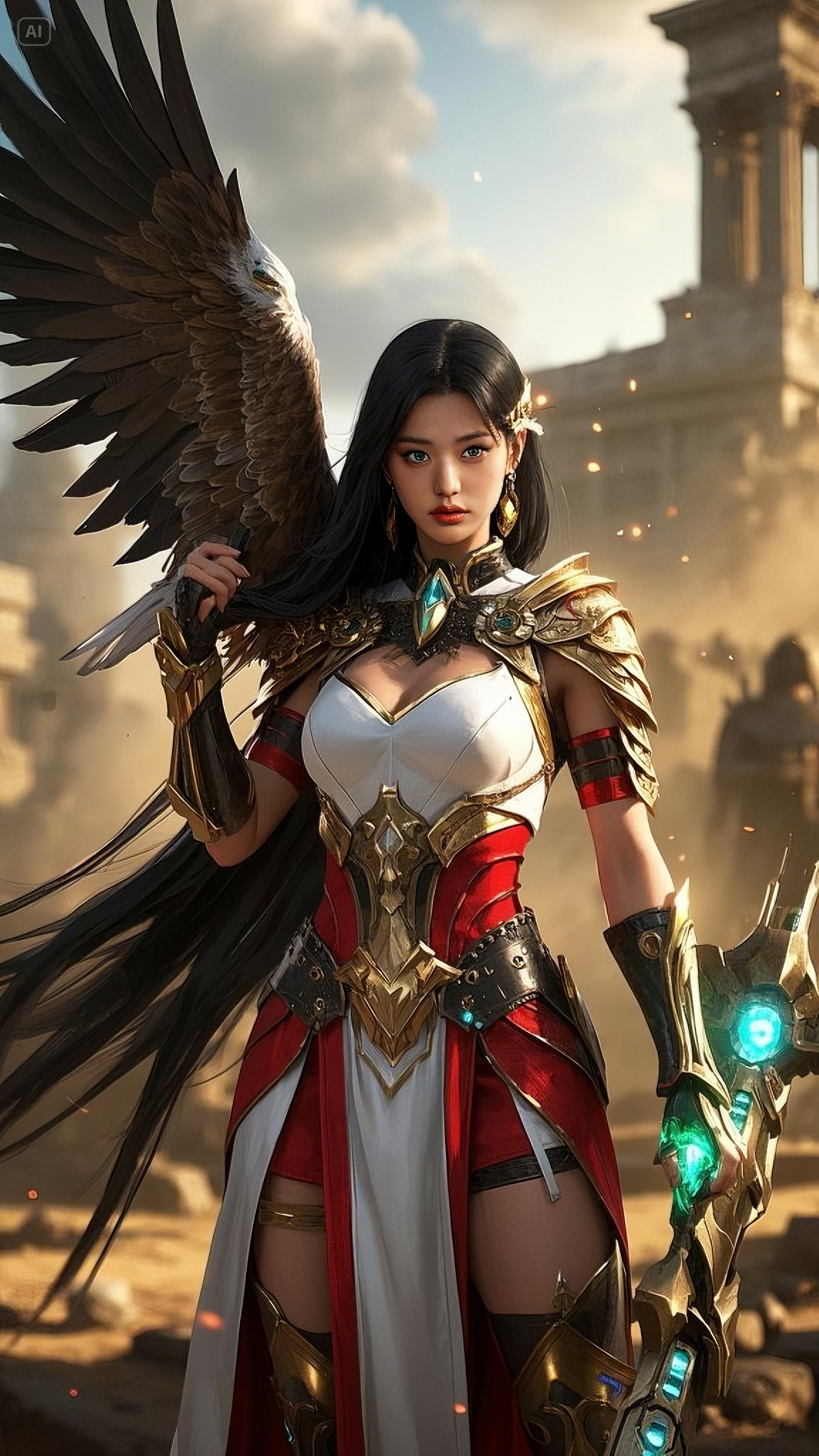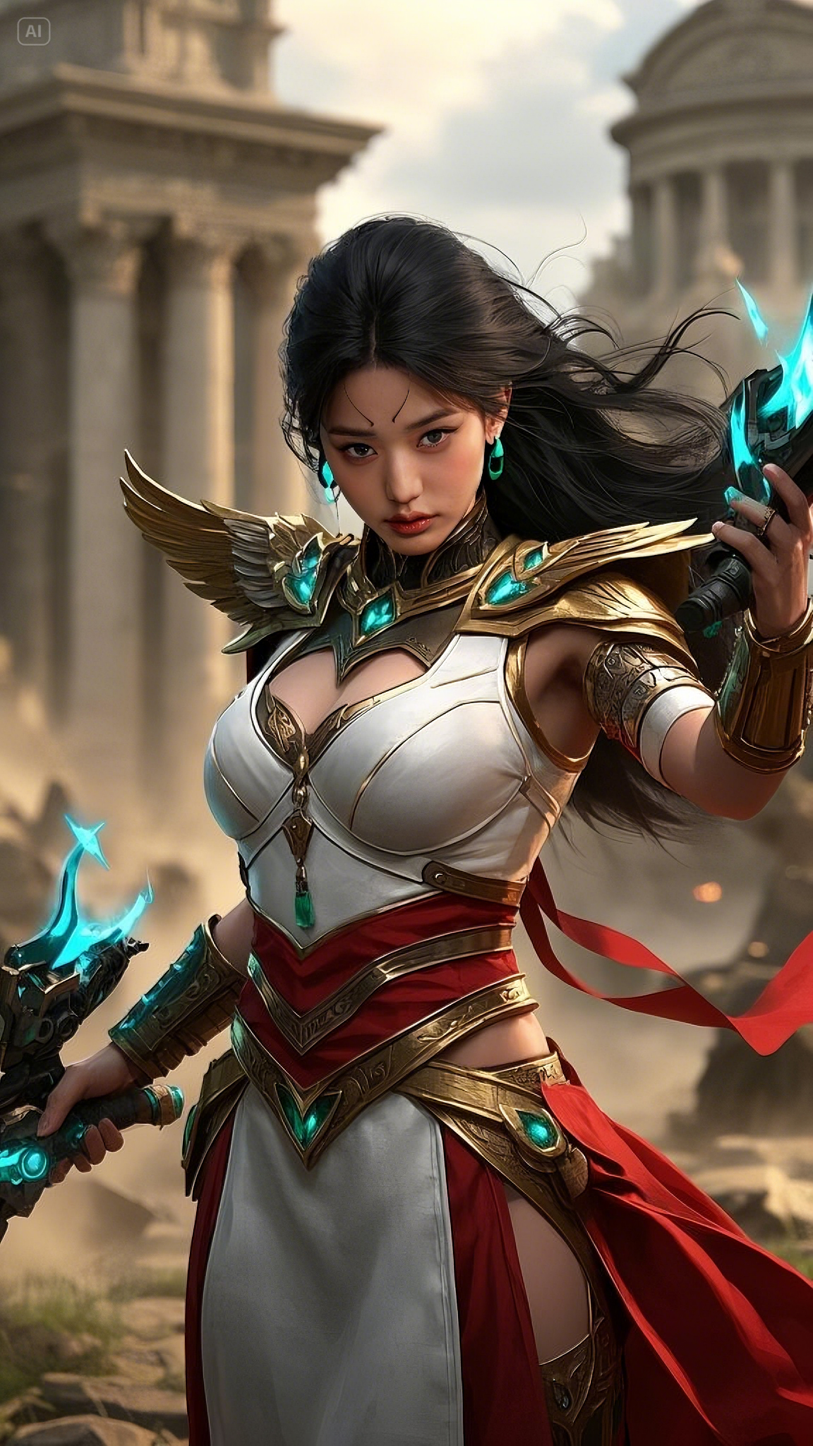 Clad in a breathtaking ensemble of white, gold, and crimson, she moved like a goddess of war, untouchable and unwavering. Her armor, a fusion of ancient craftsmanship and futuristic design, shimmered in the sunlight, adorned with glowing emerald gemstones that pulsed with energy. Golden wing-shaped pauldrons adorned her shoulders, a symbol of her dominion over the battlefield.