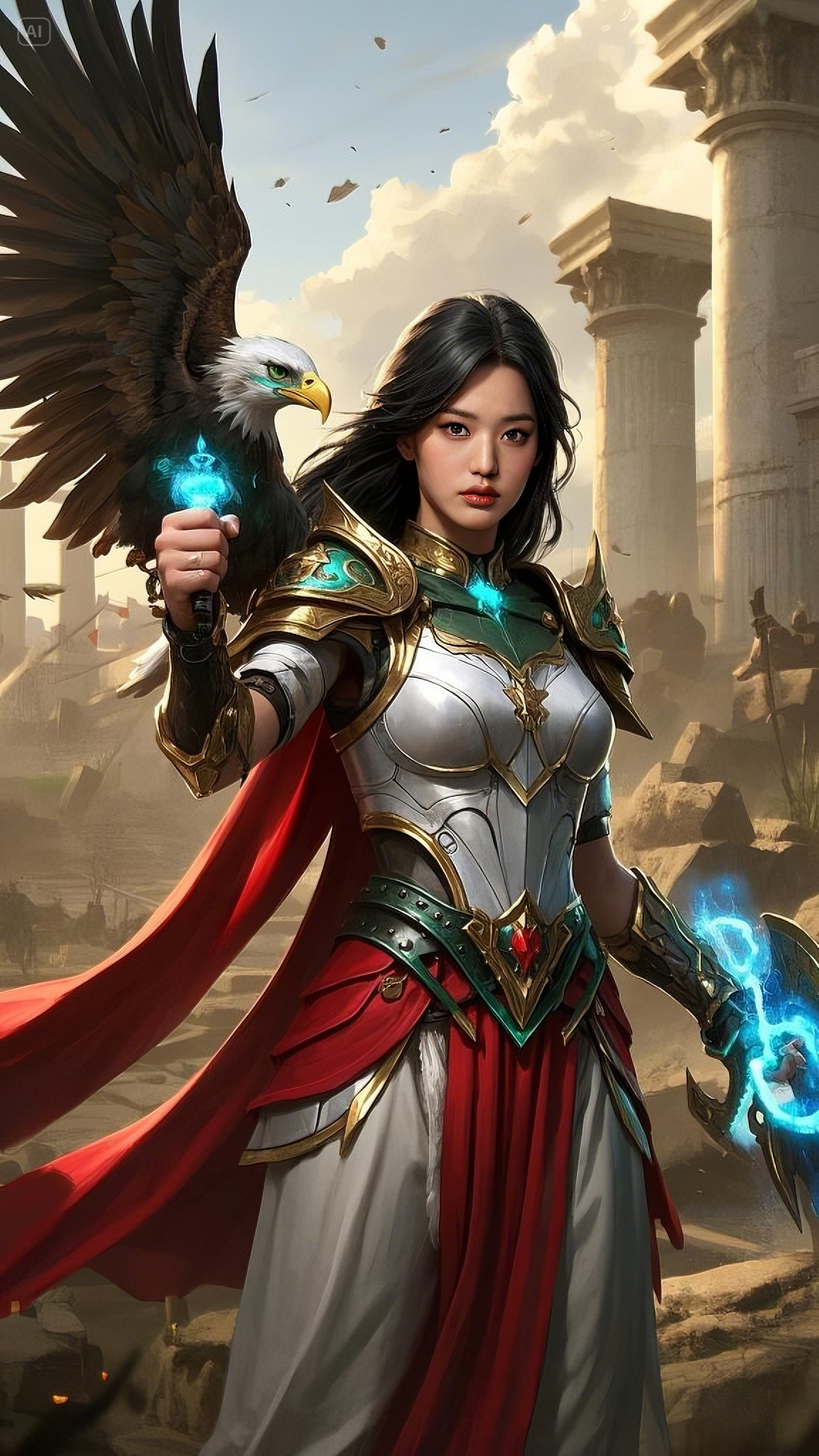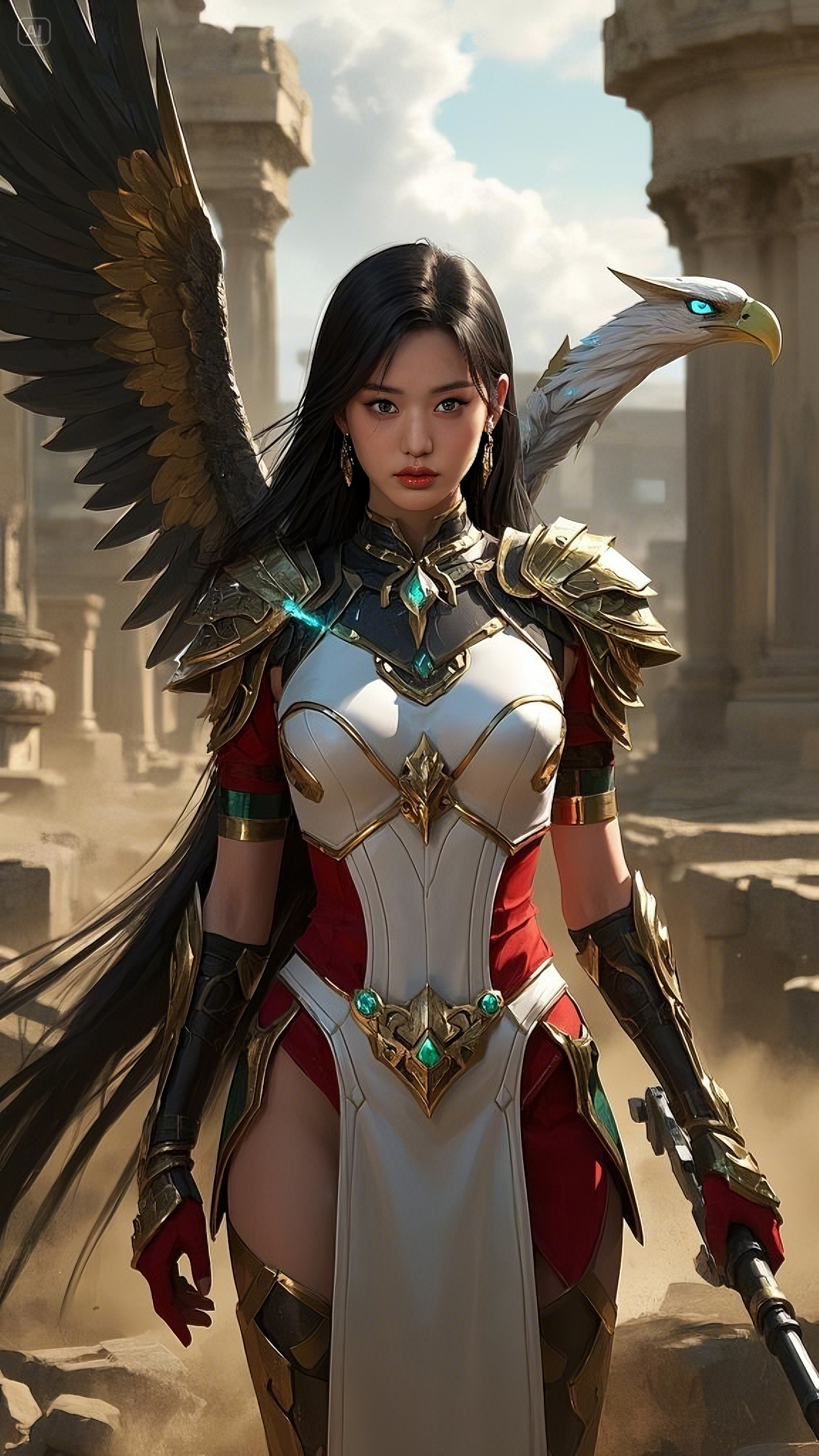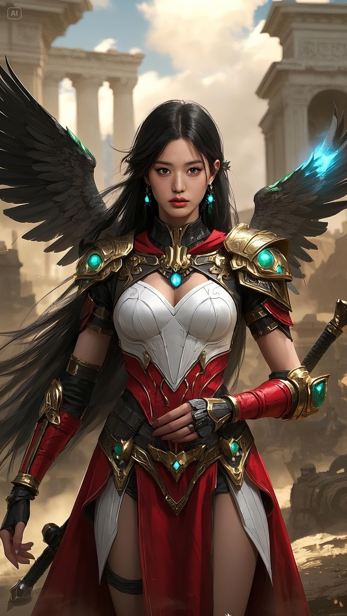Clad in a breathtaking ensemble of white, gold, and crimson, she moved like a goddess of war, untouchable and unwavering. Her armor, a fusion of ancient craftsmanship and futuristic design, shimmered in the sunlight, adorned with glowing emerald gemstones that pulsed with energy. Golden wing-shaped pauldrons adorned her shoulders, a symbol of her dominion over the battlefield.