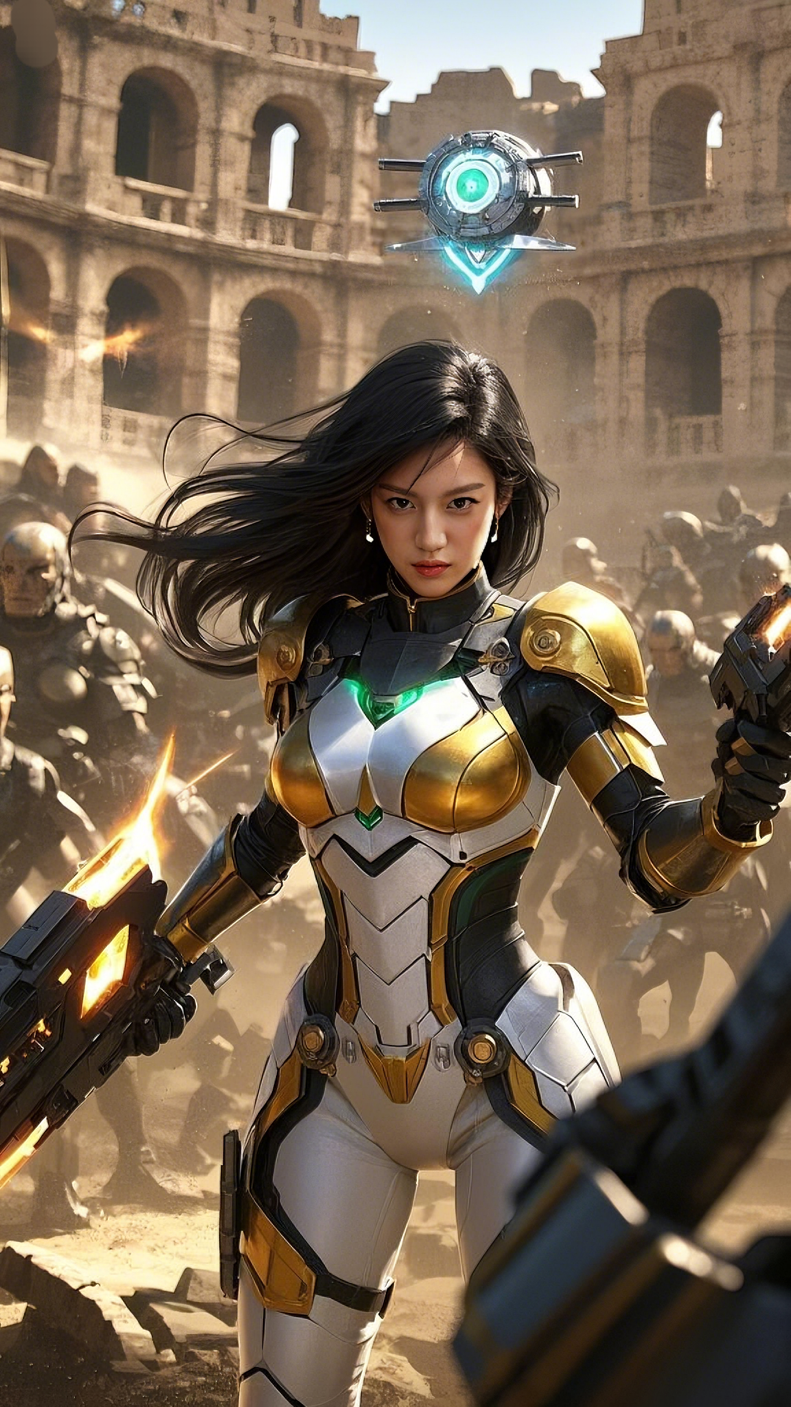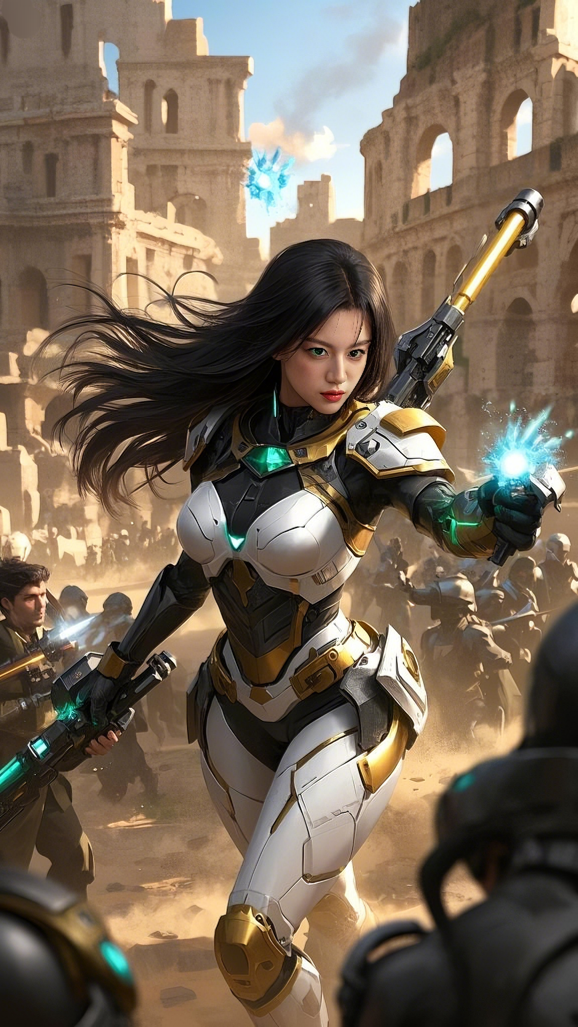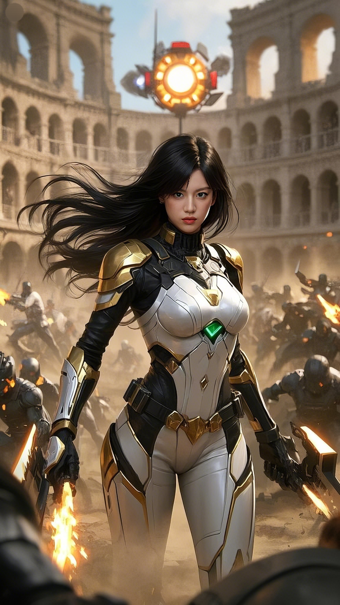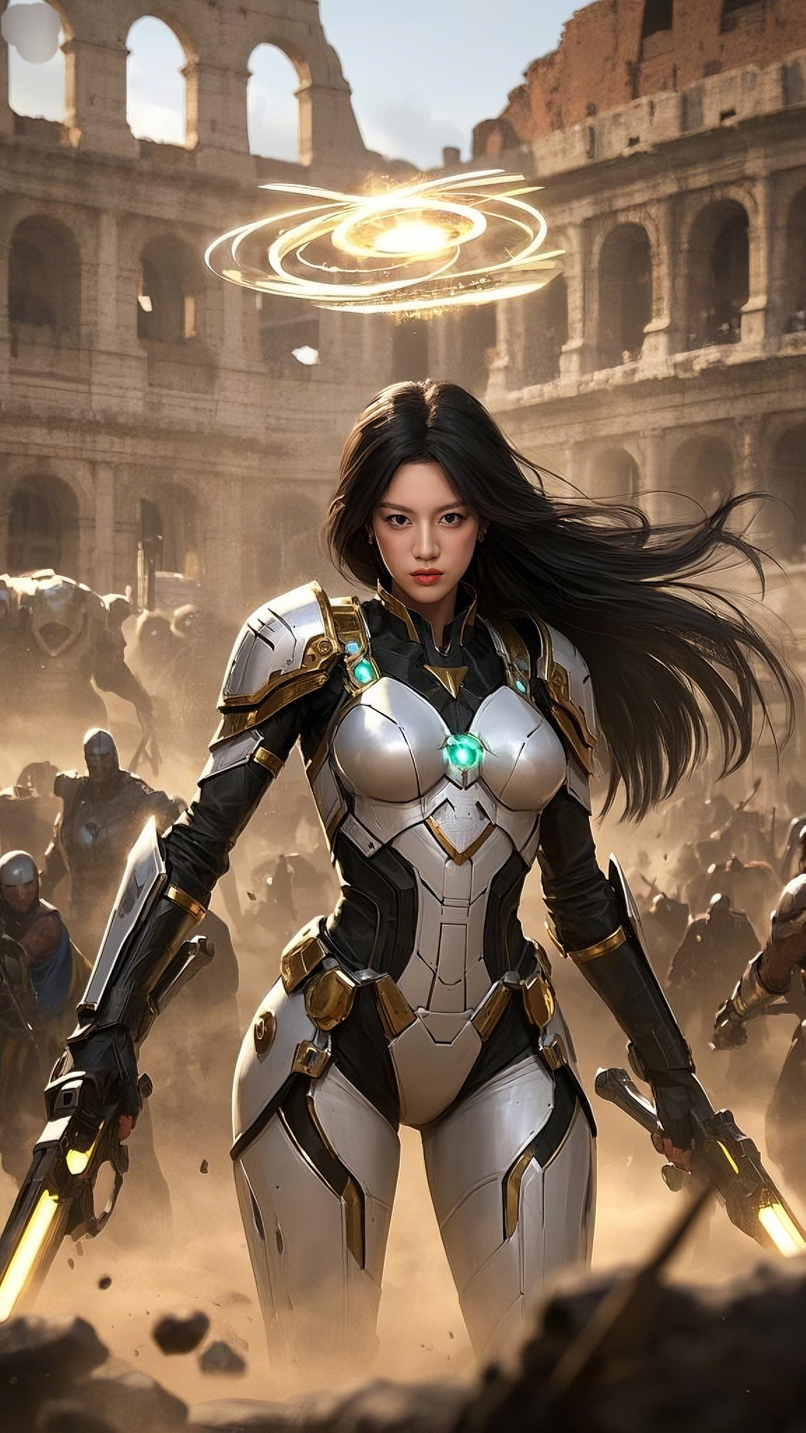 The enemy forces advanced, their armor gleaming under the broken arches of the Colosseum, their mechanical limbs moving in unison. They were warriors of the 5000s—trained, relentless, and programmed for victory. But they had never faced her before.