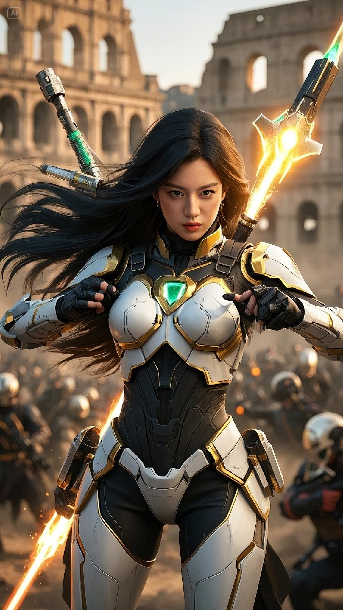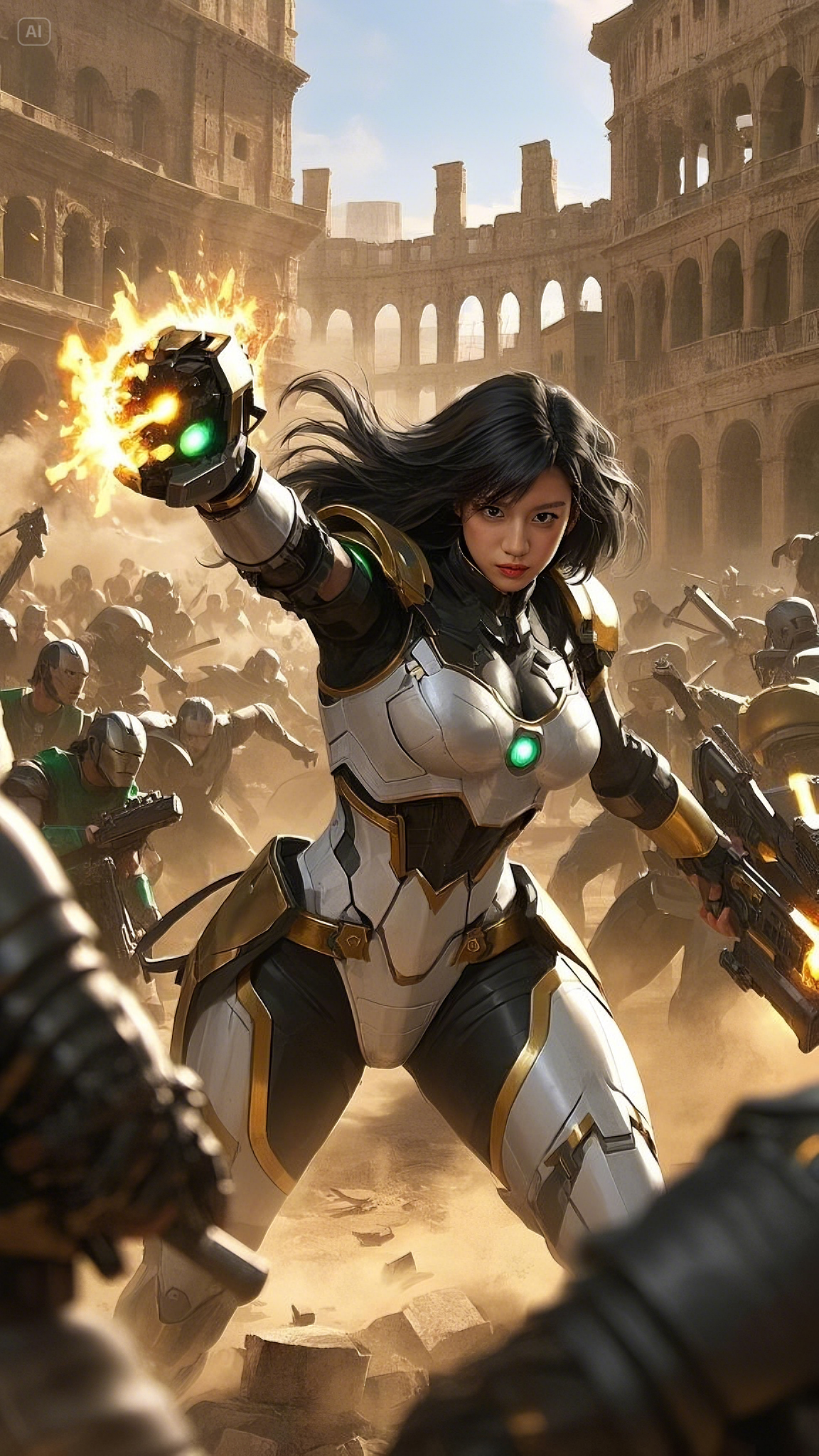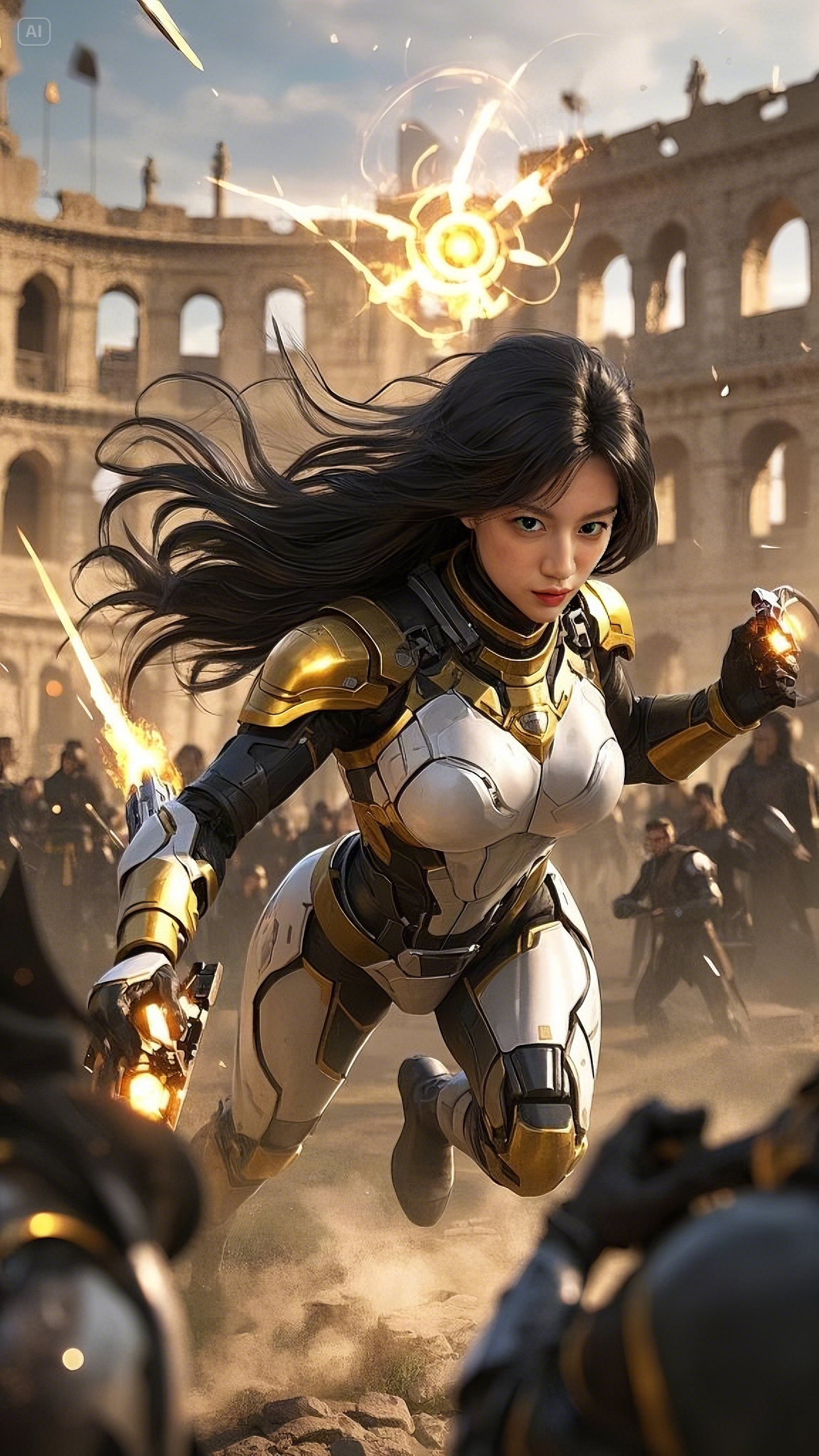 In a flash, her arms ignited with golden arc beams, twin streams of searing plasma bursting from her palms like divine fire. She didn’t hesitate—she sliced through the ranks, cutting down soldiers as if they were nothing. Each blast of energy sent shockwaves rippling through the Colosseum, tearing apart stone and metal alike.