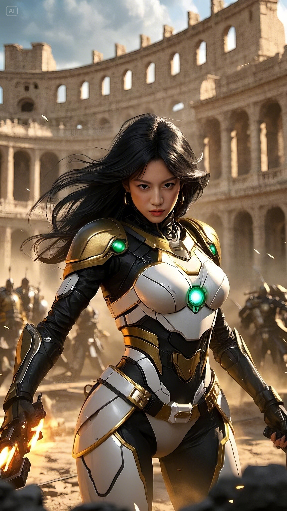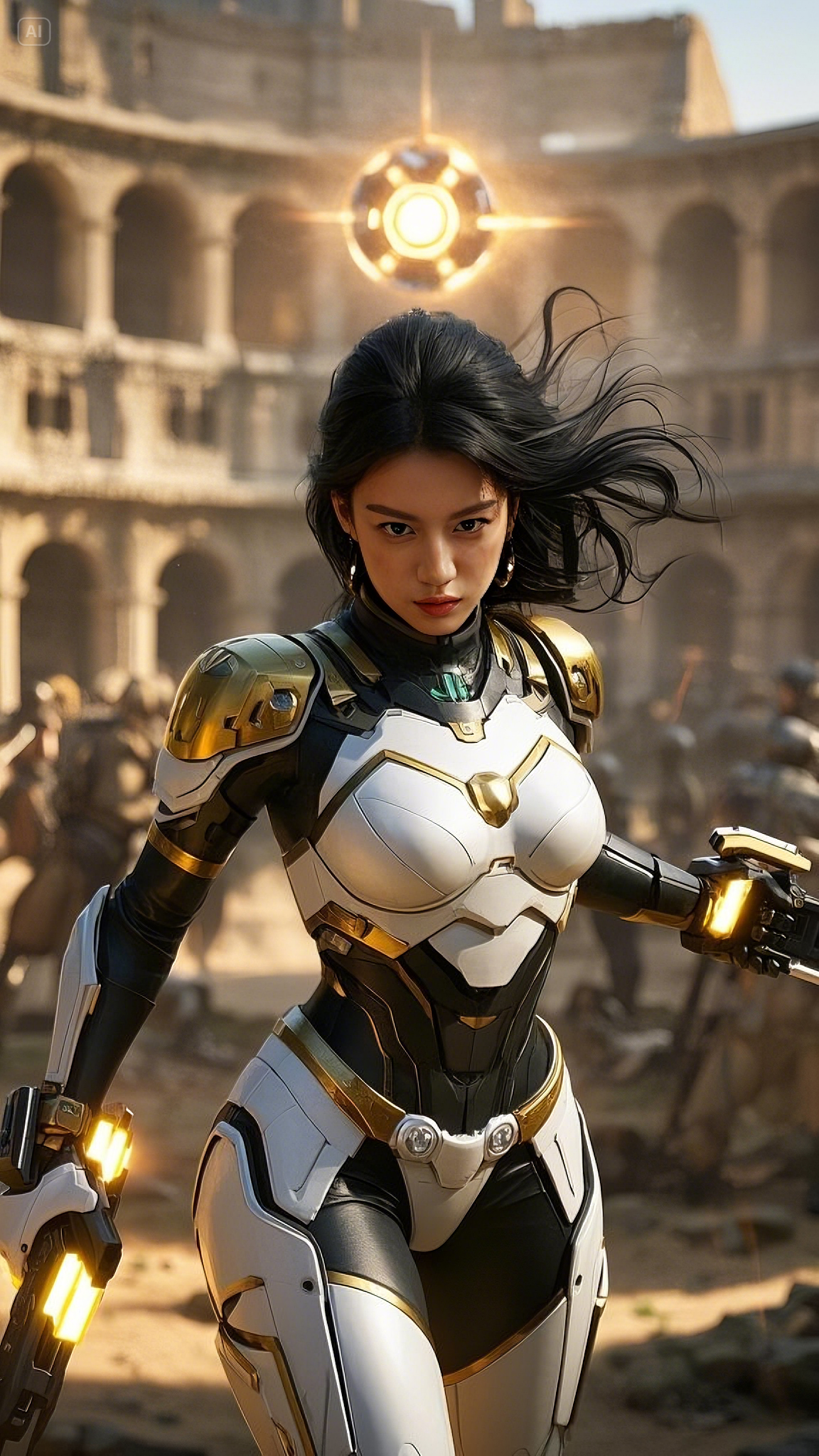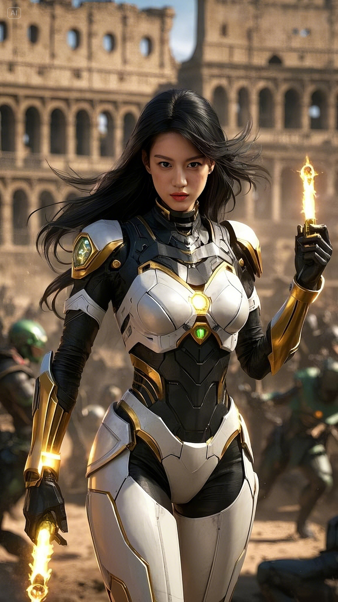 In a flash, her arms ignited with golden arc beams, twin streams of searing plasma bursting from her palms like divine fire. She didn’t hesitate—she sliced through the ranks, cutting down soldiers as if they were nothing. Each blast of energy sent shockwaves rippling through the Colosseum, tearing apart stone and metal alike.