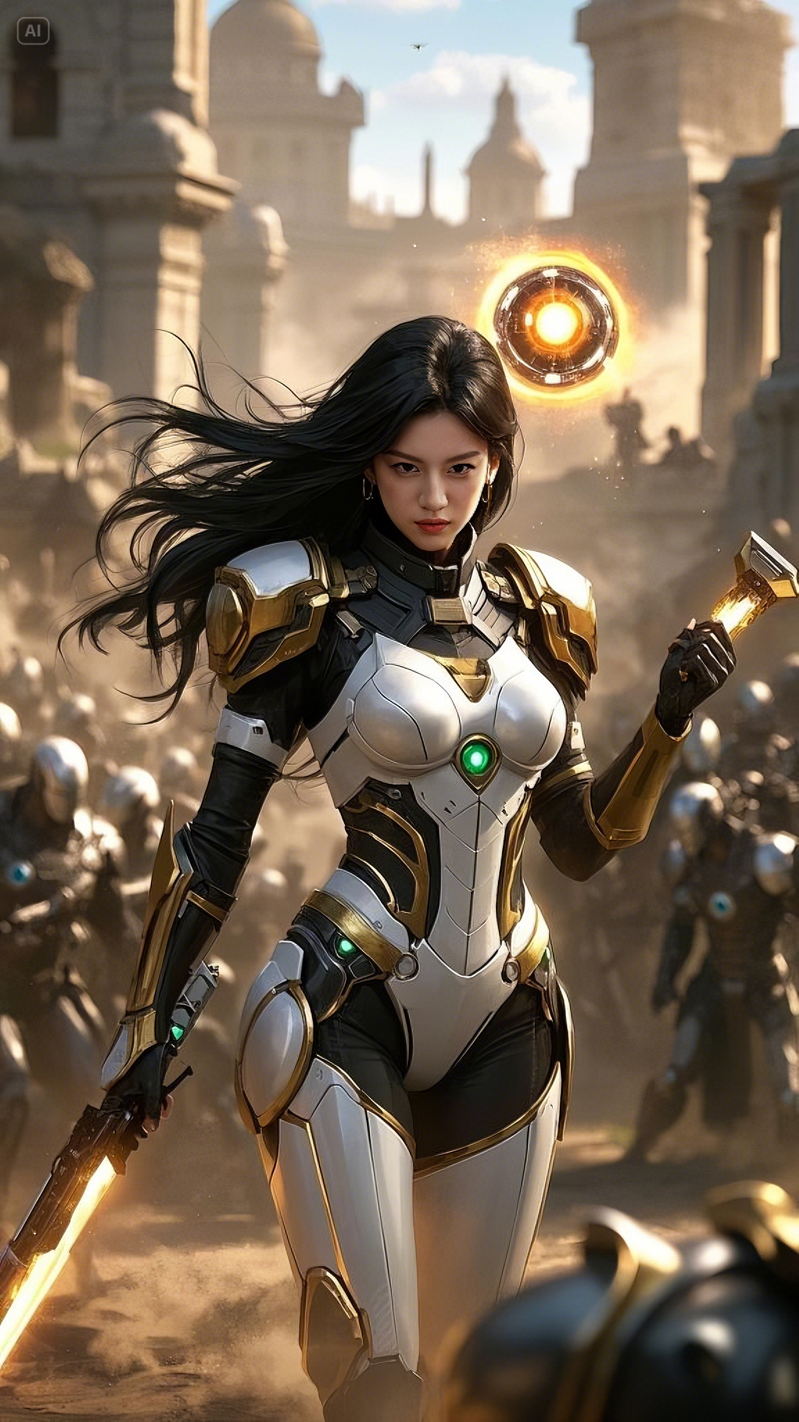 She was no mere soldier. Clad in a sleek, futuristic combat suit of black, gold, and white, she was an unstoppable force, an avatar of war forged in the fires of the 5000s. Every inch of her armor pulsed with power, advanced plating reinforced with energy nodes that glowed with an otherworldly brilliance. The gold in her armor wasn’t just for show—it was the channel for the raw, untamed arc energy that coursed through her veins.