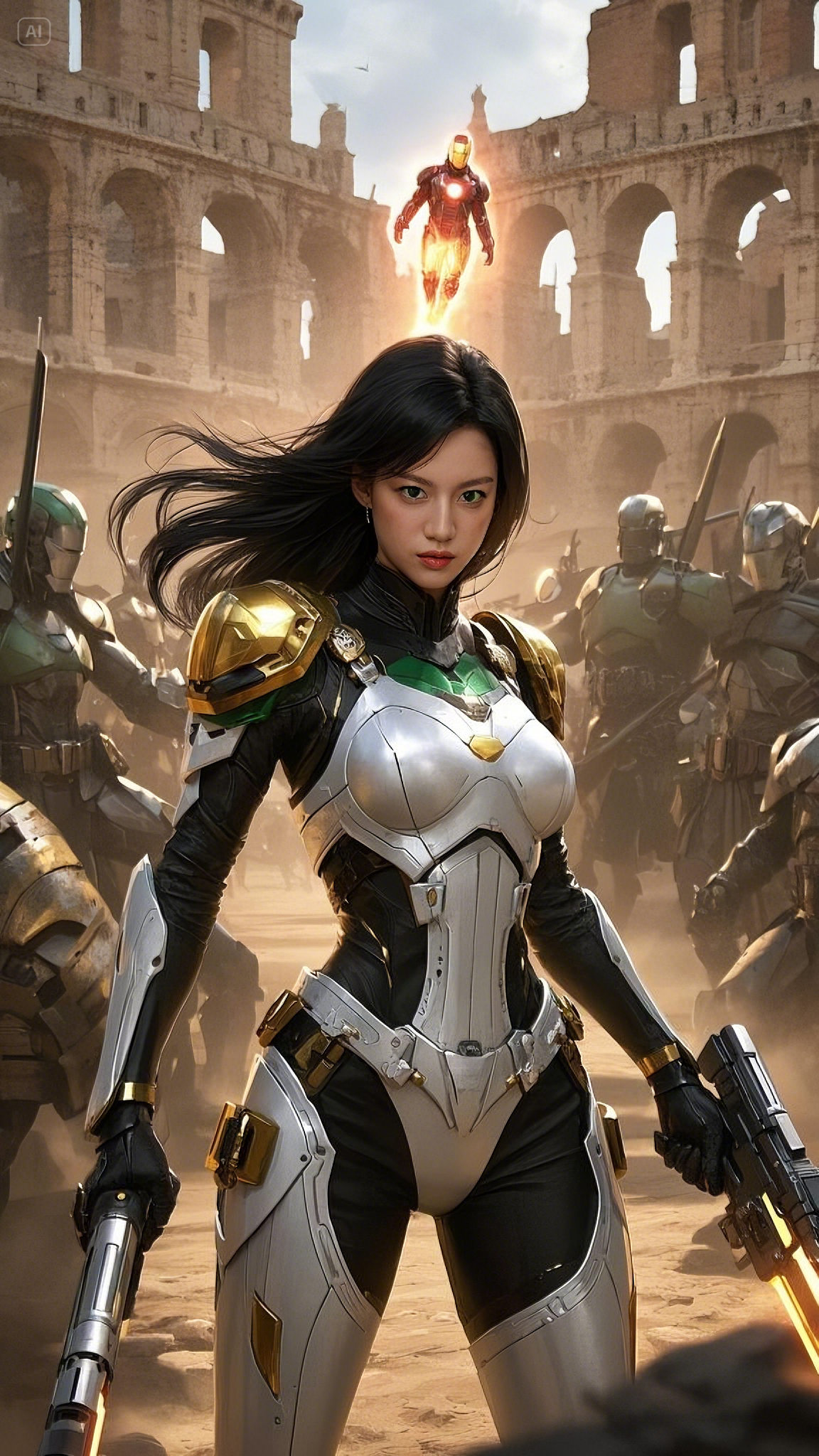 The Colosseum had not seen war for millennia. Once a place of gladiators and emperors, it was now the backdrop for a battle beyond history’s comprehension. Dust and fire filled the air, the golden light of the sun reflecting off the shattered ruins. The echoes of battle, the clash of metal, and the roar of energy weapons merged into a chaotic symphony of destruction.