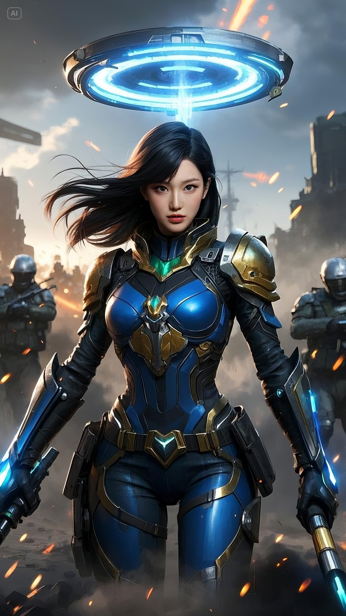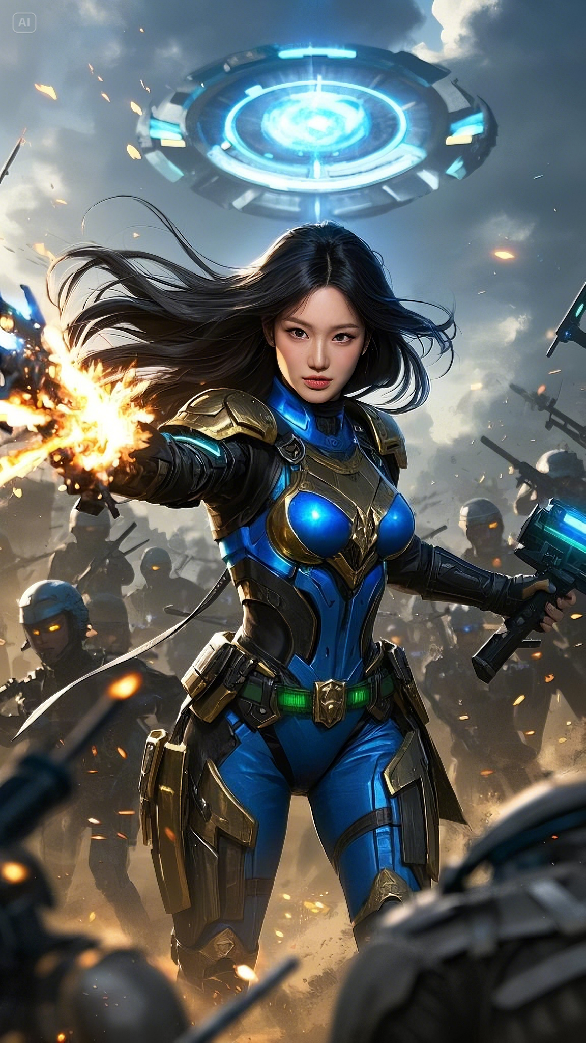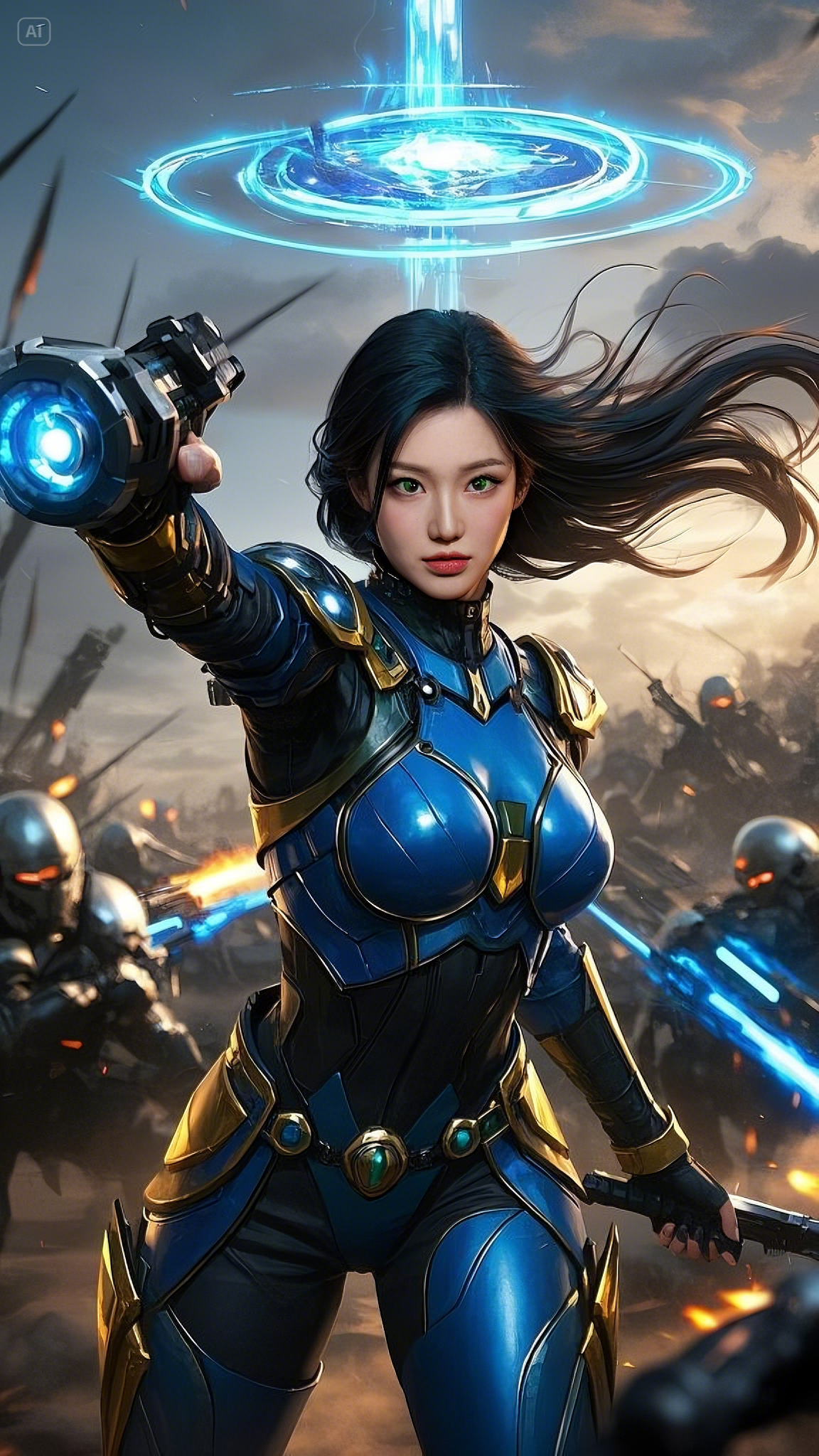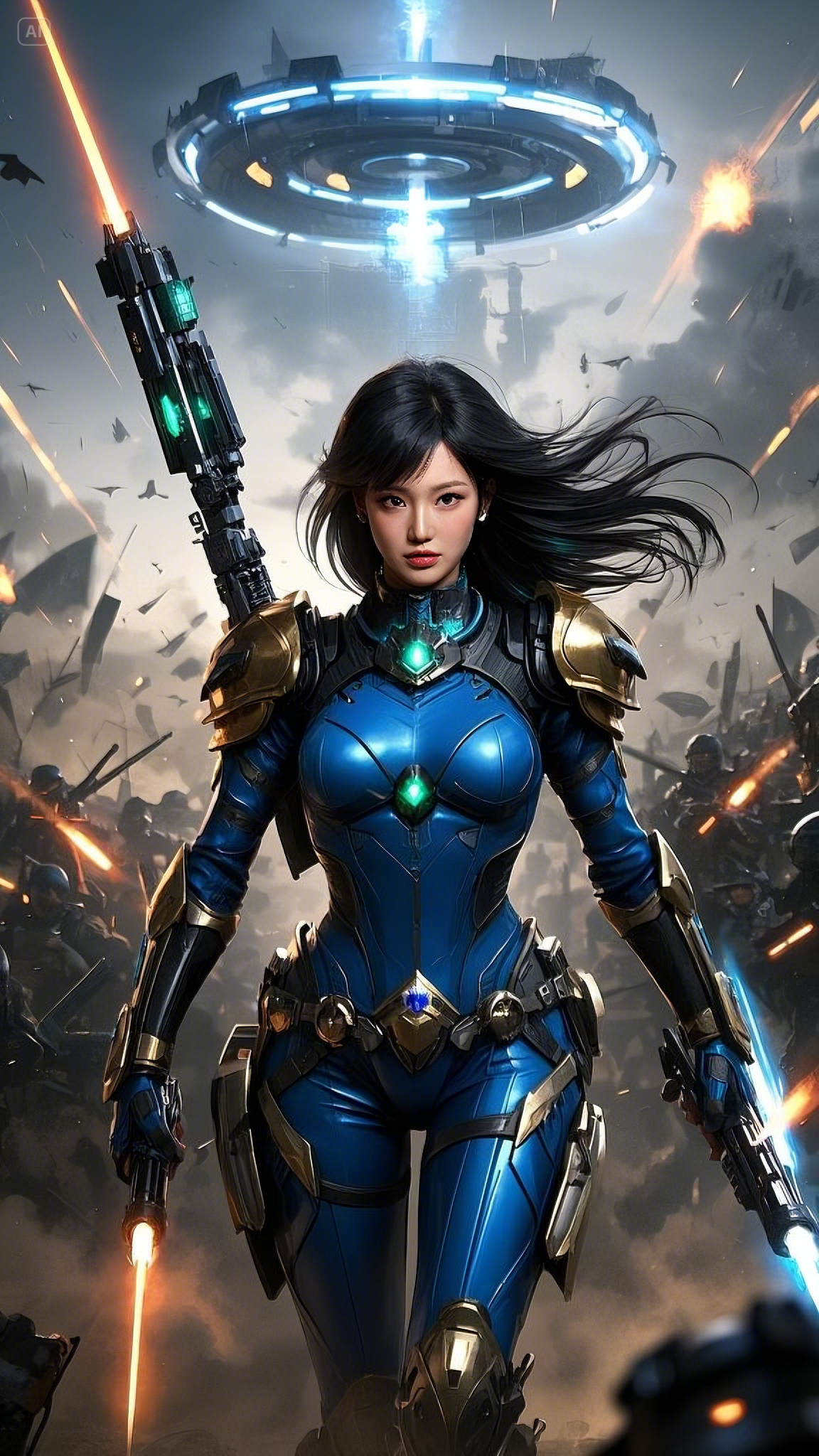 Clad in a sleek, high-tech combat suit of deep blue, gold, and black, she strode fearlessly across the battlefield, her movements exuding both grace and deadly precision. Her form-fitting armor was not just protection—it was a conduit for energy, a fusion of technology and raw power. Embedded in her chest, a glowing emerald core pulsed with every breath she took, feeding power into her suit and weapons.