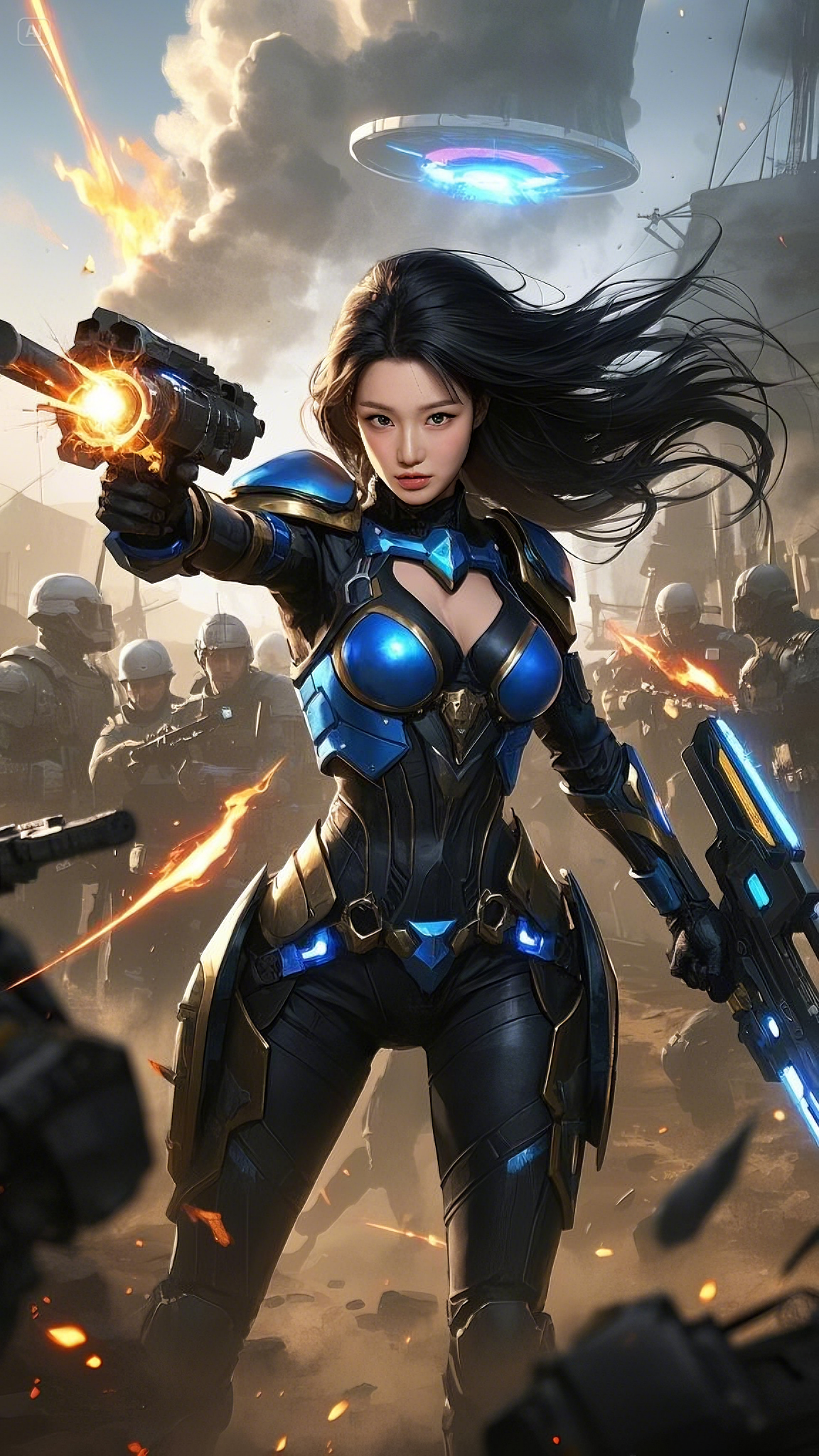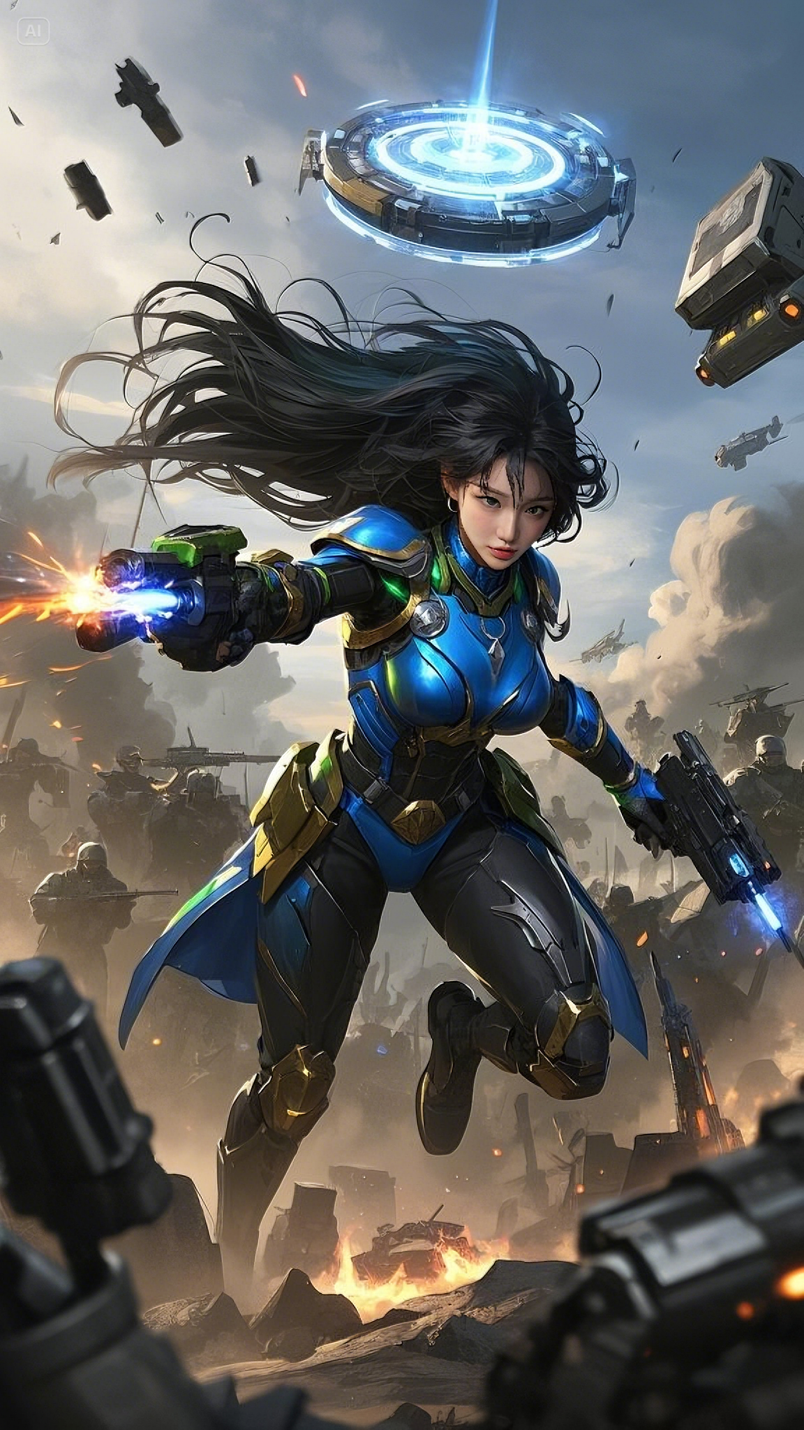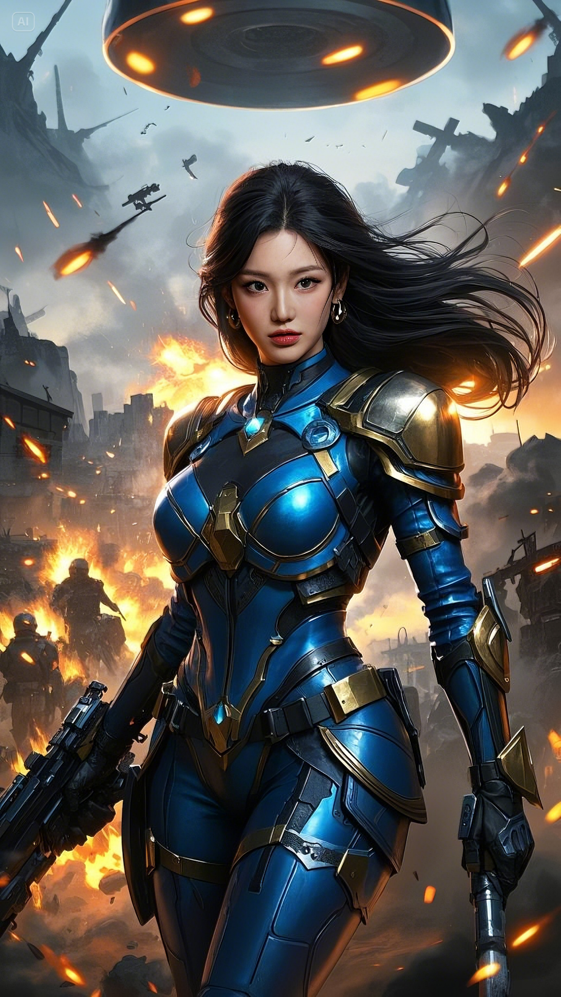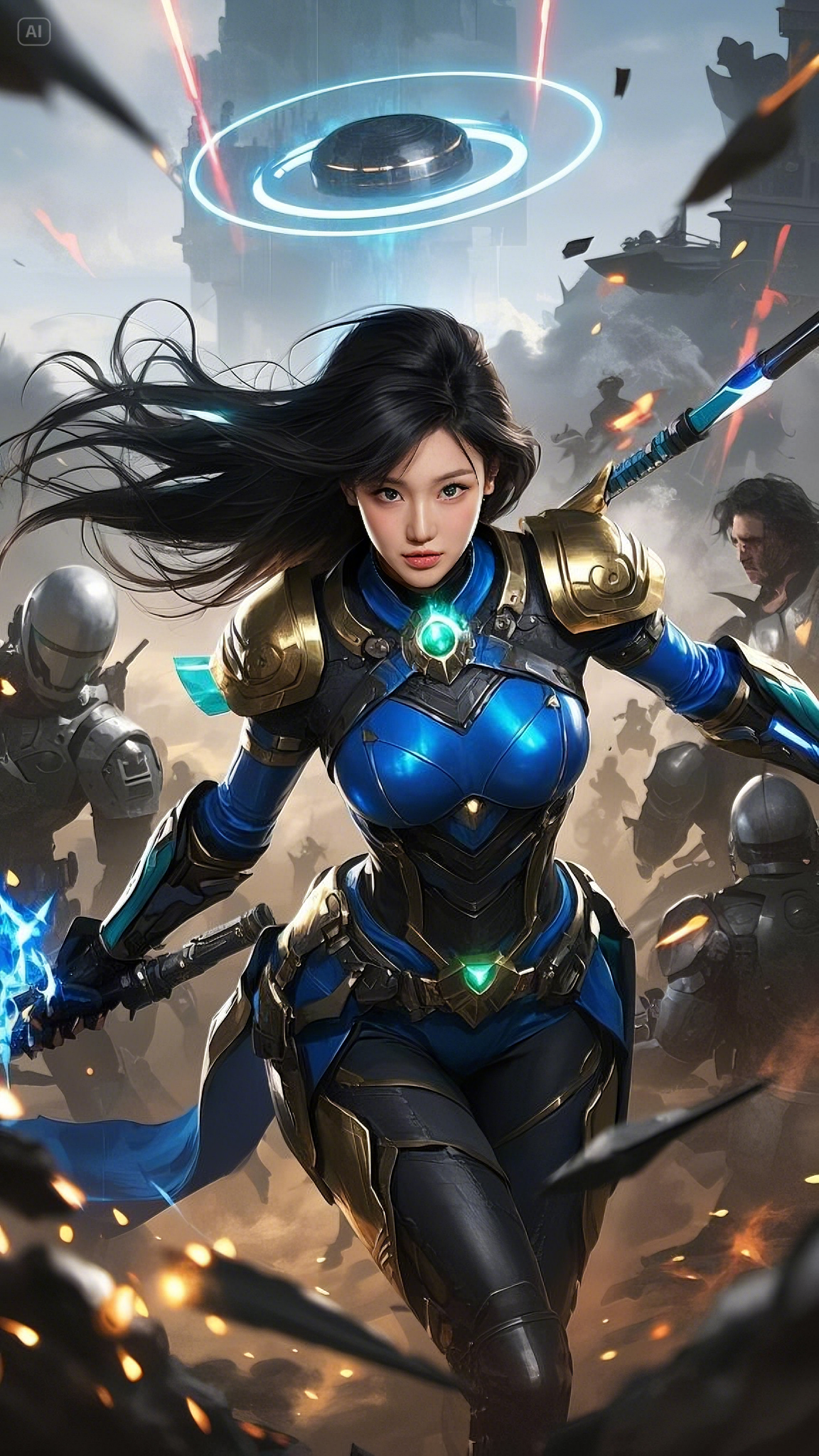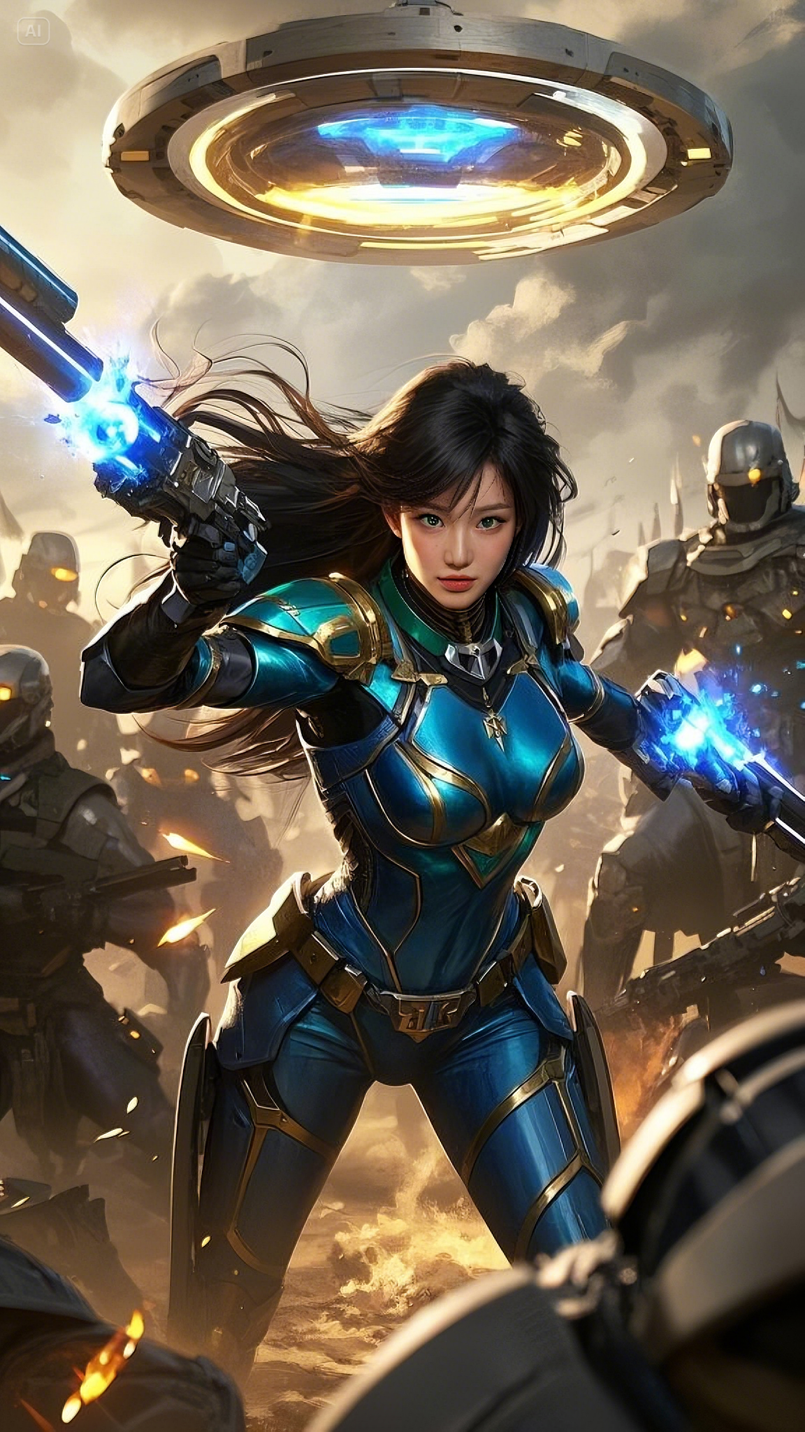 Clad in a sleek, high-tech combat suit of deep blue, gold, and black, she strode fearlessly across the battlefield, her movements exuding both grace and deadly precision. Her form-fitting armor was not just protection—it was a conduit for energy, a fusion of technology and raw power. Embedded in her chest, a glowing emerald core pulsed with every breath she took, feeding power into her suit and weapons.