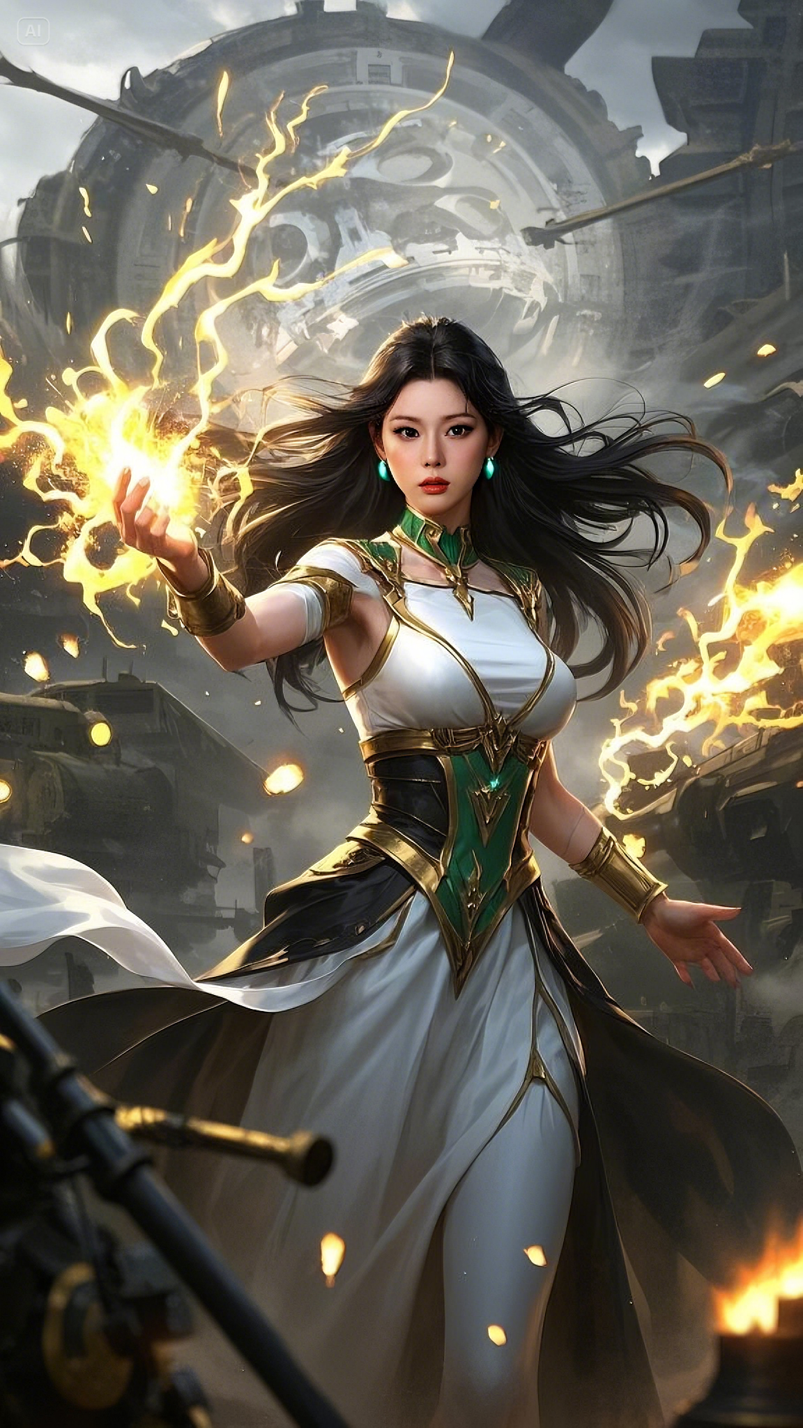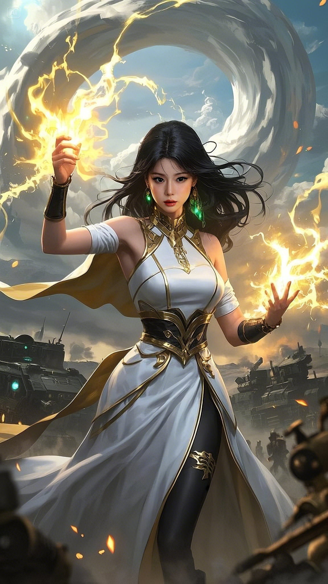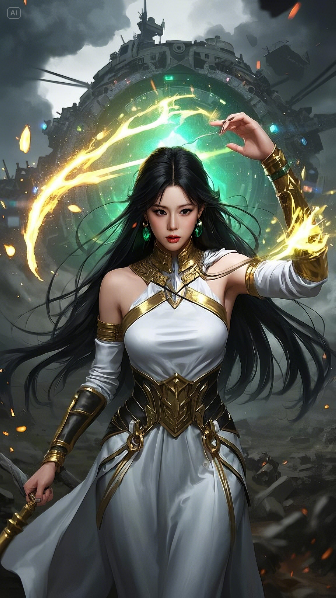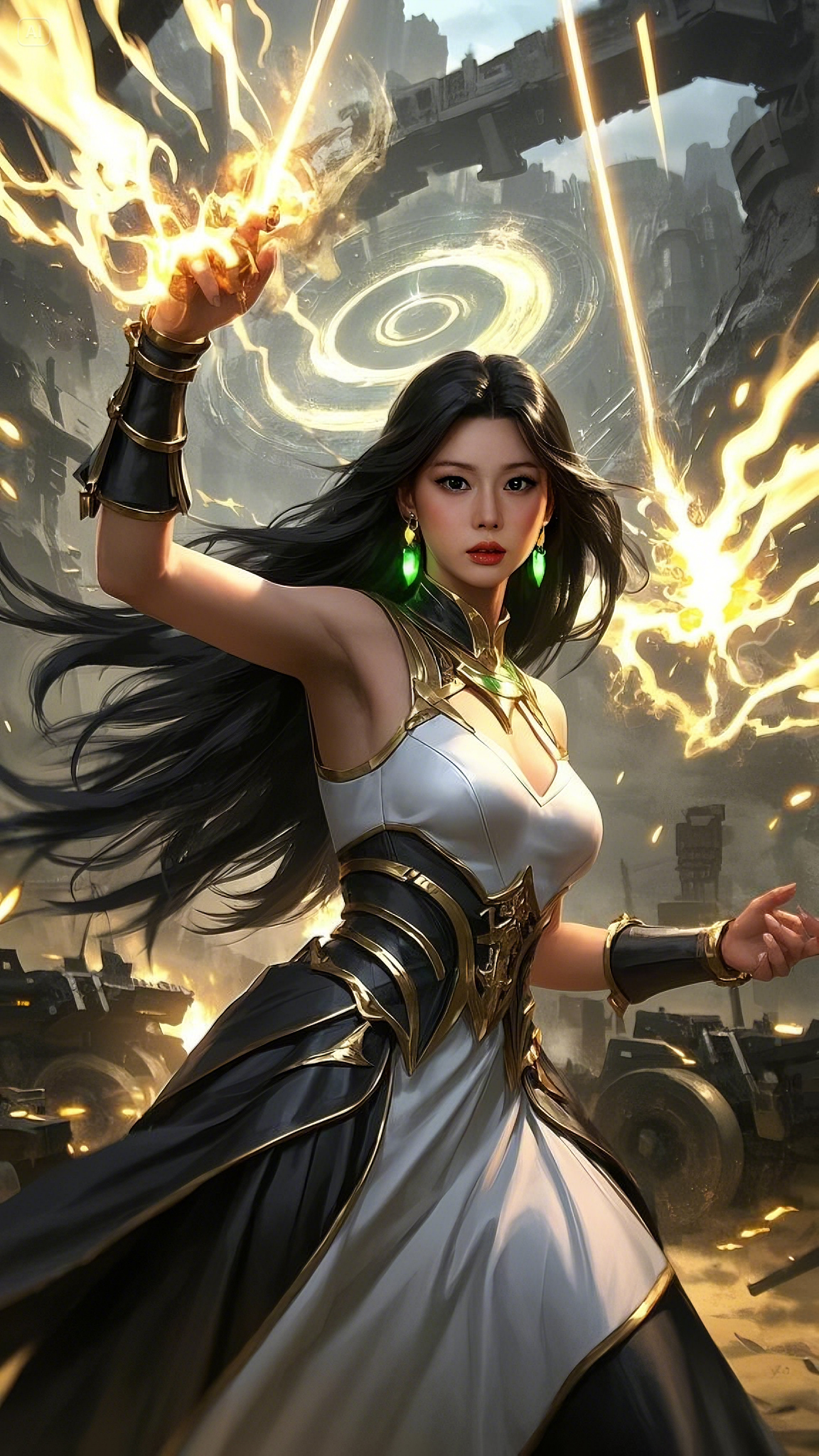 Her presence was otherworldly—clad in a flowing white and gold battle-gown, an elegant yet indomitable fusion of magic and war. Every stitch of her attire shimmered with ancient enchantments, laced with golden filigree that pulsed in sync with the raw power surging through her veins. Her emerald-green eyes, glowing with celestial might, locked onto the battlefield as if she saw every possible outcome before it unfolded.