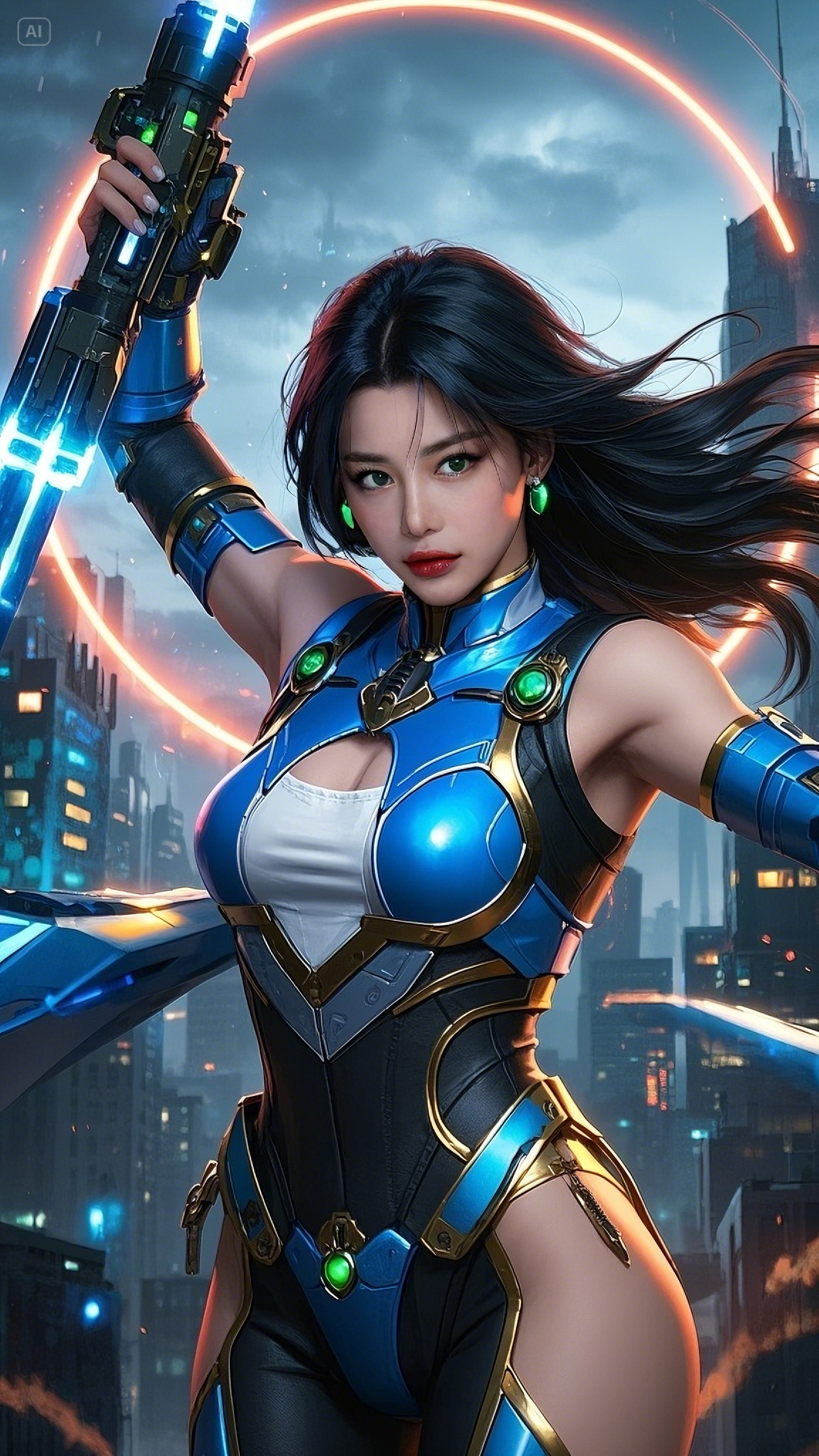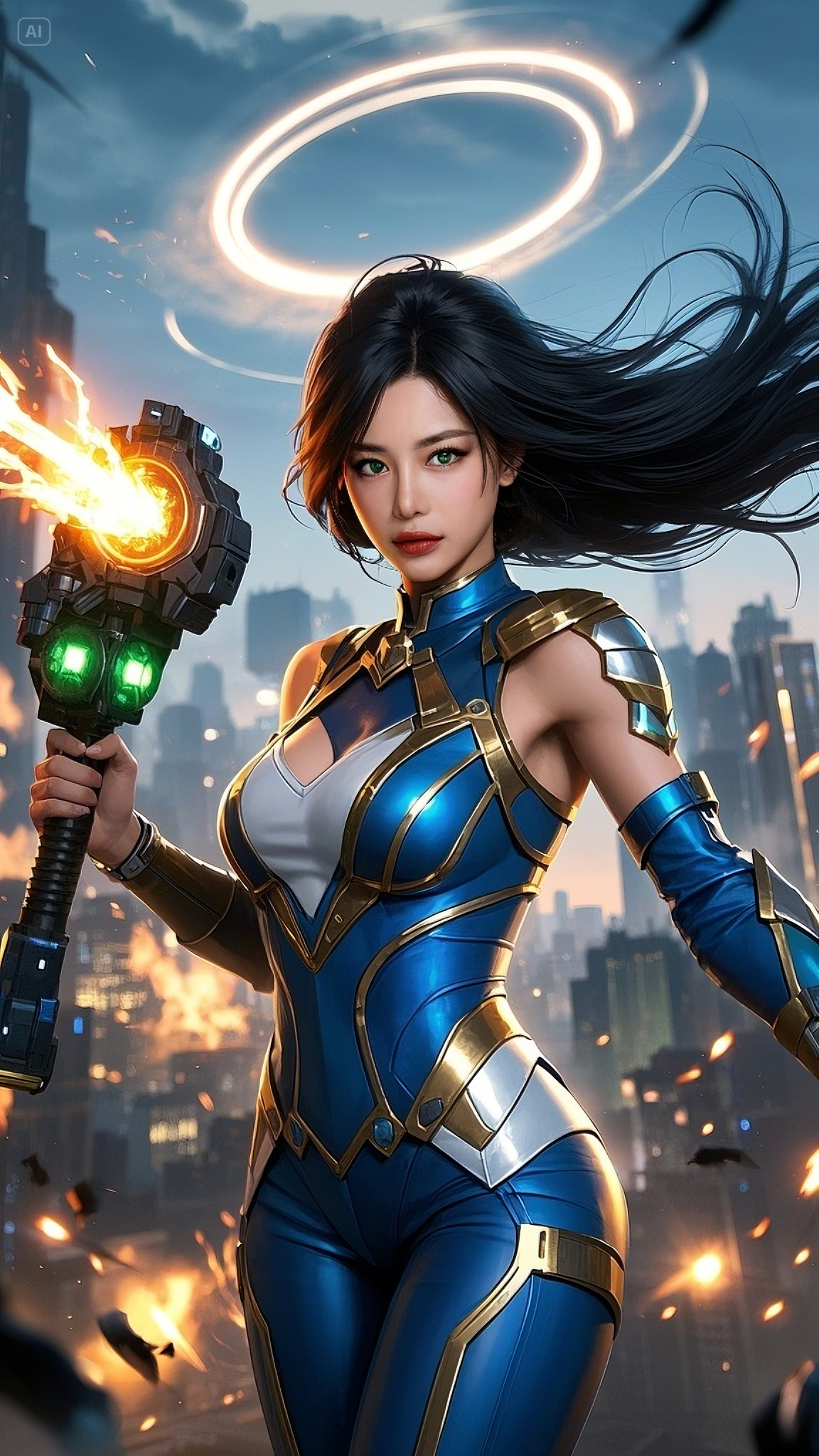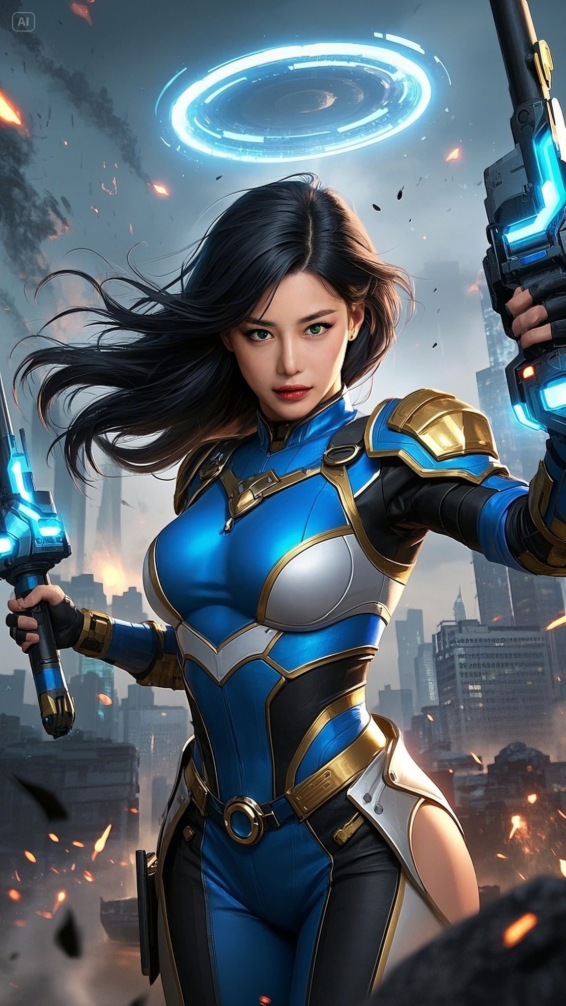 Her sapphire-and-gold exo-armor shimmered against the morning light, absorbing energy from the surrounding chaos. Her emerald eyes scanned the battlefield below — human resistance fighters cornered by synthetic war machines. As the last hope of a dying Earth, Astra activated Ignition Protocol. Her plasma blade — the Ion Crescent — blazed to life with a hiss, carving through the air like lightning born of vengeance.