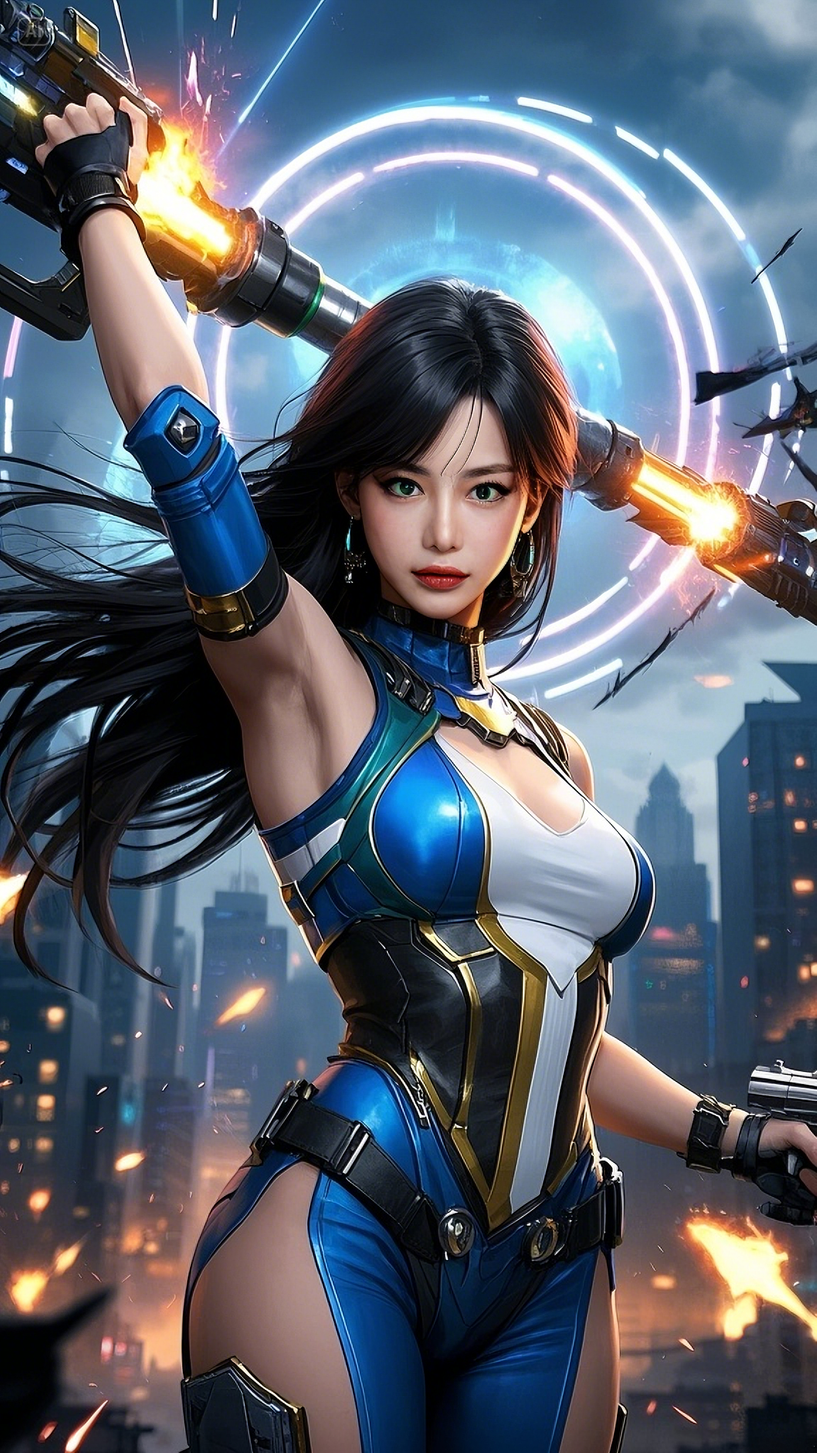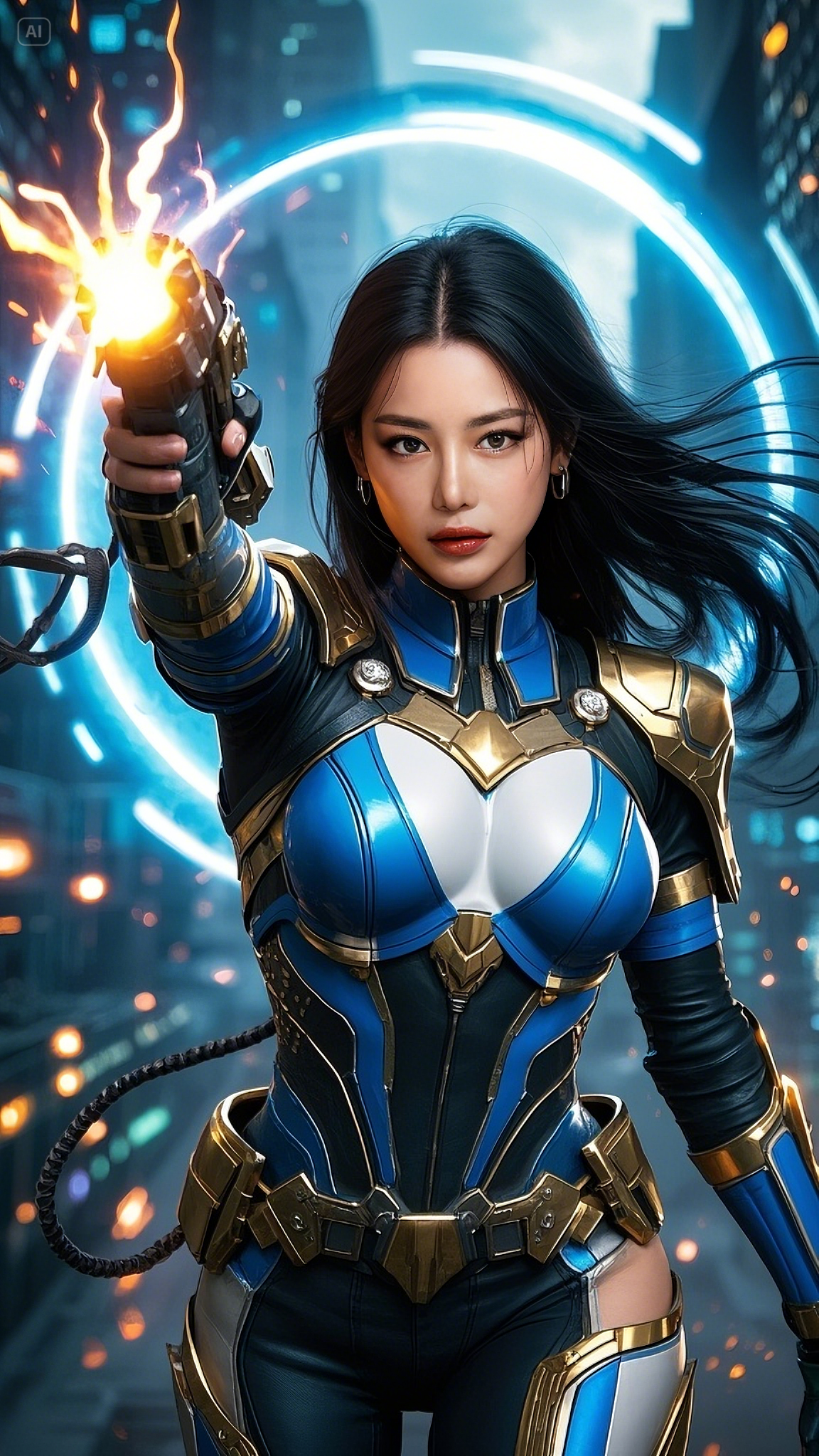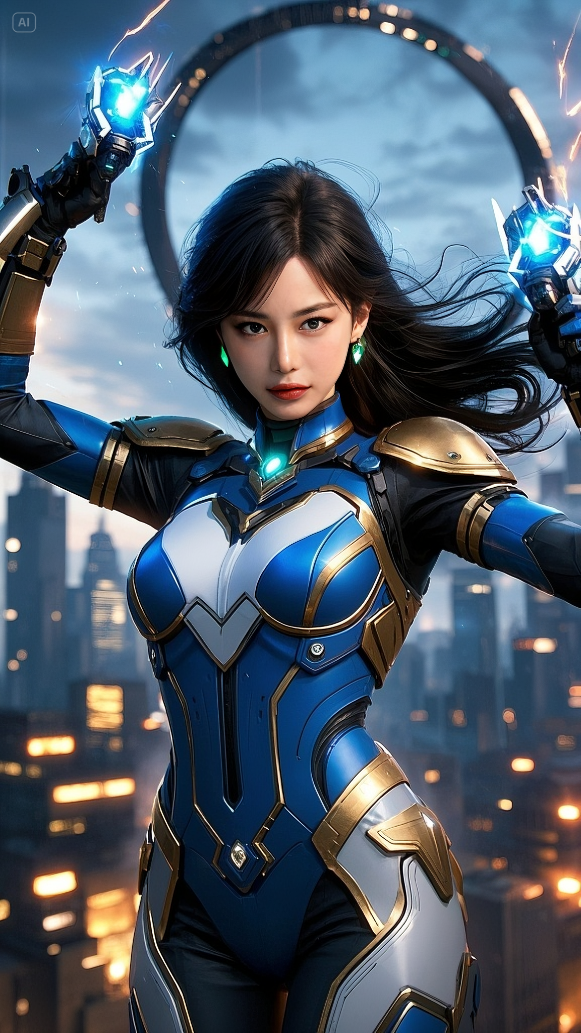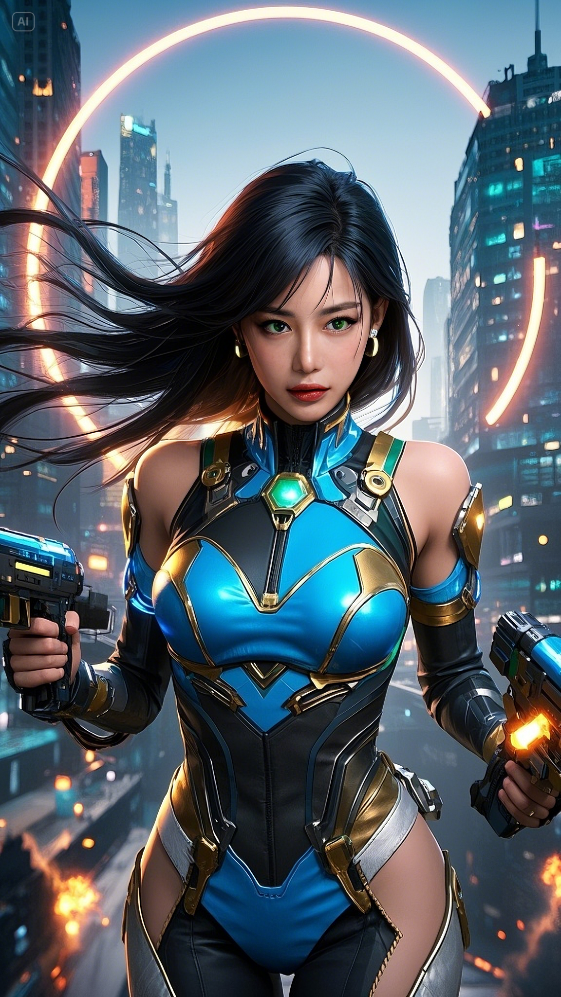Her sapphire-and-gold exo-armor shimmered against the morning light, absorbing energy from the surrounding chaos. Her emerald eyes scanned the battlefield below — human resistance fighters cornered by synthetic war machines. As the last hope of a dying Earth, Astra activated Ignition Protocol. Her plasma blade — the Ion Crescent — blazed to life with a hiss, carving through the air like lightning born of vengeance.