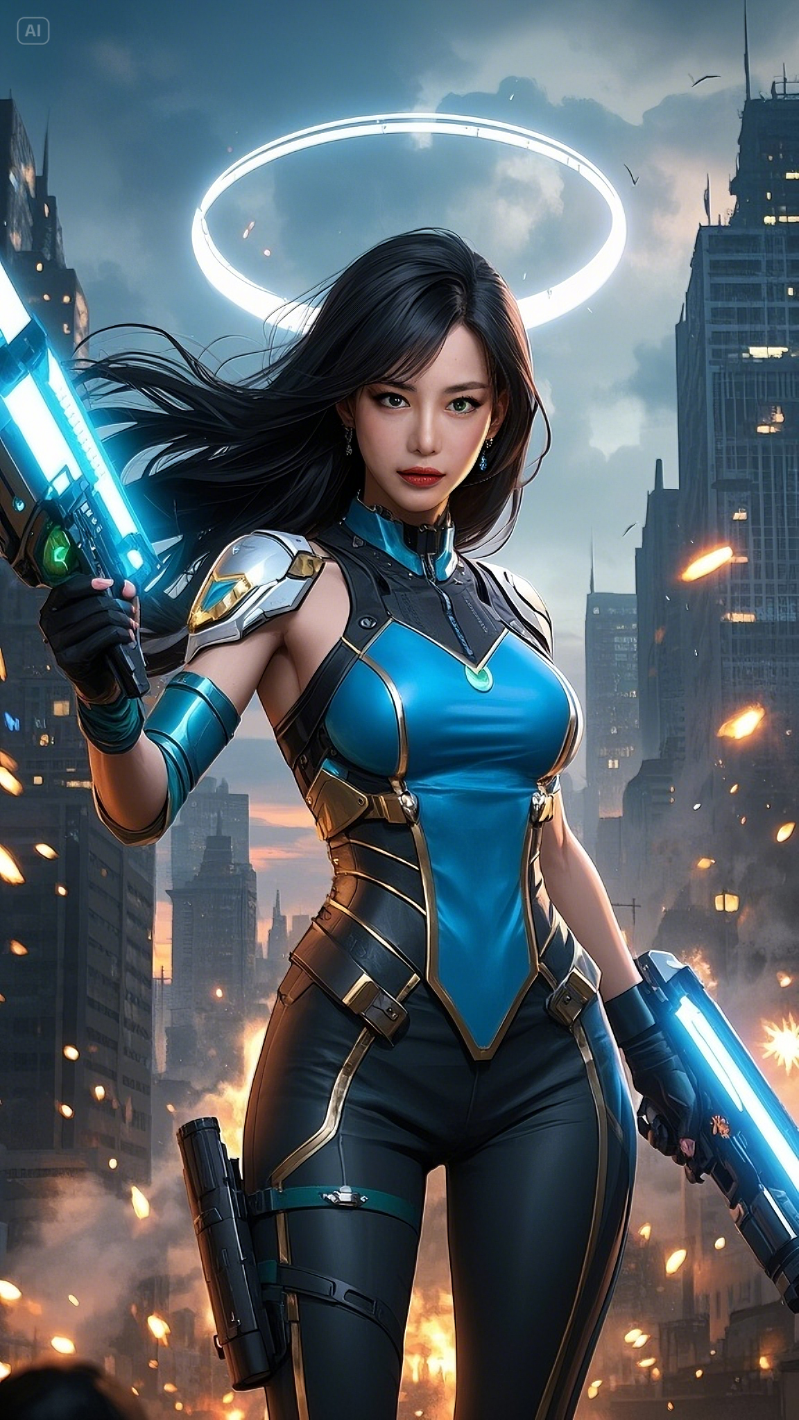 The city burned under a pale blue sky. Skyscrapers that once reached proudly into the heavens now stood shattered, hollowed out by war. Streets were littered with debris, and above it all, a radiant figure descended like divine fire — Astra Nova, the last Cyber Valkyrie of the 7000s.