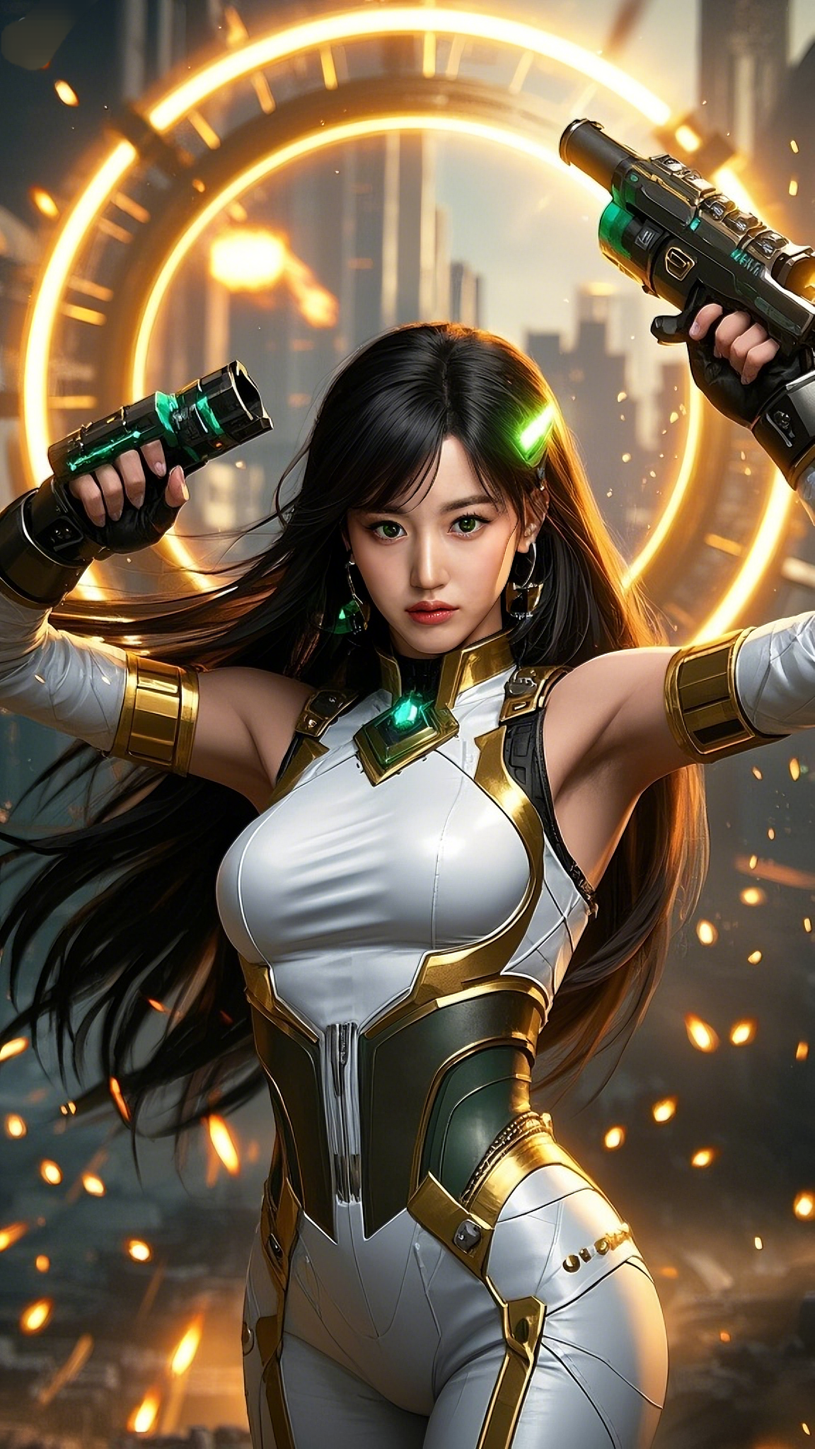 Above her, a radiant golden teleport ring spun and expanded with immense energy. It wasn’t just a tool—it was a symbol of her origin, a portal forged in the cosmic labs of the Orion Nebula. Only those chosen by the Celestial Archives could pass through it. She had come from there, sent as a guardian of equilibrium. Earth, locked in a war between AI overlords and rebel sanctuaries, had become her battlefield.
