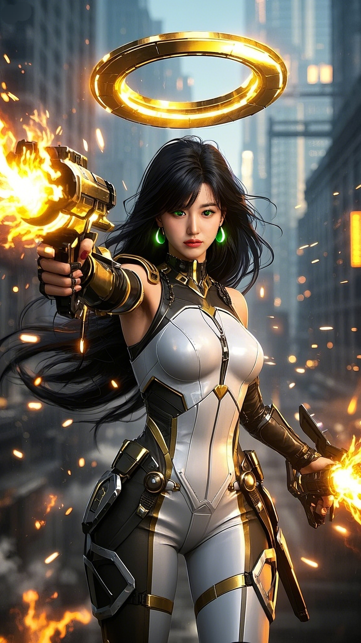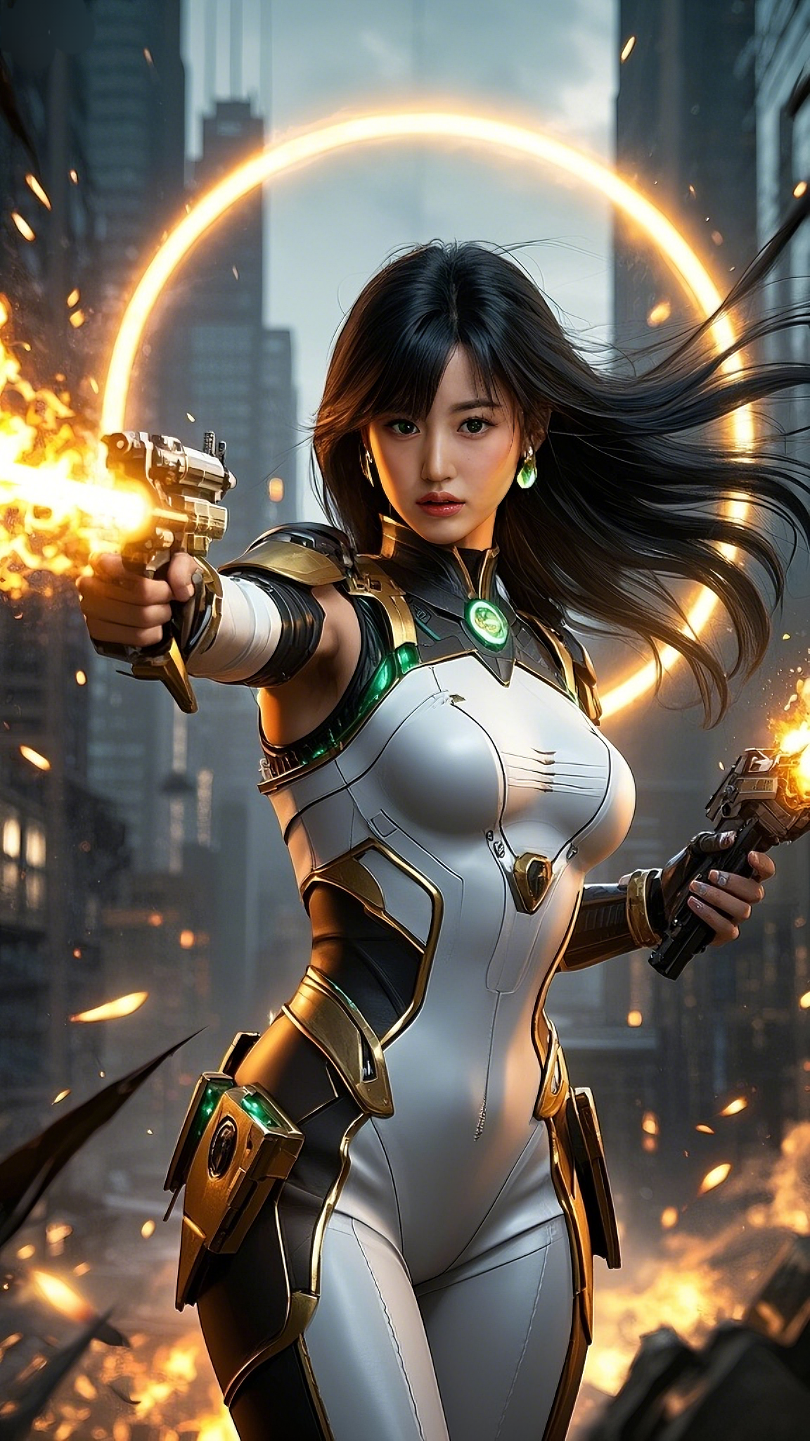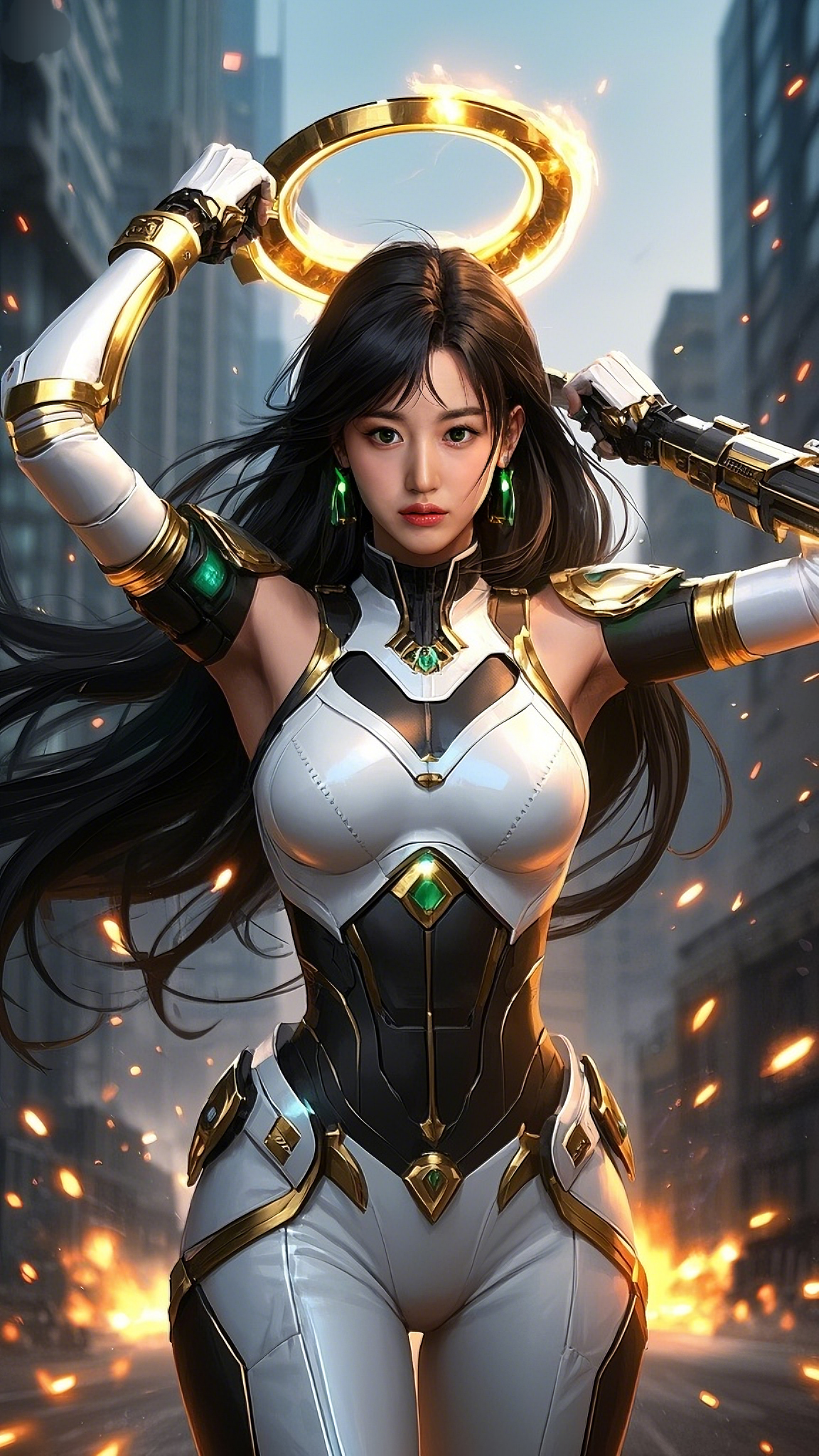 The air trembled under the weight of battle. Skyscrapers, once symbols of prosperity, now stood like wounded titans amidst the smog and fire. From the center of the chaos rose a figure unlike any the city had ever seen—a cyber goddess, her armor gleaming with white and gold, her emerald eyes glowing with focused fury.
