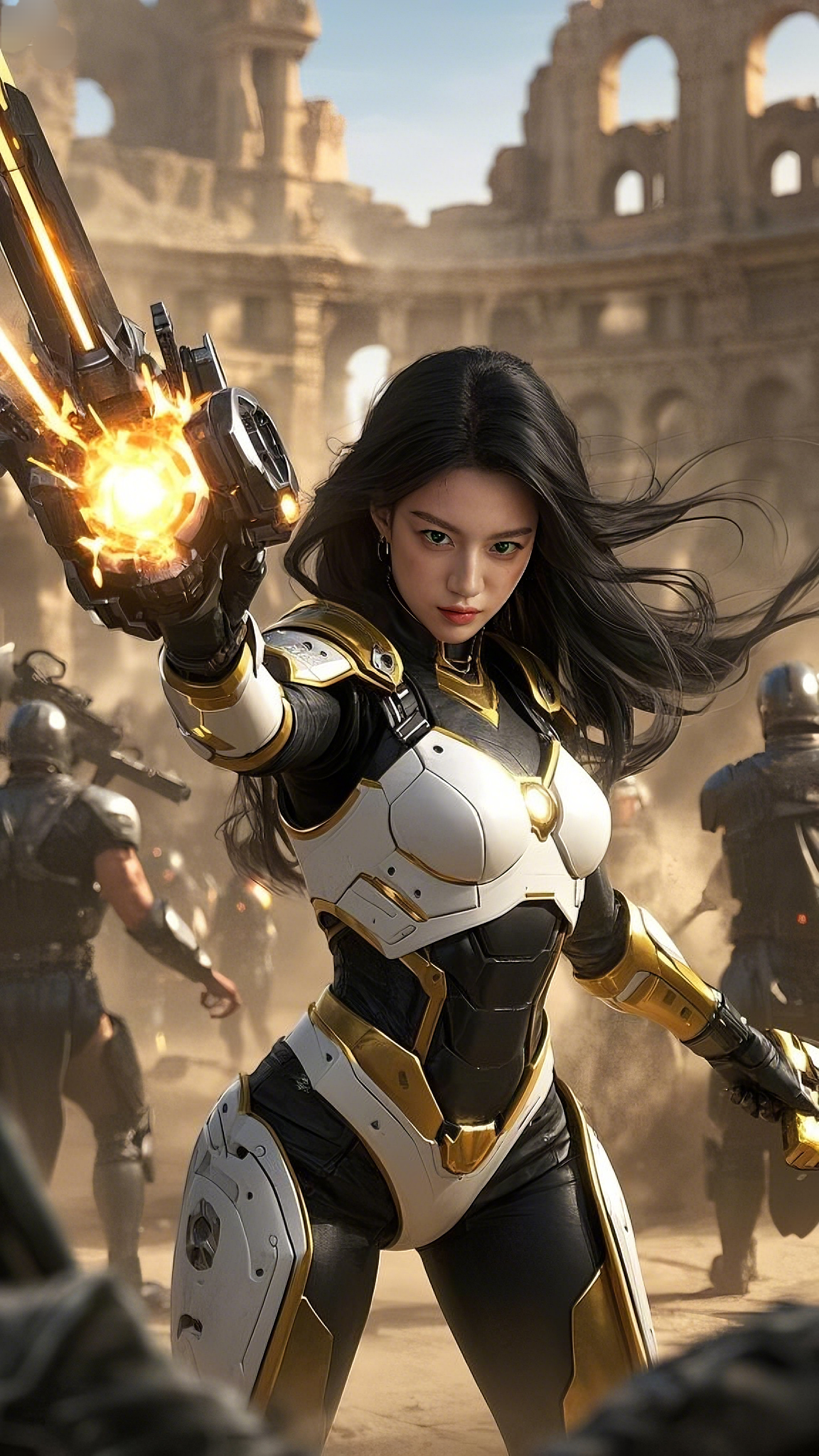 She moved with unnatural grace, striding through the ruined avenue like a deity walking among mortals. Two plasma pistols blazed in her hands, discharging rounds of golden fire that left trails of light in the air. With every pull of the trigger, enemies crumbled, their weapons falling uselessly to the ground.