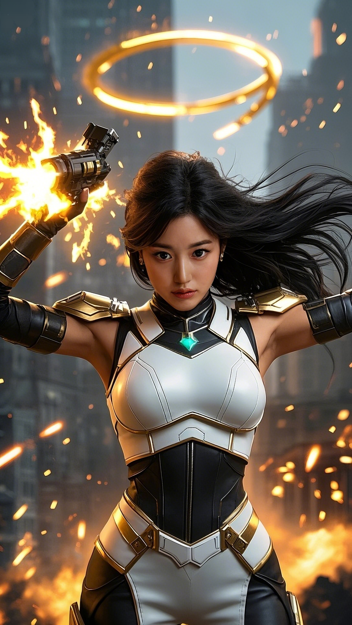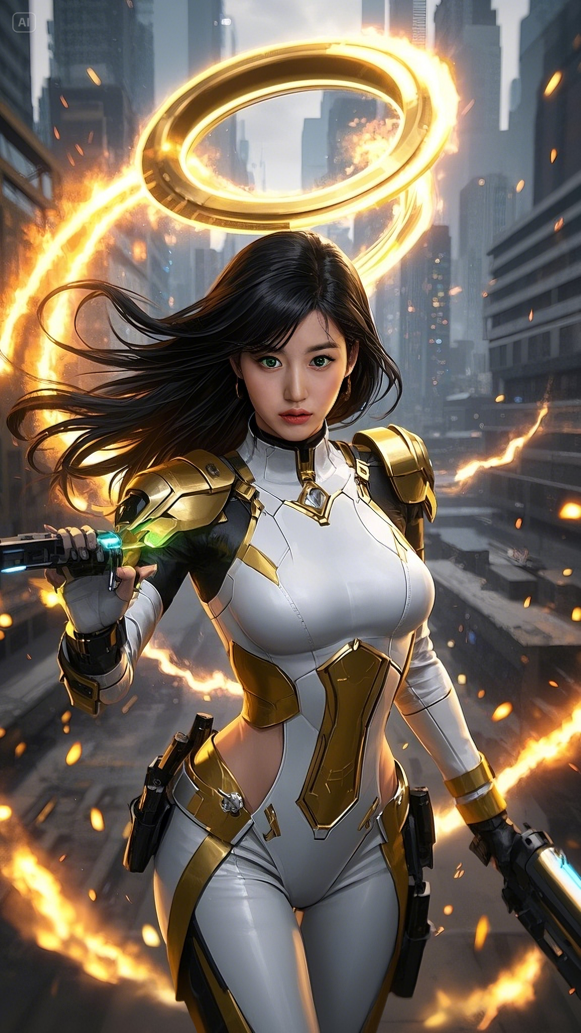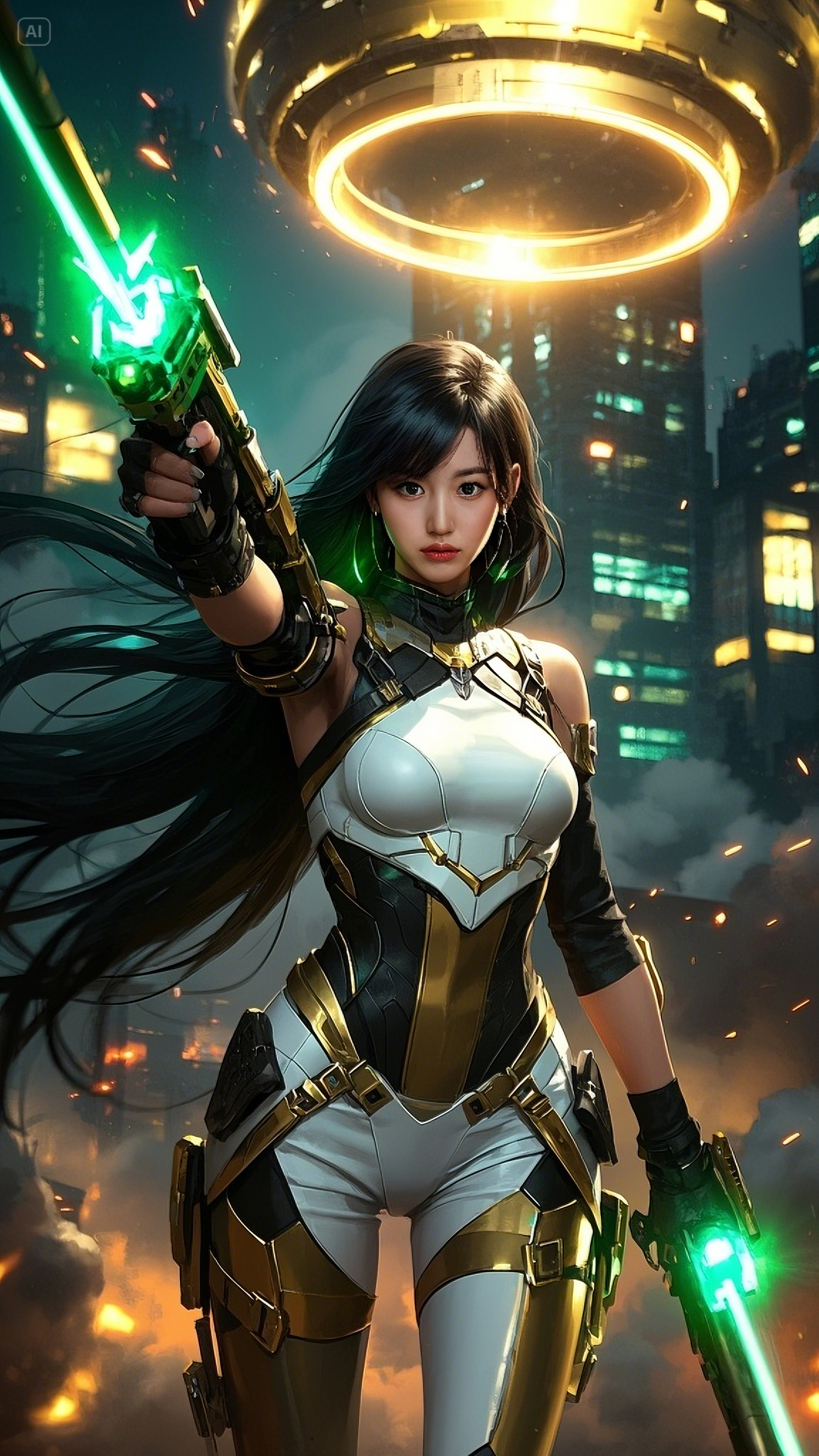 The skies above the futuristic city burned with the intensity of war. Towers of steel and glass trembled beneath the thunder of energy blasts, as neon signs flickered and fell into the chaotic streets. Amid this crumbling skyline, she stood—flawless, formidable, a vision of divine wrath molded in advanced armor of white, gold, and green.
