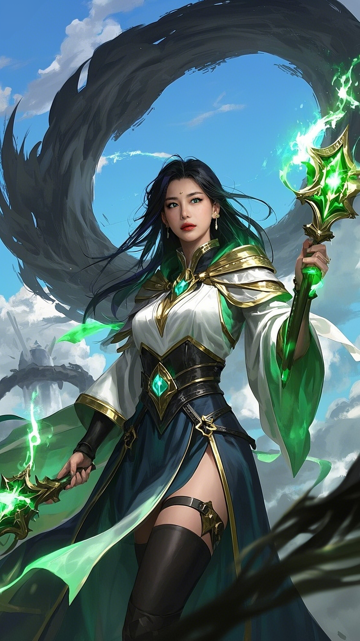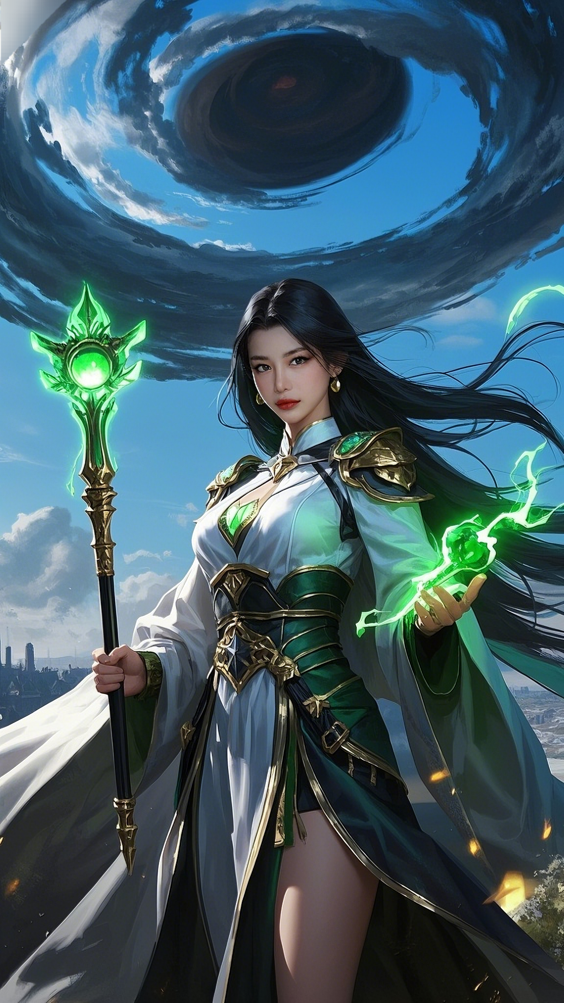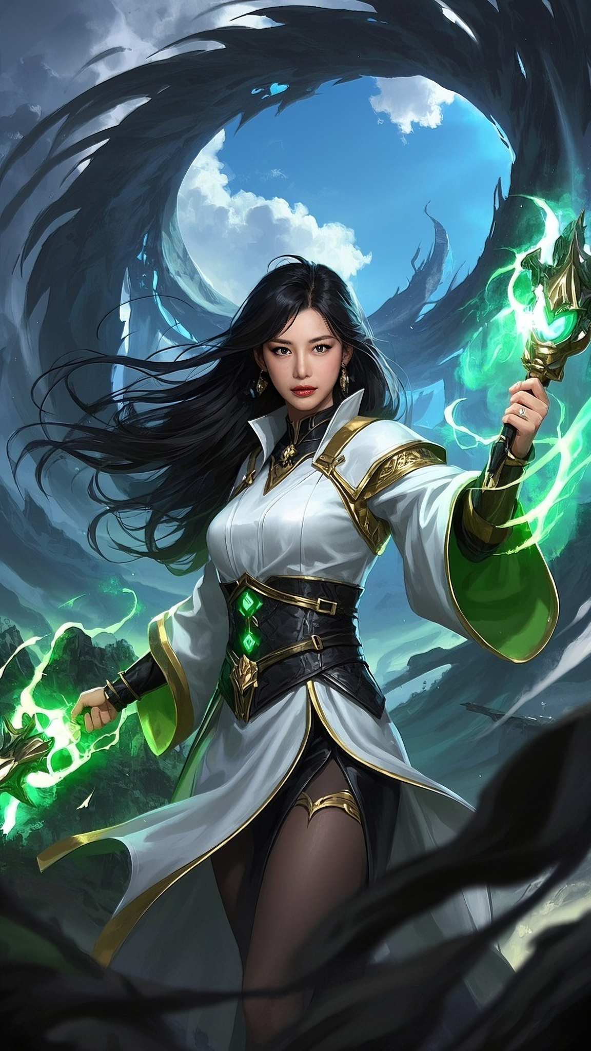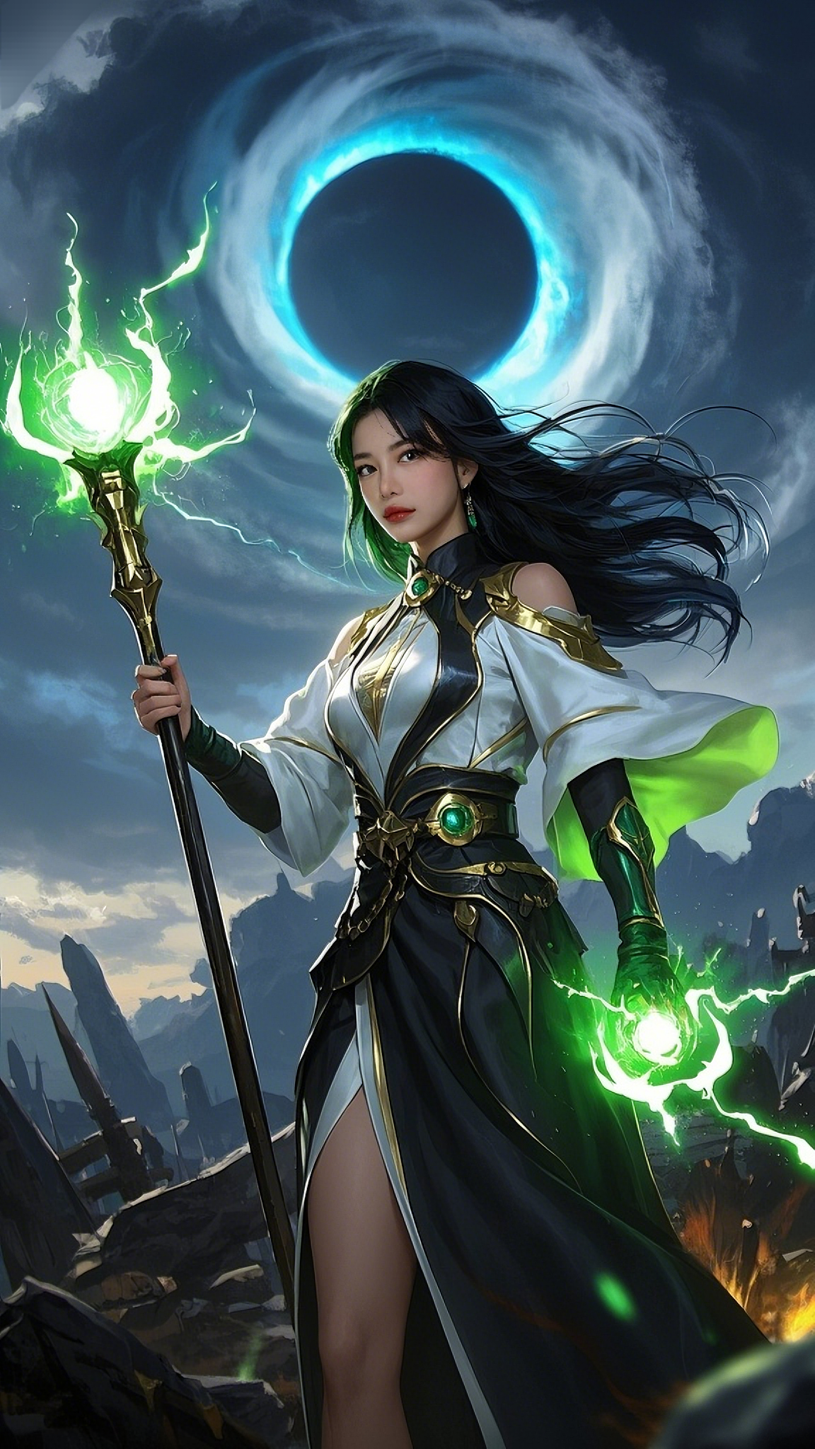 In the shadow of the vortex stood Elaira Valen, known to the world as the White Arcana. Her cloak fluttered like whispered prophecy, stitched with moon-thread and interwoven with the sigils of ten forgotten dimensions. Her twin emerald-tipped wands hummed with primal magic as if awakened by the rift itself. The time she had prepared for her entire life was now unfolding—destiny wasn’t waiting anymore.