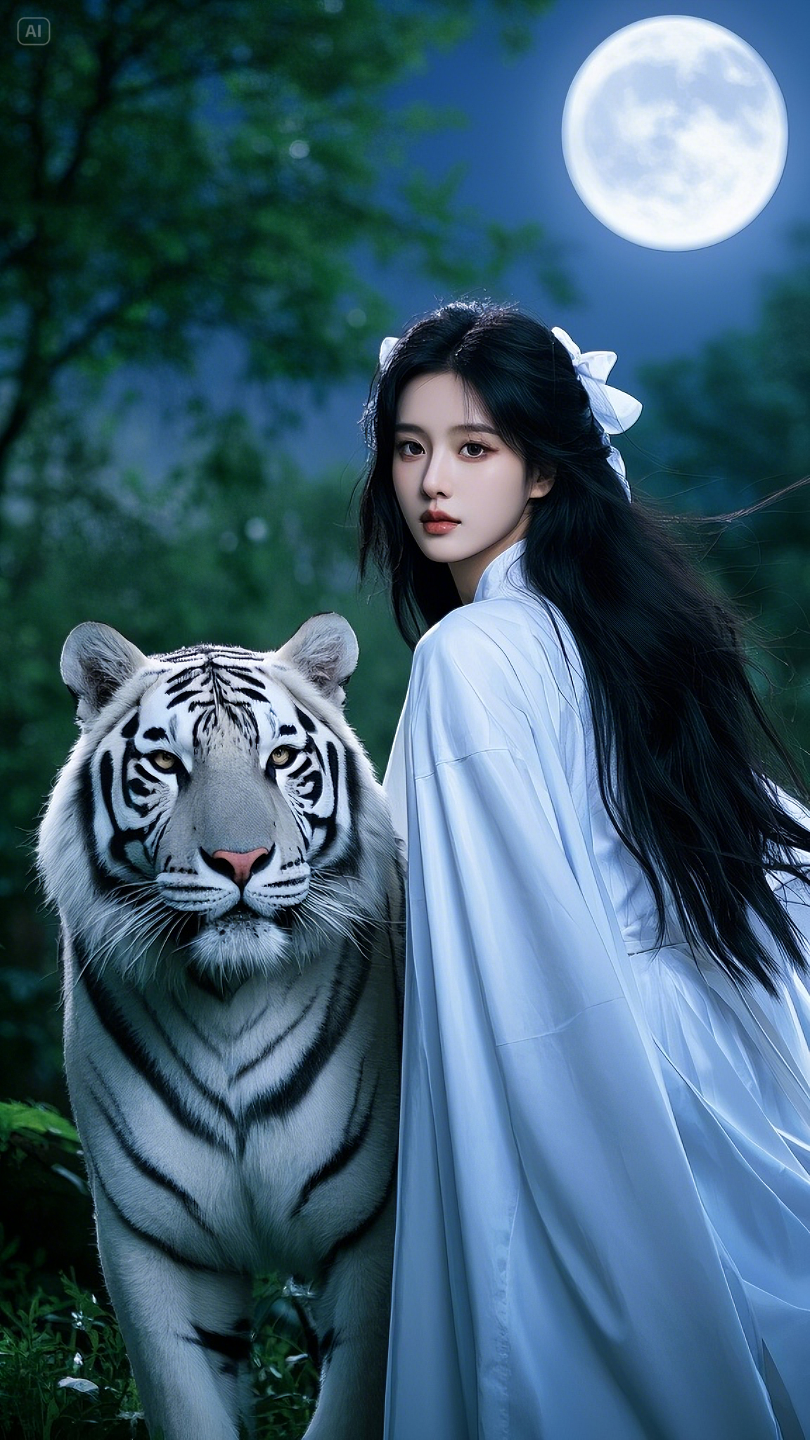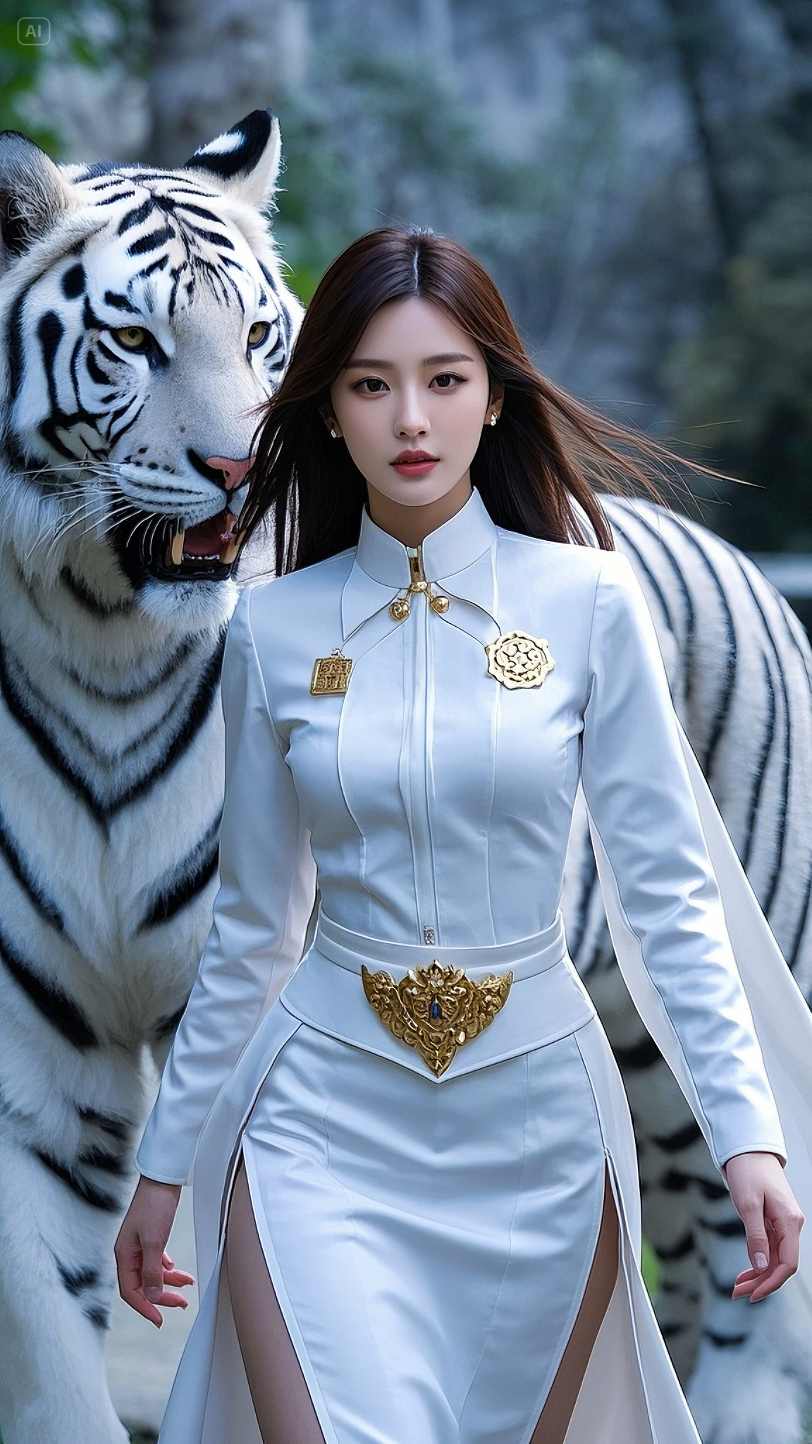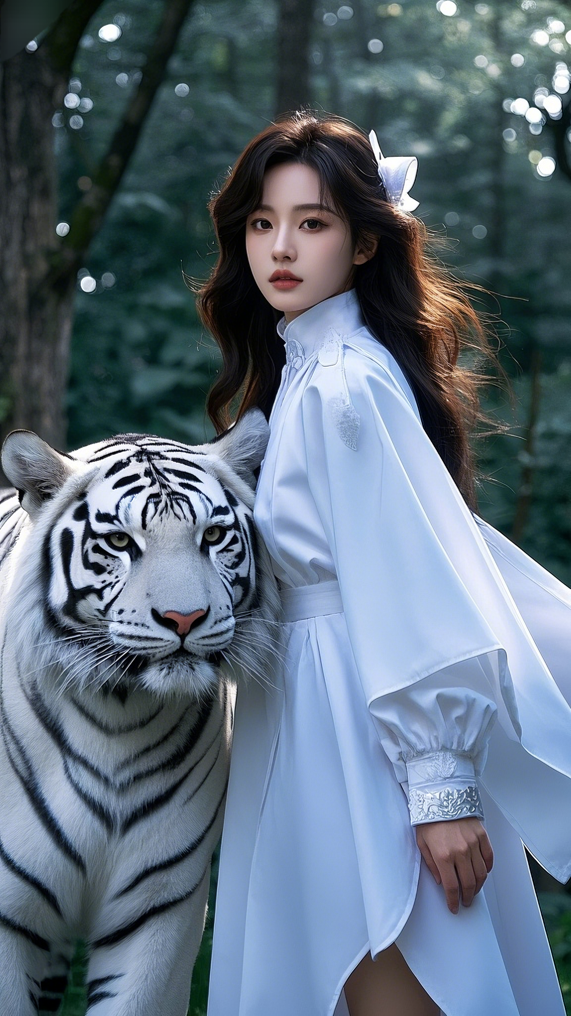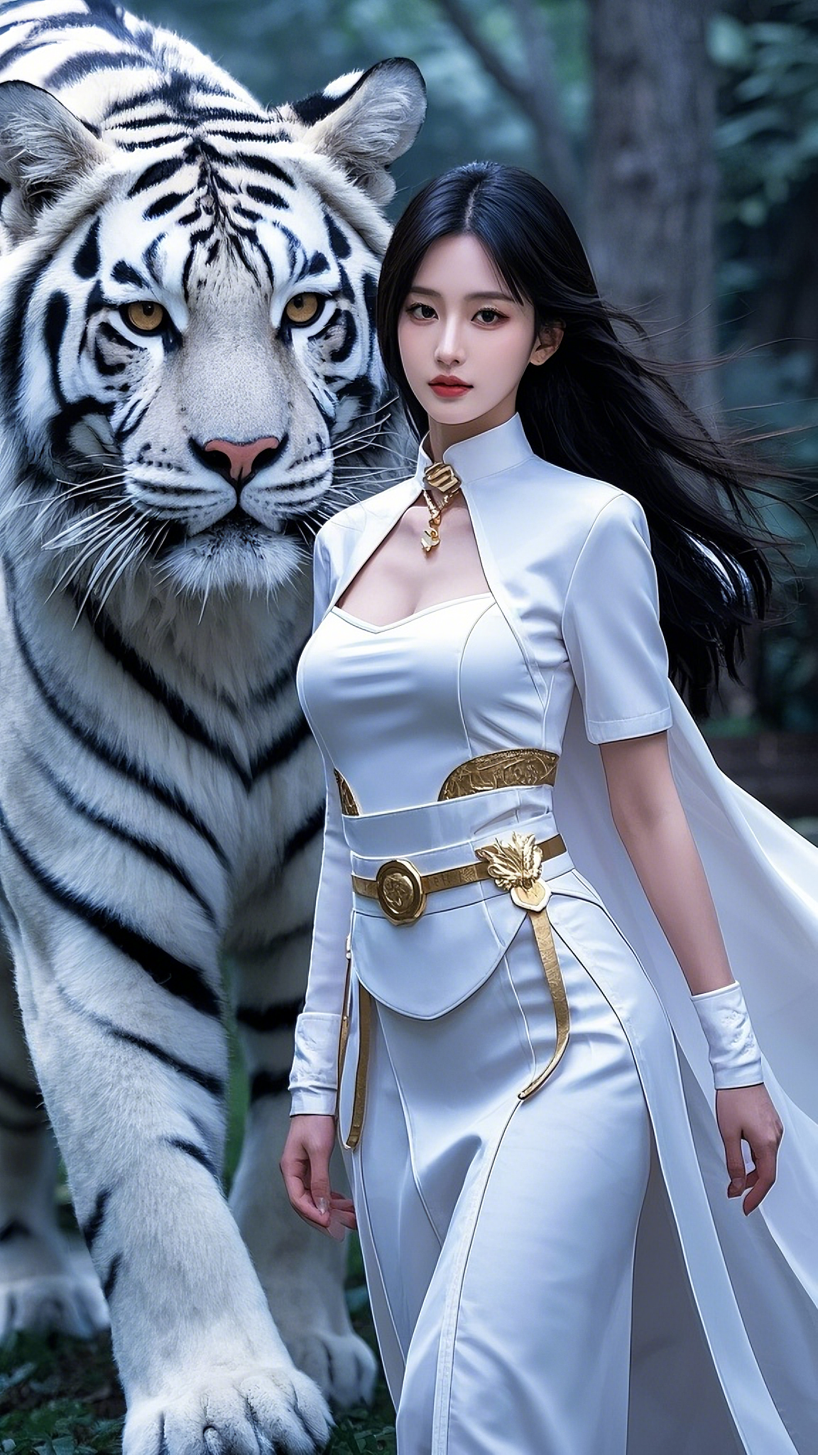 Clad in a shimmering white gown adorned with golden symbols of power, she moved like flowing light, her presence commanding reverence and awe. Beside her walked a magnificent white tiger, its coat gleaming like moonlight on crystal water, its eyes twin embers of silent fire. They were an inseparable bond—woman and beast—two guardians of the ancient prophecy that foretold balance between chaos and peace.