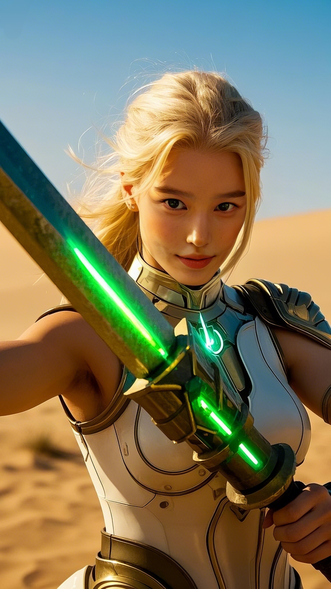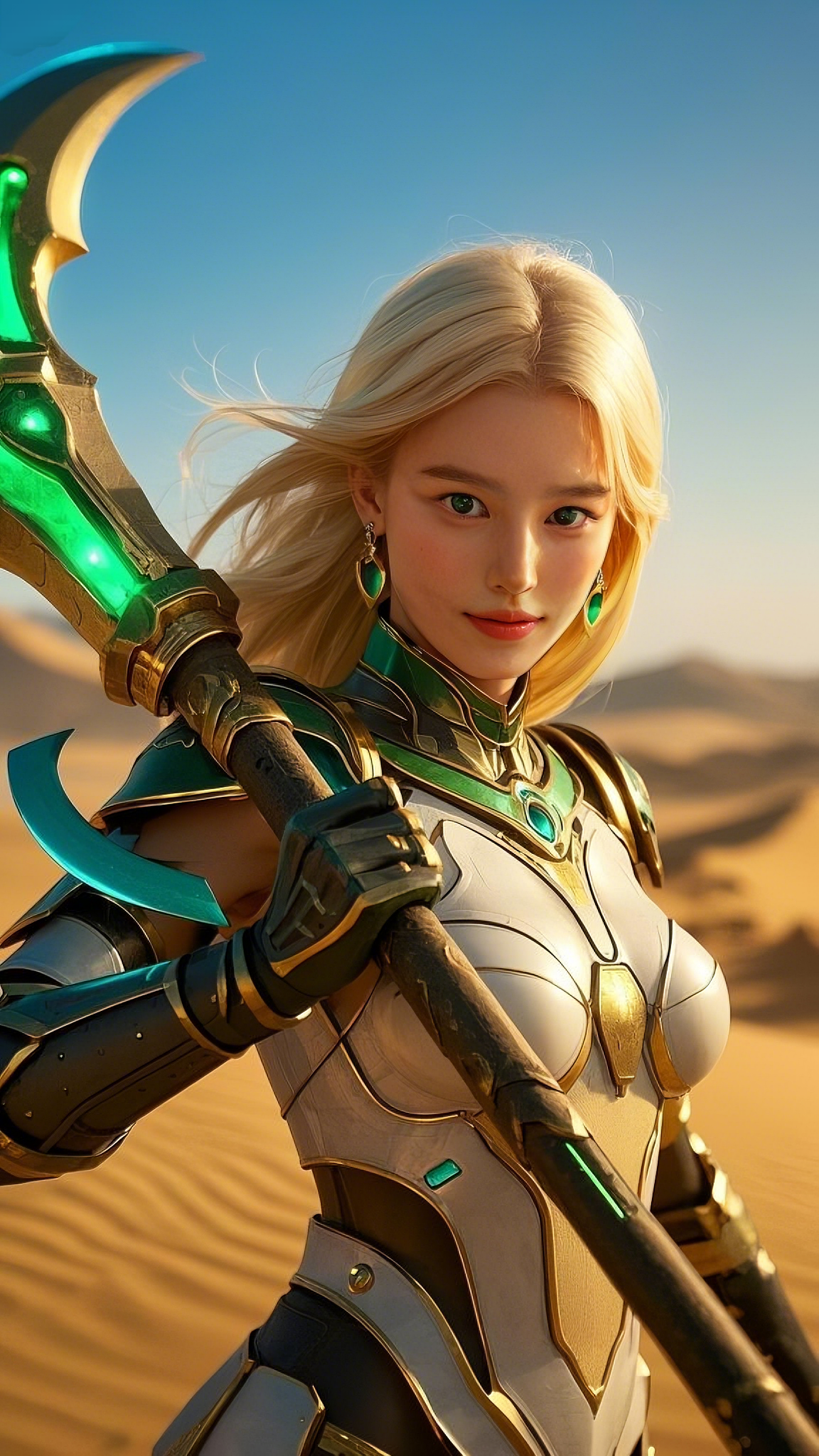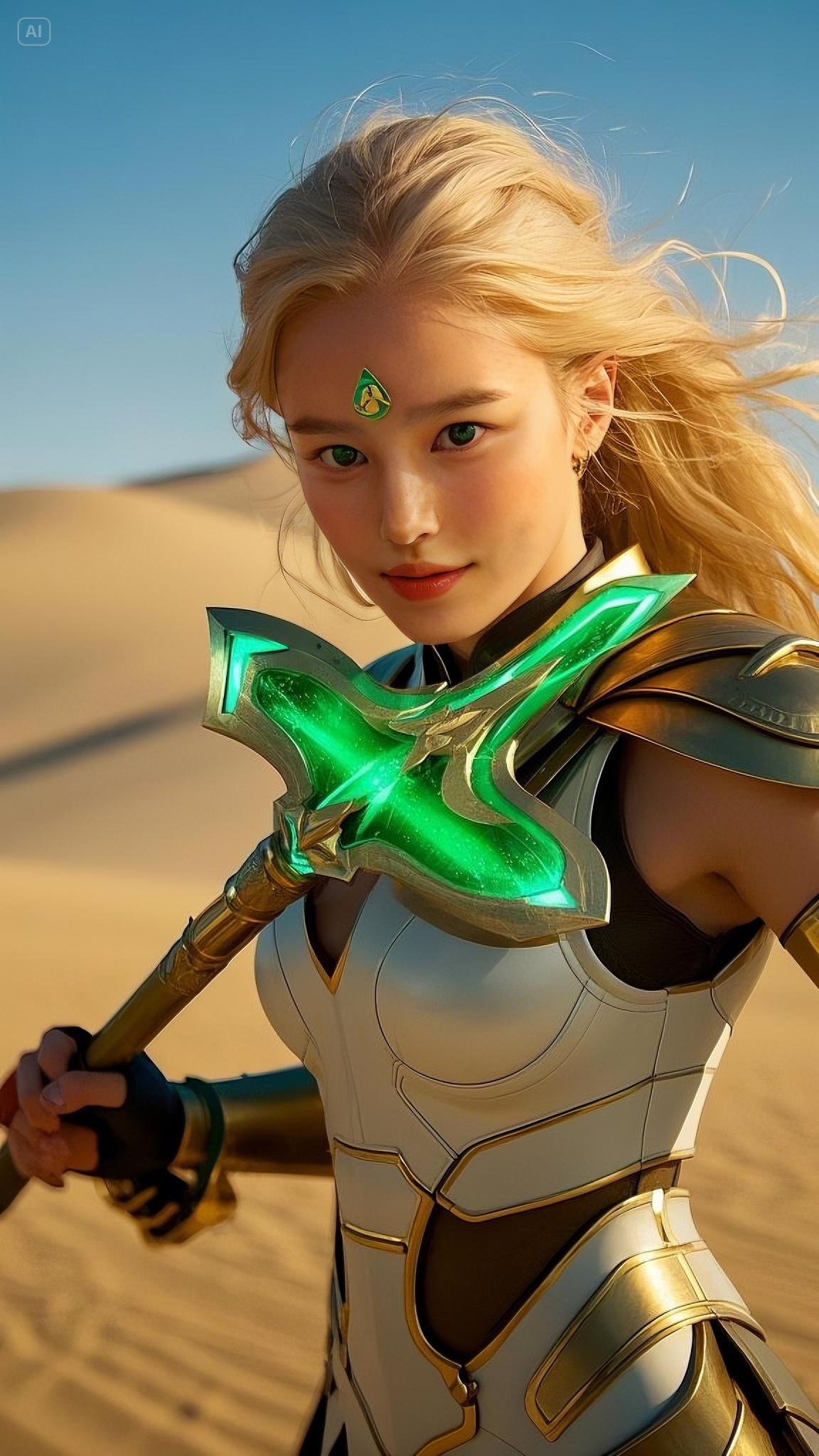 Her armor—a seamless fusion of white, gold, and emerald accents—clung to her form like a second skin, designed by the most advanced Hermes engineers to enhance both speed and durability. Long, flowing golden hair cascaded behind her, catching the desert’s light, as if she herself had been carved from the essence of the sun.