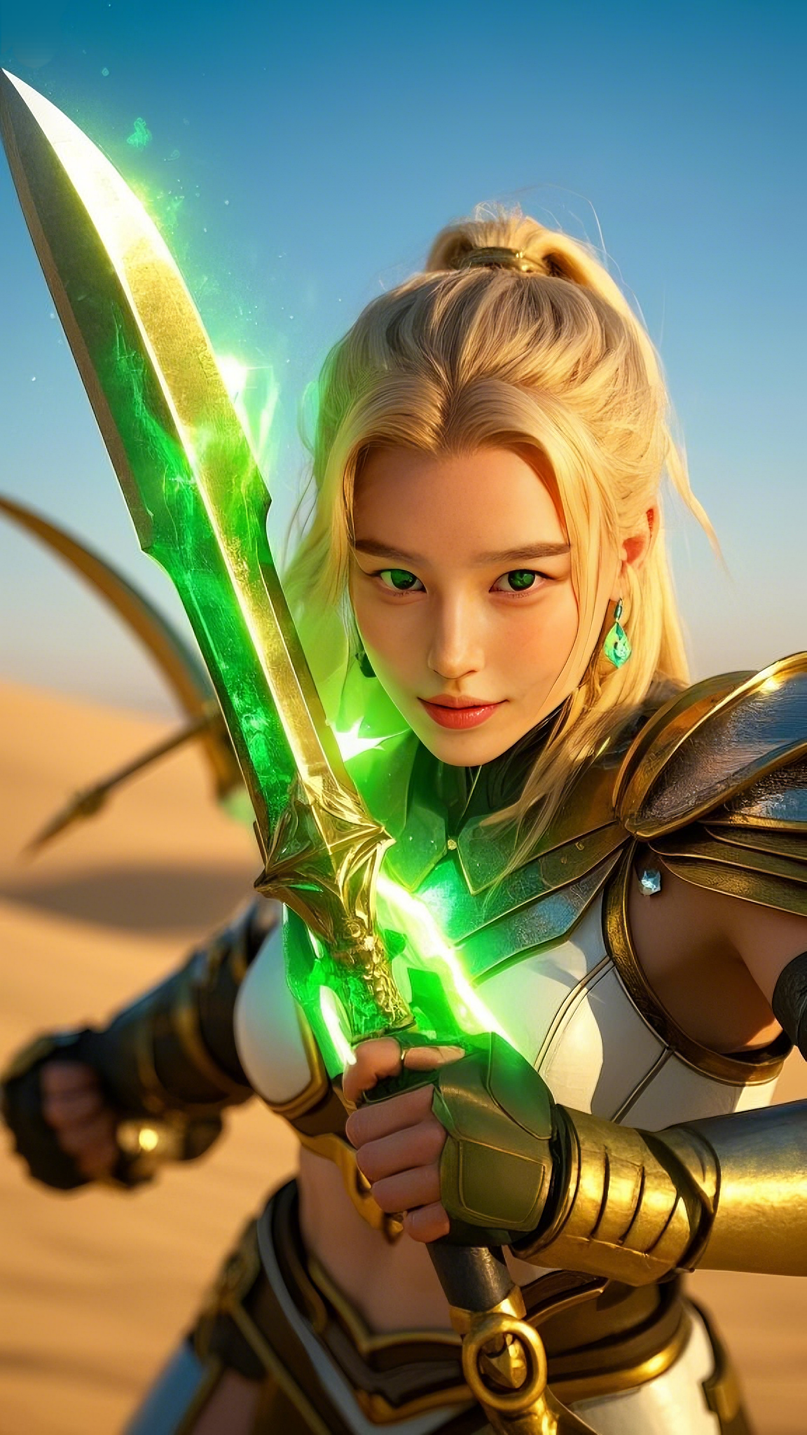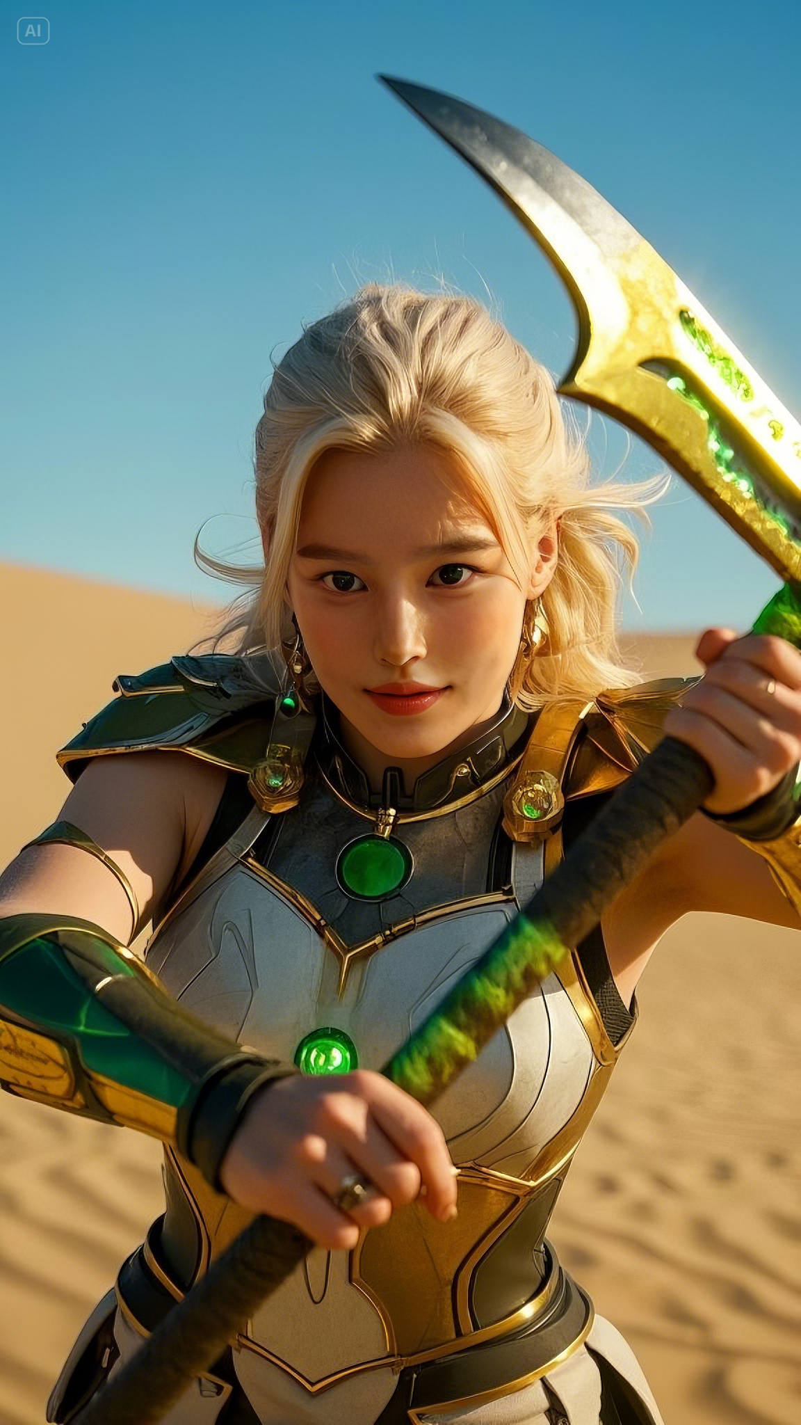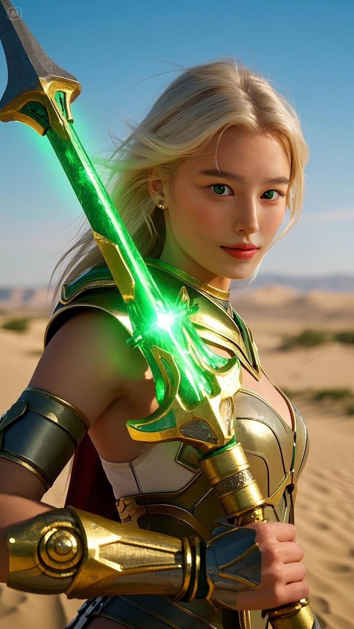 Her armor—a seamless fusion of white, gold, and emerald accents—clung to her form like a second skin, designed by the most advanced Hermes engineers to enhance both speed and durability. Long, flowing golden hair cascaded behind her, catching the desert’s light, as if she herself had been carved from the essence of the sun.