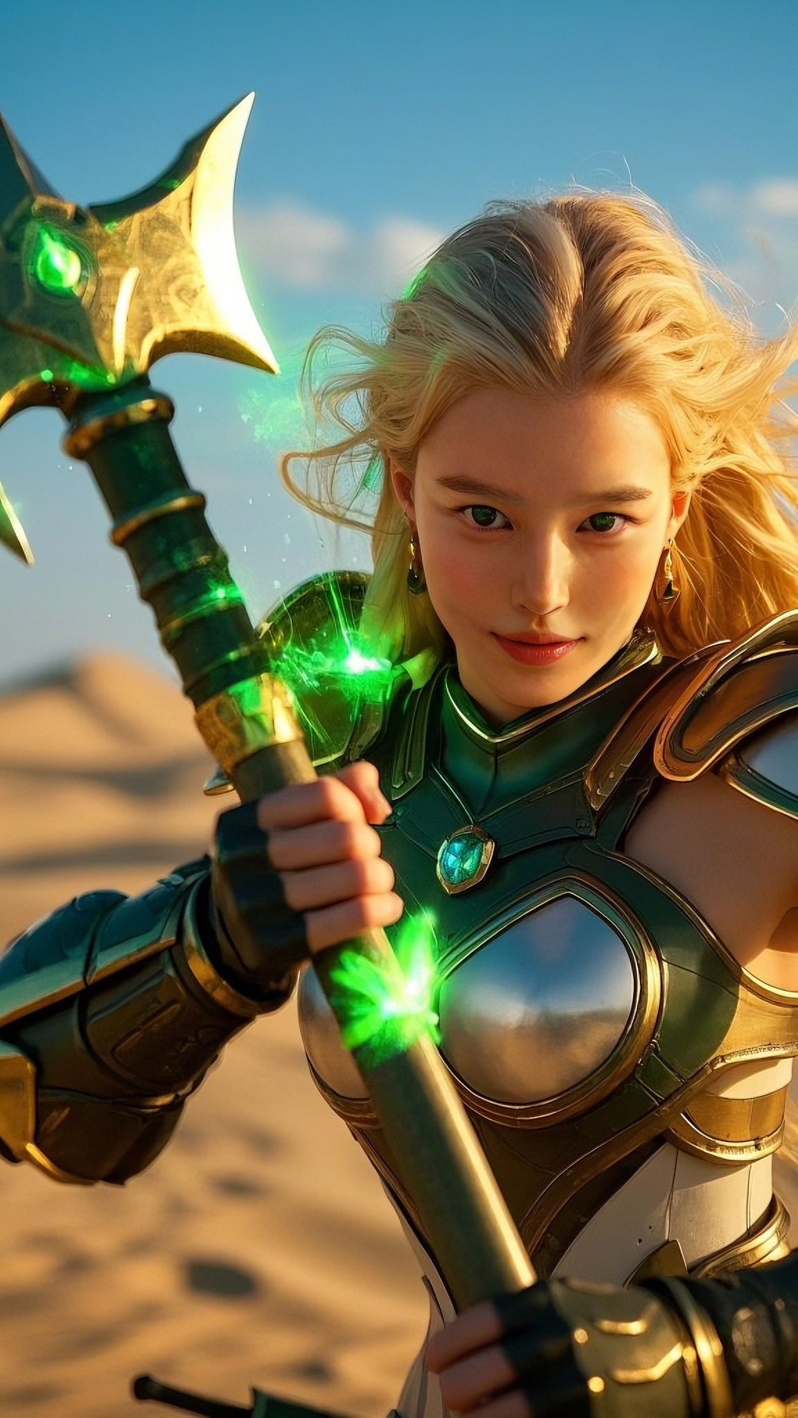 Her war axe swung in a golden arc, carving through the enemy lines like a celestial storm, its emerald aura igniting upon impact. Soldiers were flung back as shockwaves rippled through the battlefield, sending clouds of blue sand spiraling into the air.