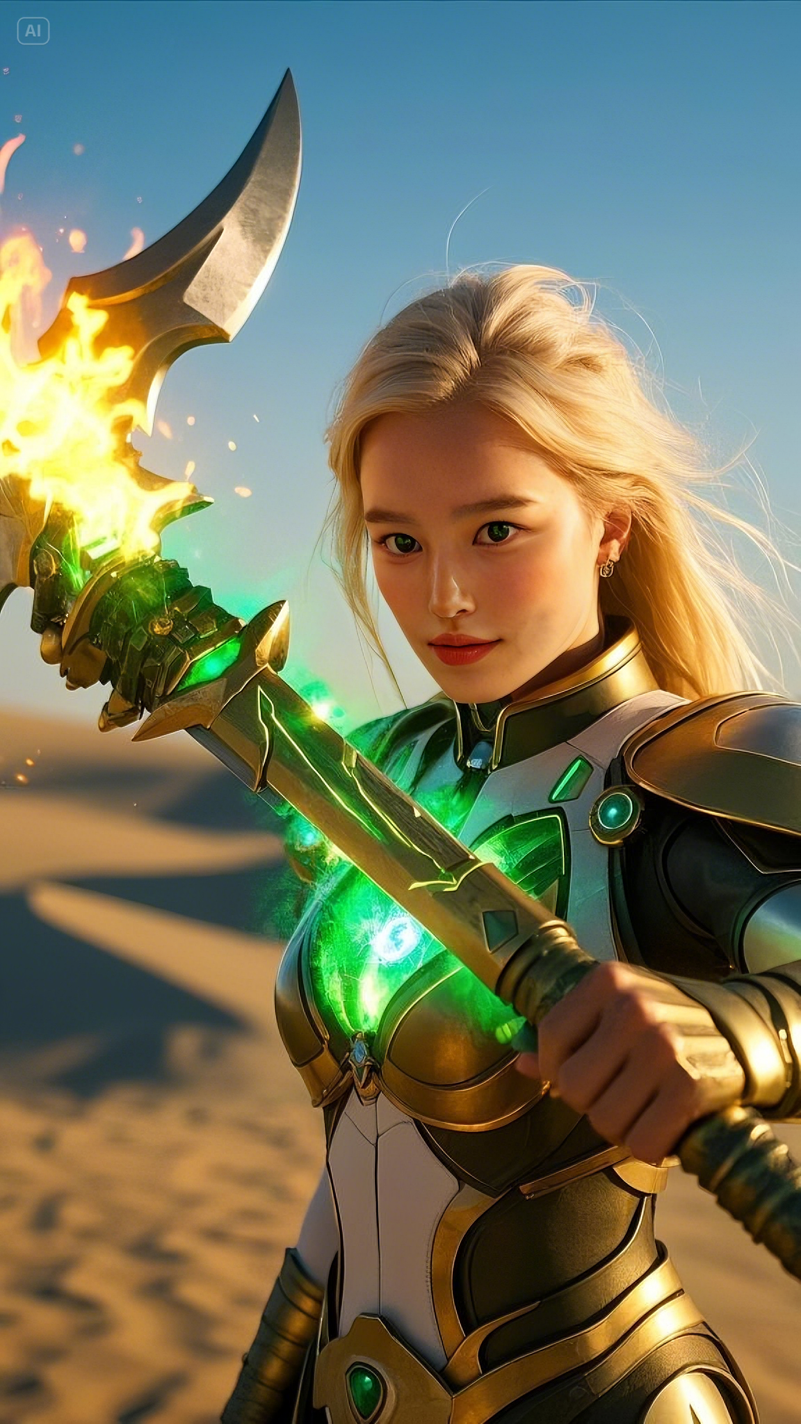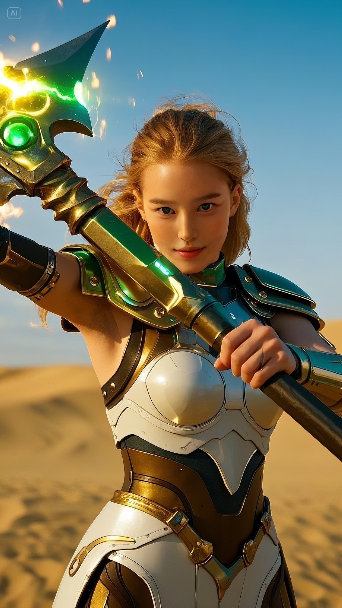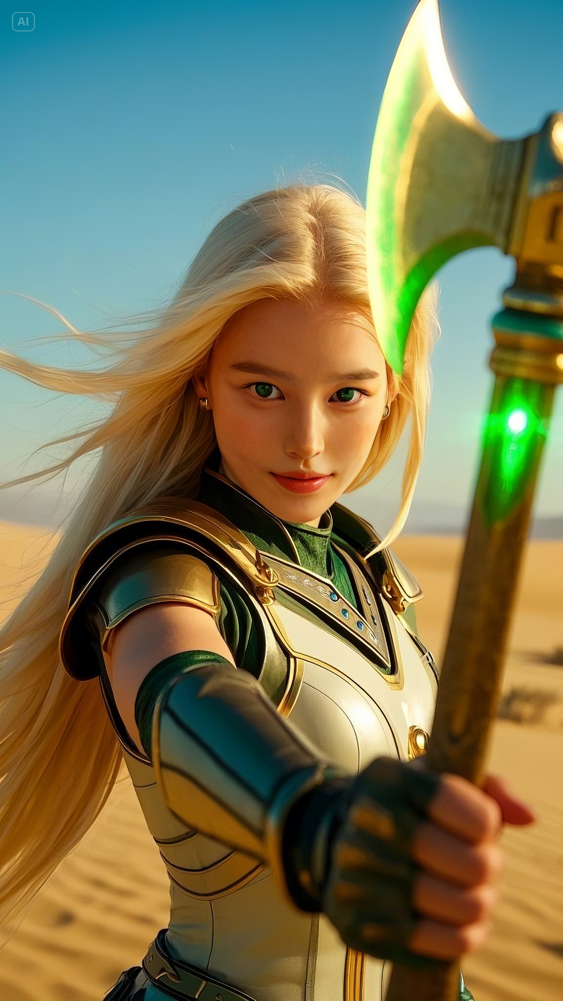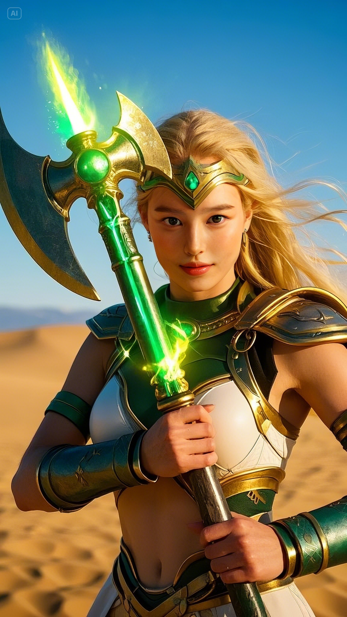 Selene stood atop a high dune, gripping her gold and emerald battle axe, its energy pulsating with raw power. She was no ordinary warrior; she was the chosen protector of these lands, the Emerald Warlord, blessed with the strength of the celestial spirits. Her emerald-green eyes scanned the horizon, watching as dark forces gathered beyond the dunes.