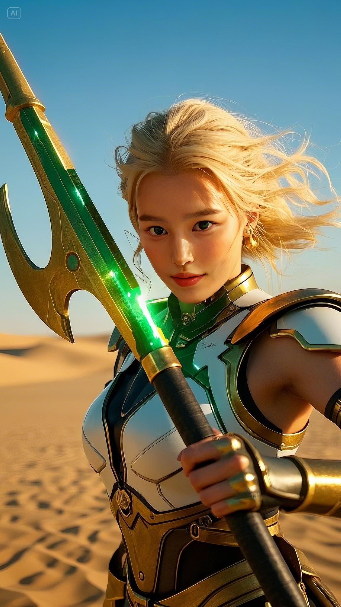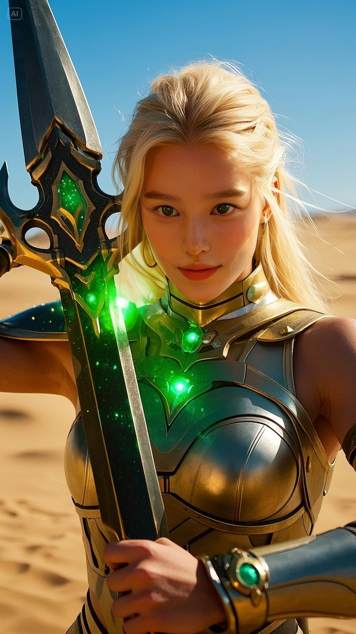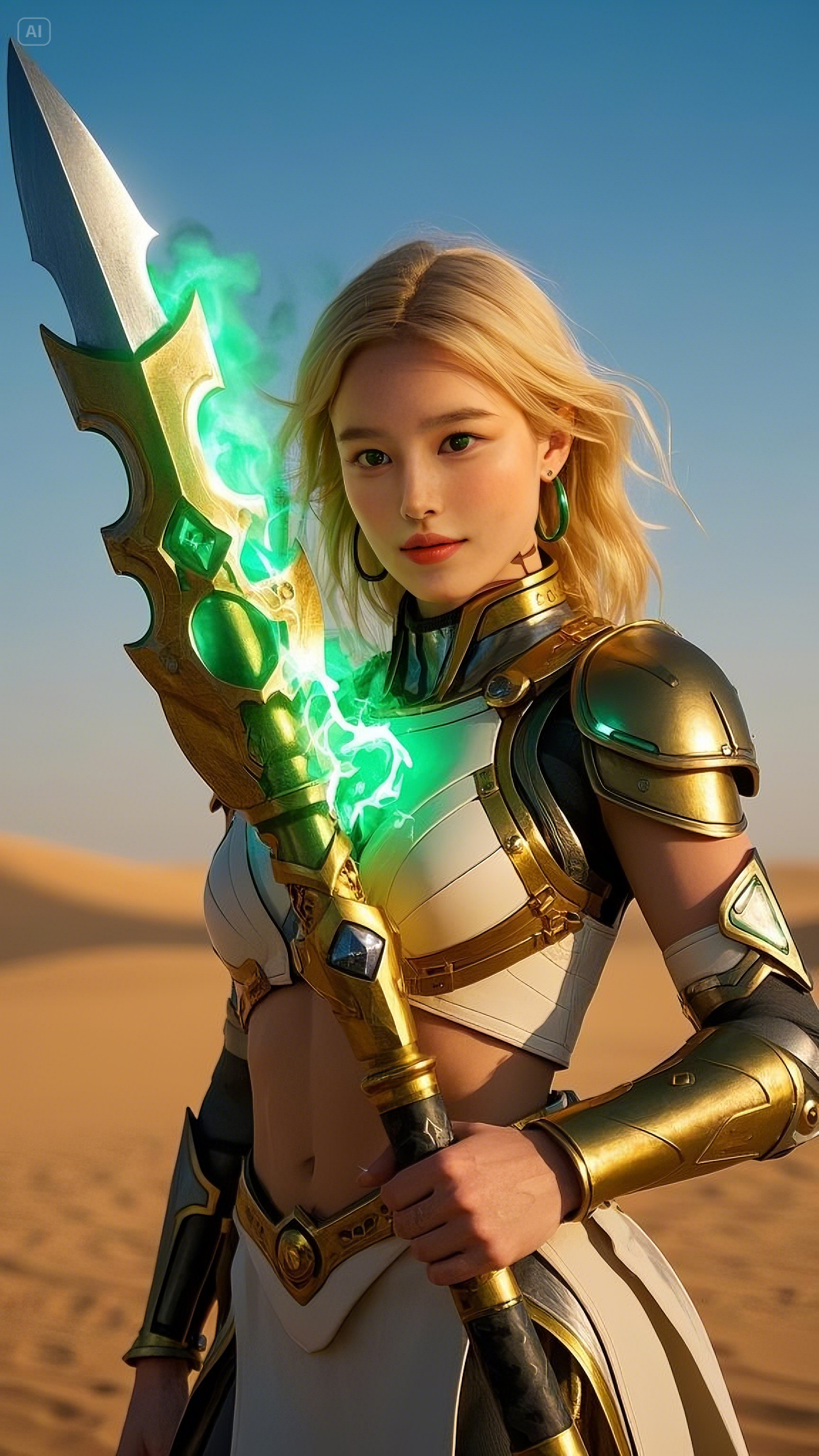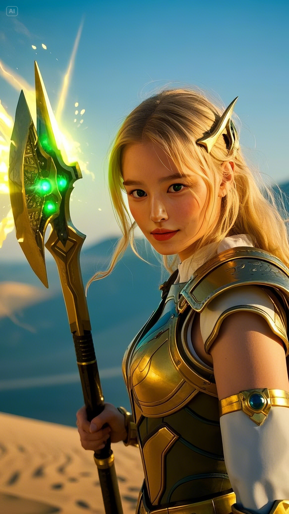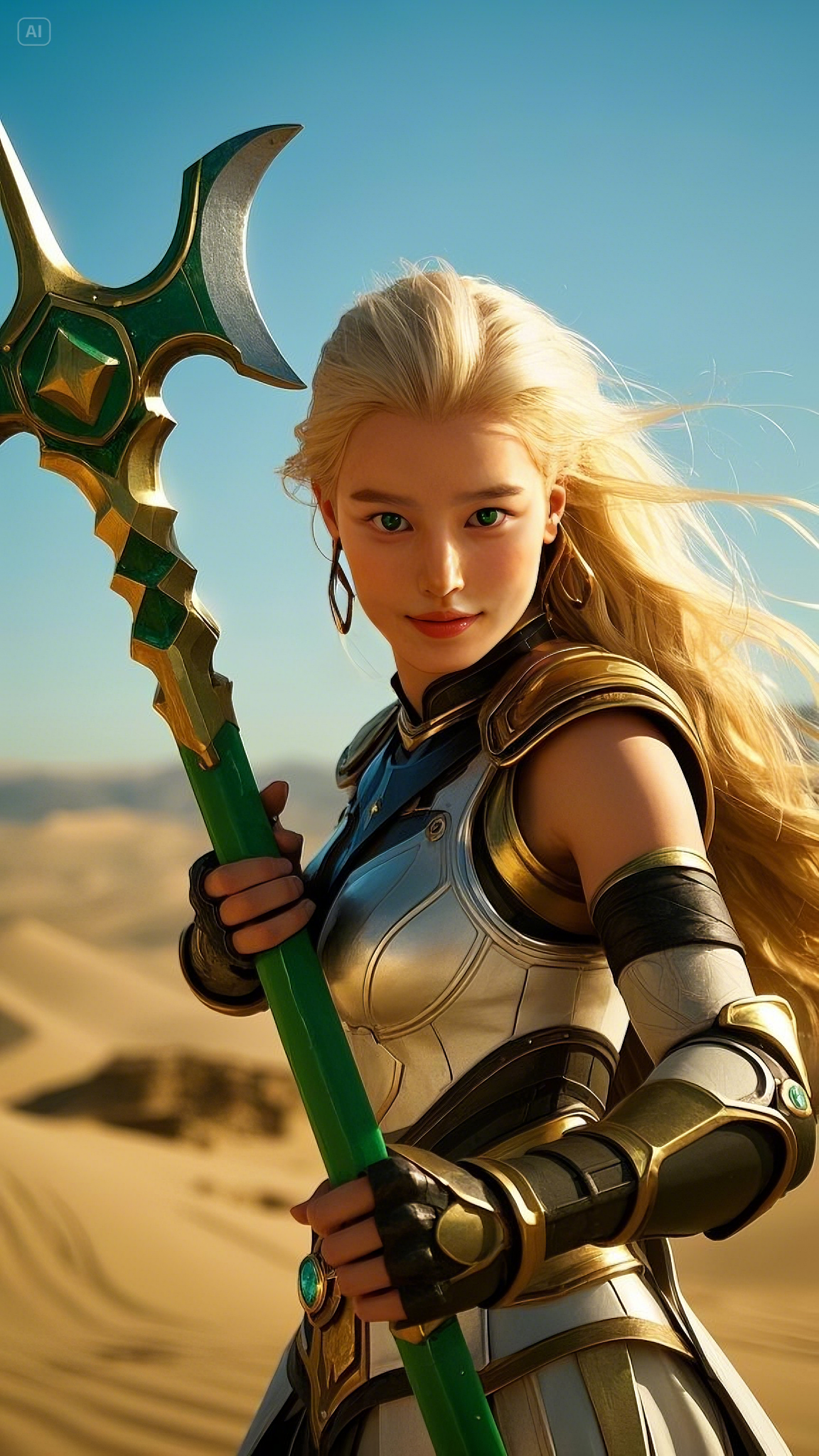 Selene stood atop a high dune, gripping her gold and emerald battle axe, its energy pulsating with raw power. She was no ordinary warrior; she was the chosen protector of these lands, the Emerald Warlord, blessed with the strength of the celestial spirits. Her emerald-green eyes scanned the horizon, watching as dark forces gathered beyond the dunes.