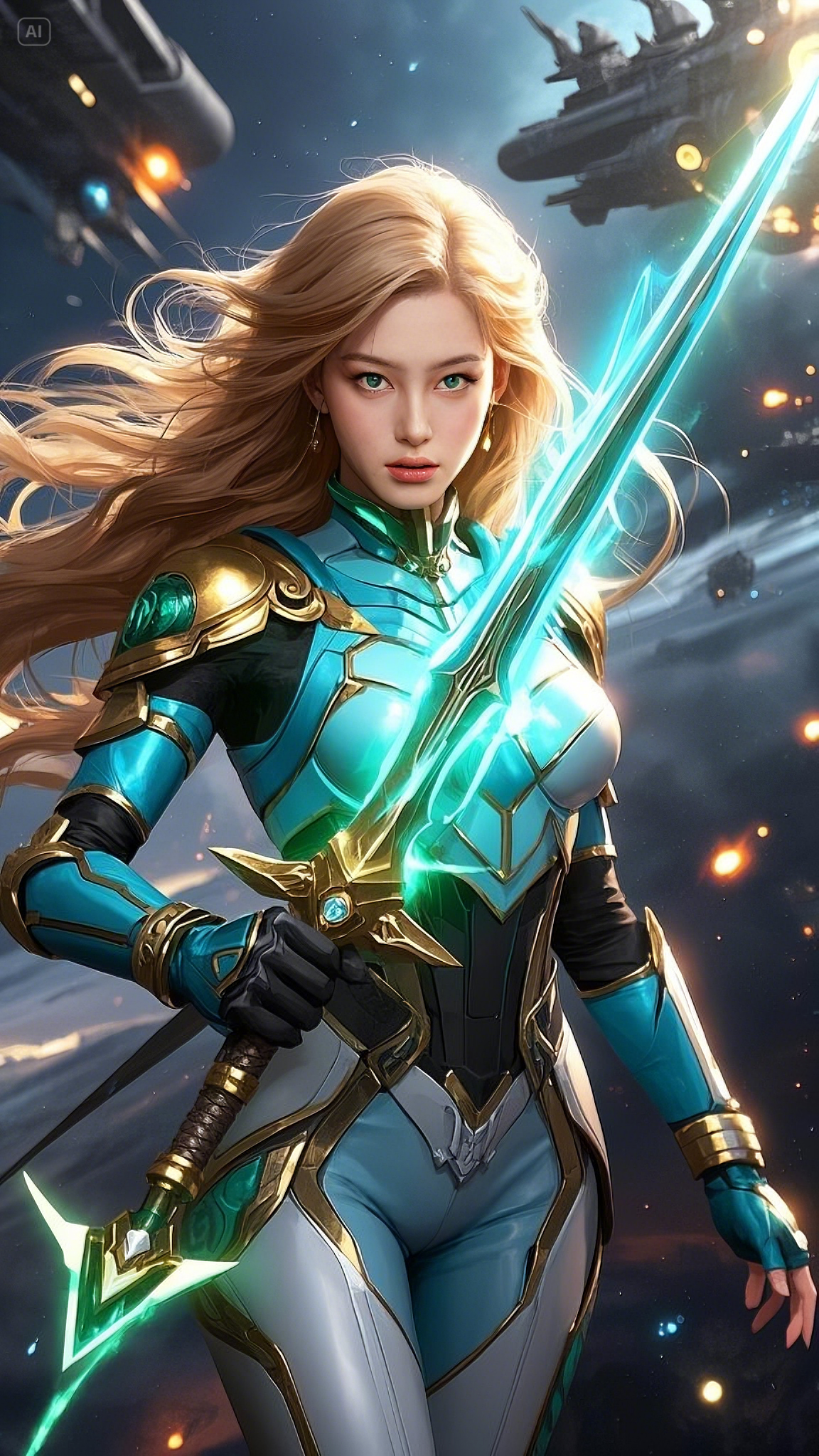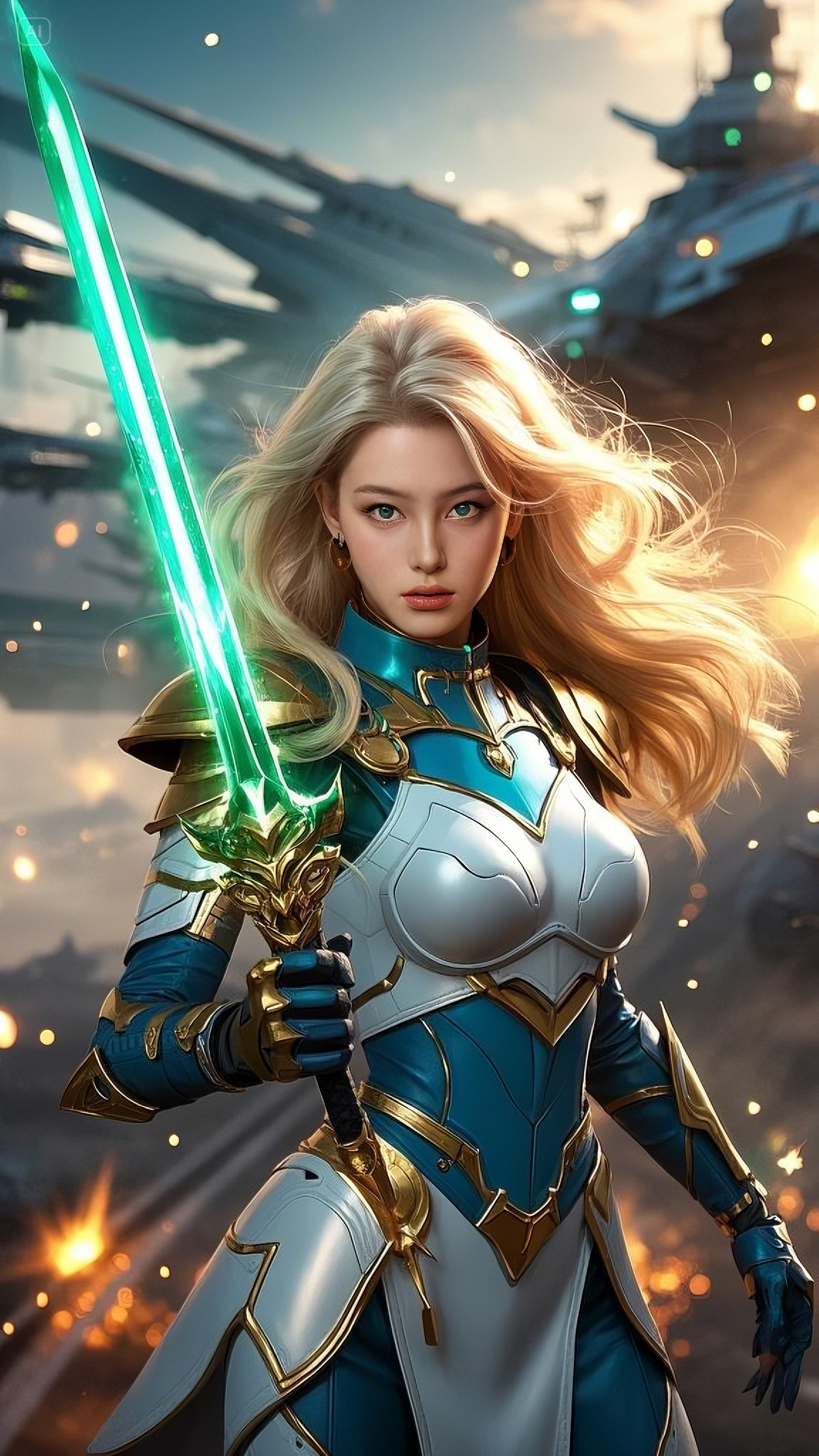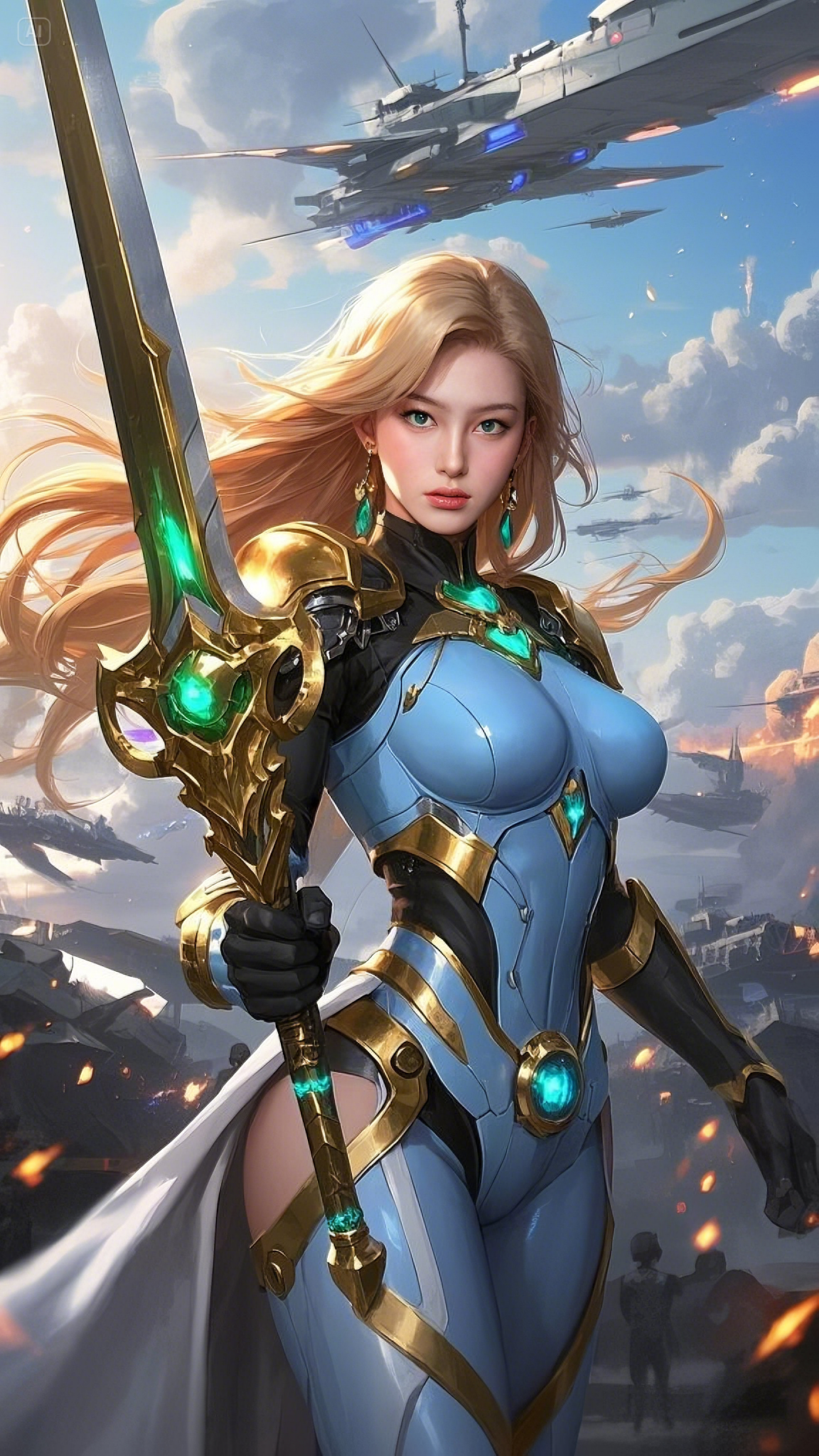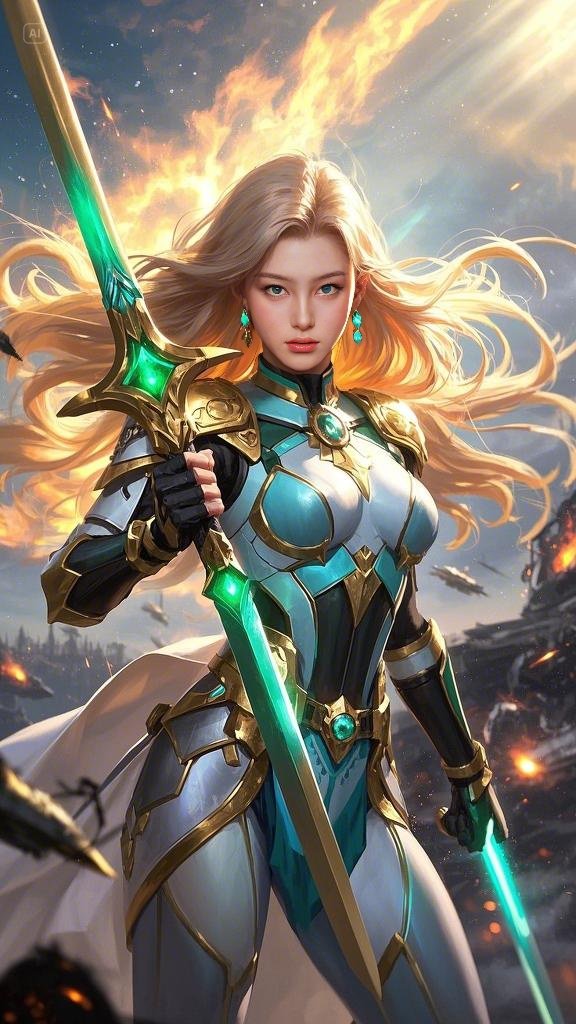 Seraphina, the Guardian of the Celestial Order, gripped her sword tightly, the ethereal glow of its emerald core pulsing with untamed energy. She was clad in the finest armor ever forged, a fusion of golden celestial steel and energy-reactive fabrics, crafted by the ancient Hermes artificers. The fabric clung to her form, lightweight yet resilient enough to withstand the mightiest of enemy weapons. Her cascading golden hair, kissed by the cosmic winds, flowed behind her like a celestial river.