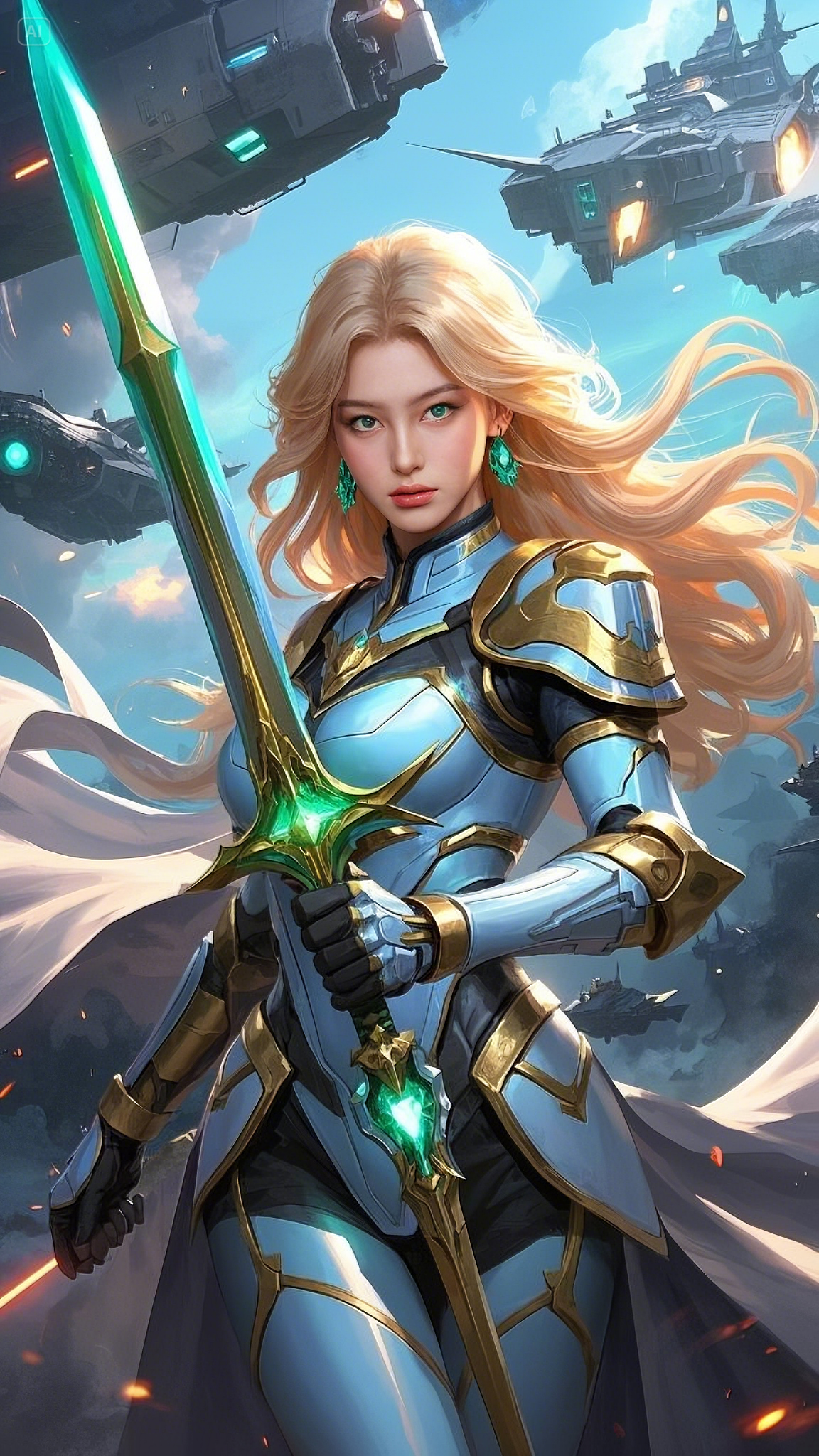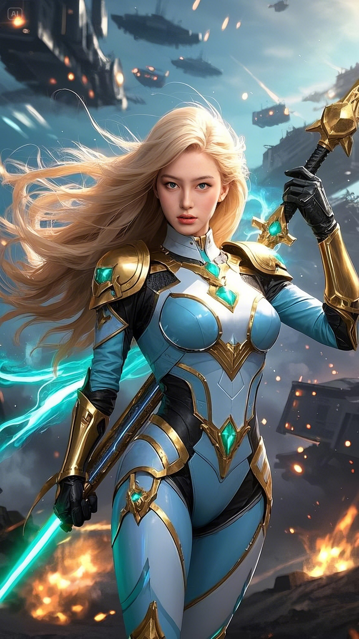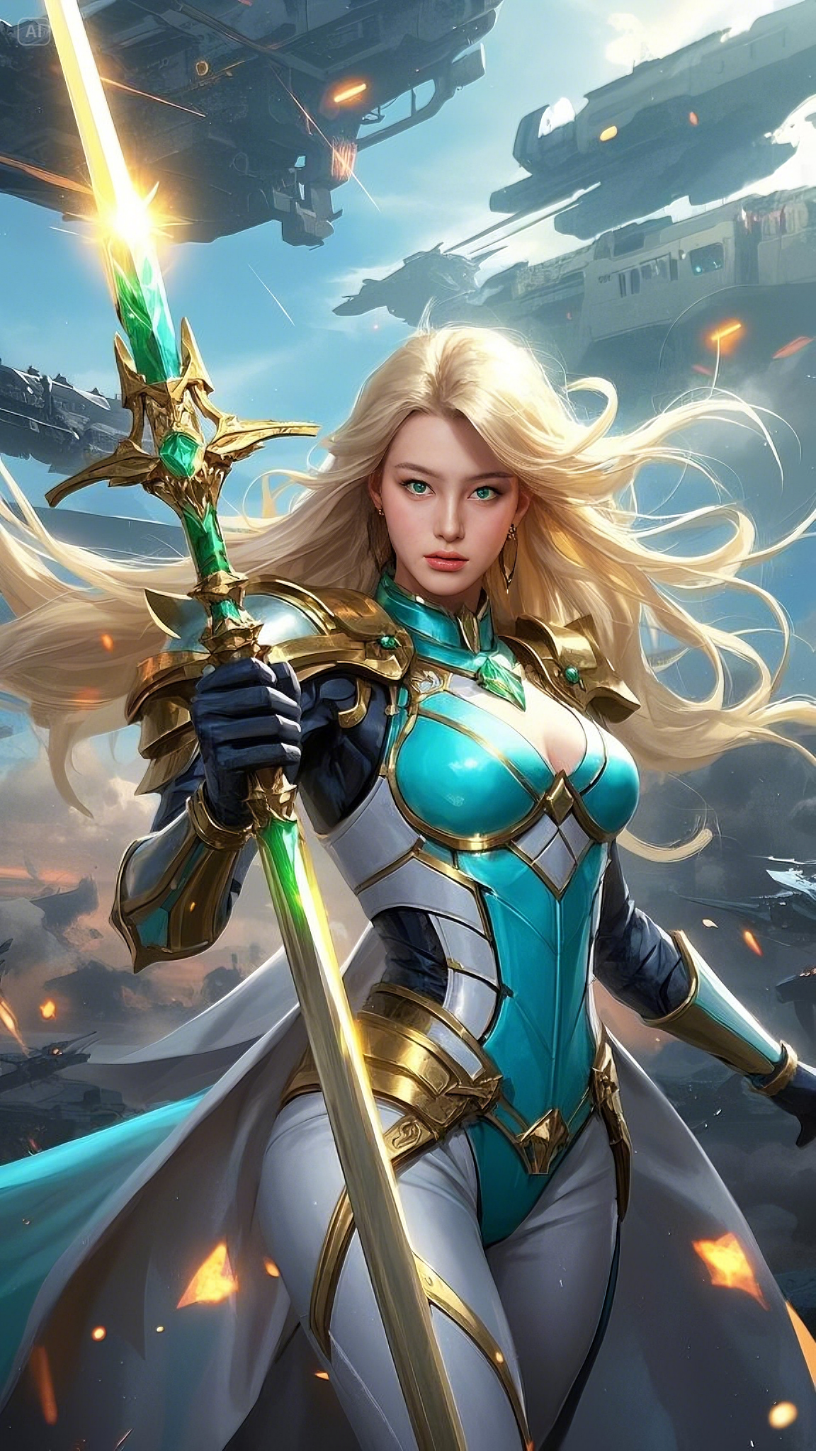 Seraphina, the Guardian of the Celestial Order, gripped her sword tightly, the ethereal glow of its emerald core pulsing with untamed energy. She was clad in the finest armor ever forged, a fusion of golden celestial steel and energy-reactive fabrics, crafted by the ancient Hermes artificers. The fabric clung to her form, lightweight yet resilient enough to withstand the mightiest of enemy weapons. Her cascading golden hair, kissed by the cosmic winds, flowed behind her like a celestial river.