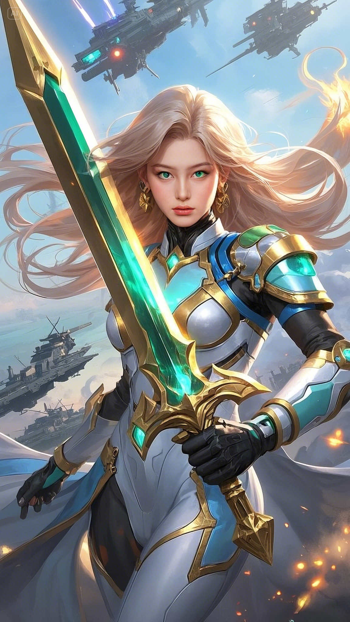 Suddenly, an enemy dreadnought descended, its cannons charging with a golden inferno aimed directly at Seraphina’s position. Her grip tightened around the hilt of her celestial sword, and with a powerful motion, she swung the blade forward. A radiant burst of emerald energy erupted from the weapon, slashing through the darkness and colliding with the enemy’s energy core. The dreadnought shuddered before exploding in a spectacular eruption of flames and debris.