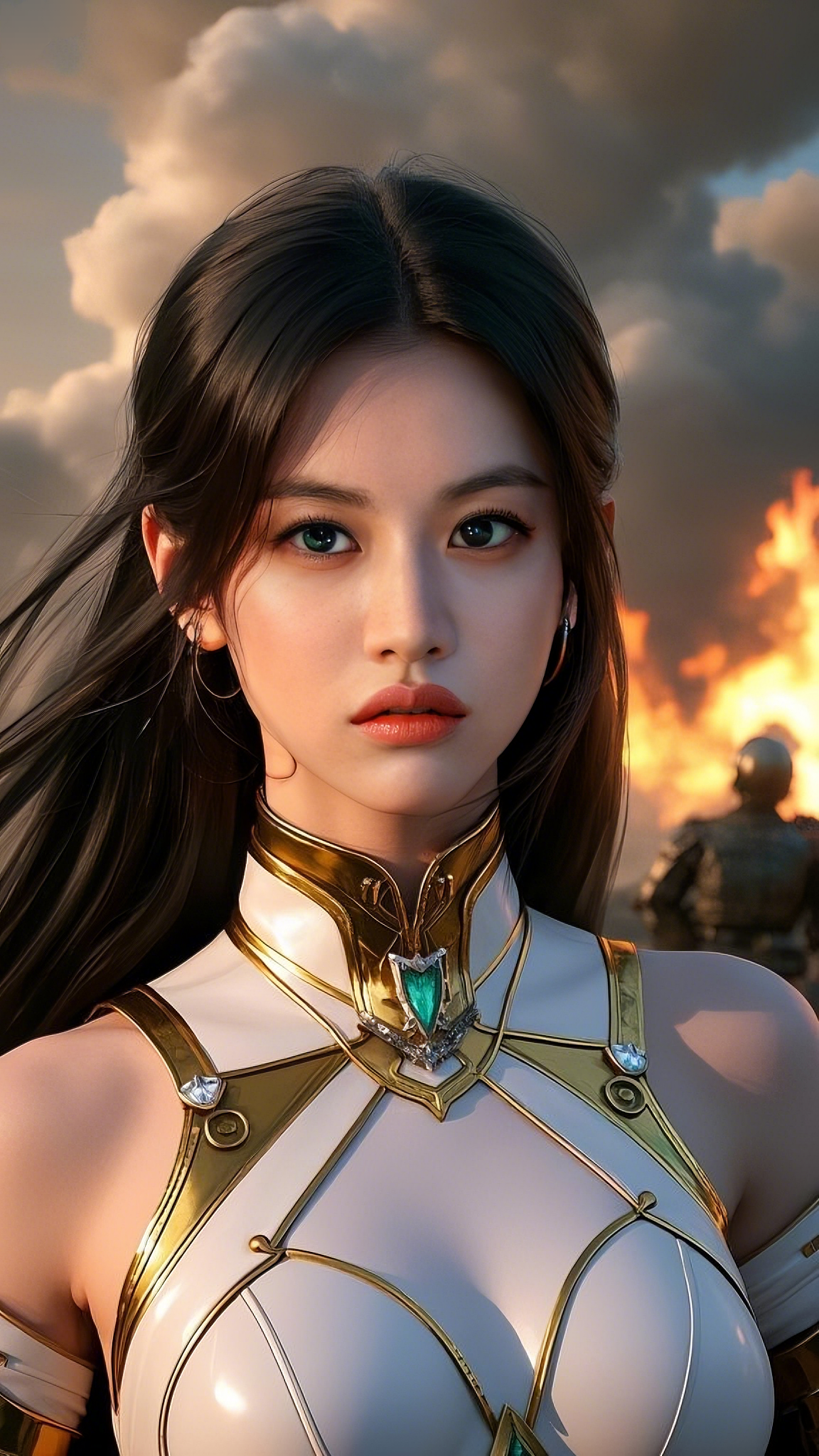 The battlefield burned with the fury of war, smoke rising into the storm-filled sky. Explosions echoed in the distance, their shockwaves rippling through the devastated land. Amidst the chaos, she stood—a warrior of celestial beauty and unshakable resolve.