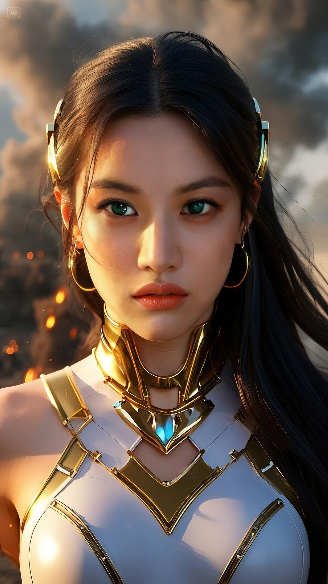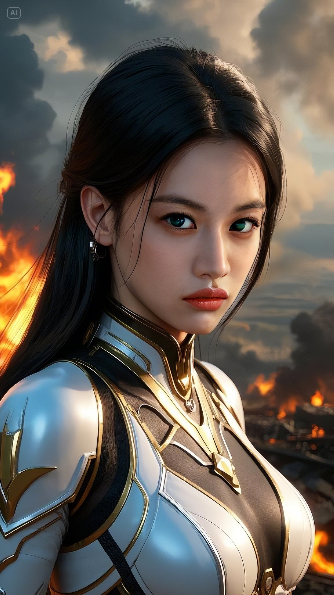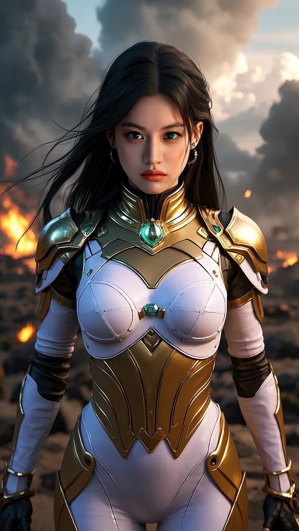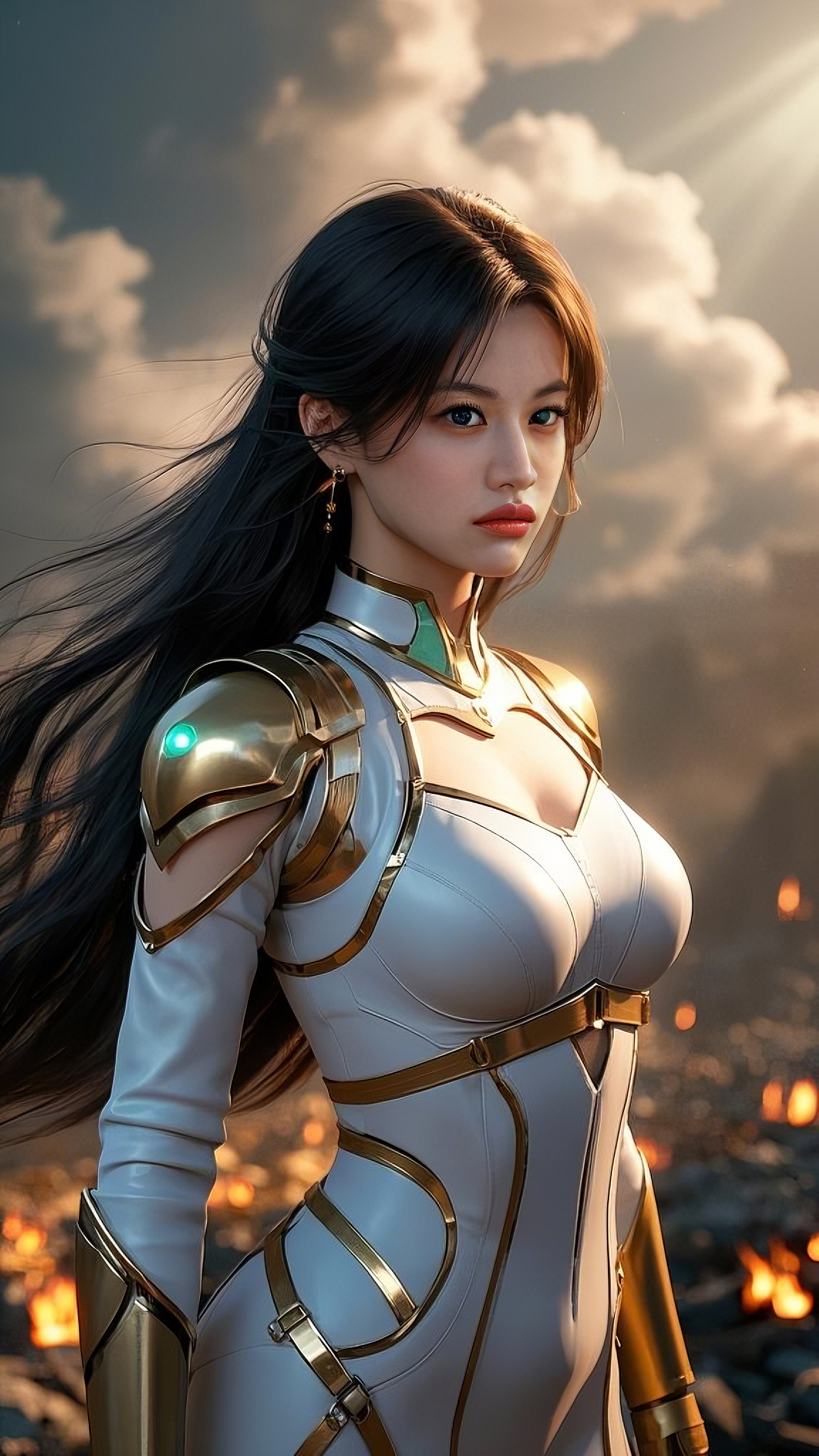 Her long, flowing black hair, thick with countless strands, moved in the wind, a living shadow against the golden light that danced across her armor. The gleaming, high-tech suit of white and gold clung to her form, an elegant yet impenetrable shell designed for both protection and dominance. Every detail of her attire reflected an artistry beyond mortal craftsmanship—technology infused with divine energy.