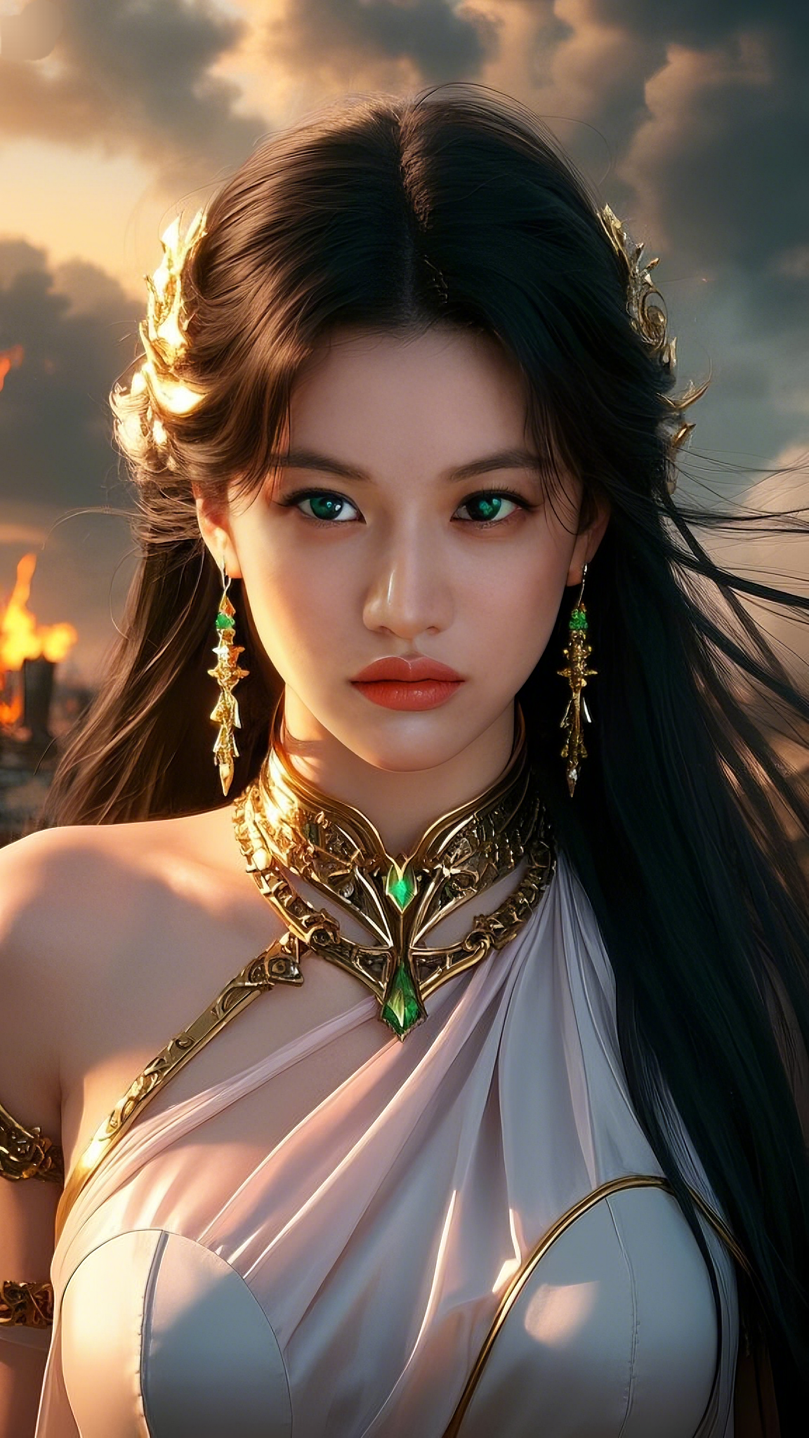 The war had reached its climax. Enemies surrounded her, their weapons trained upon her divine form, but she did not falter. Her emerald-blue eyes, glowing with unearthly fire, scanned the battlefield with unwavering determination. She was not merely a soldier in this war—she was its turning point.
