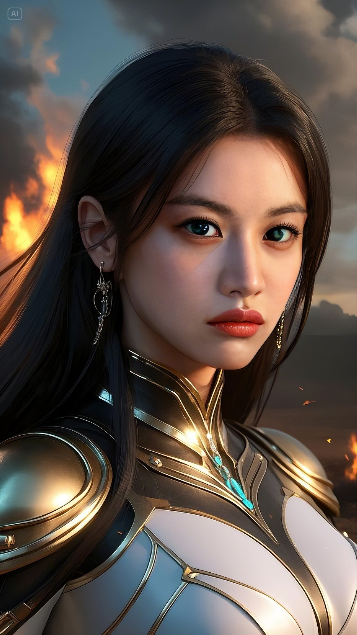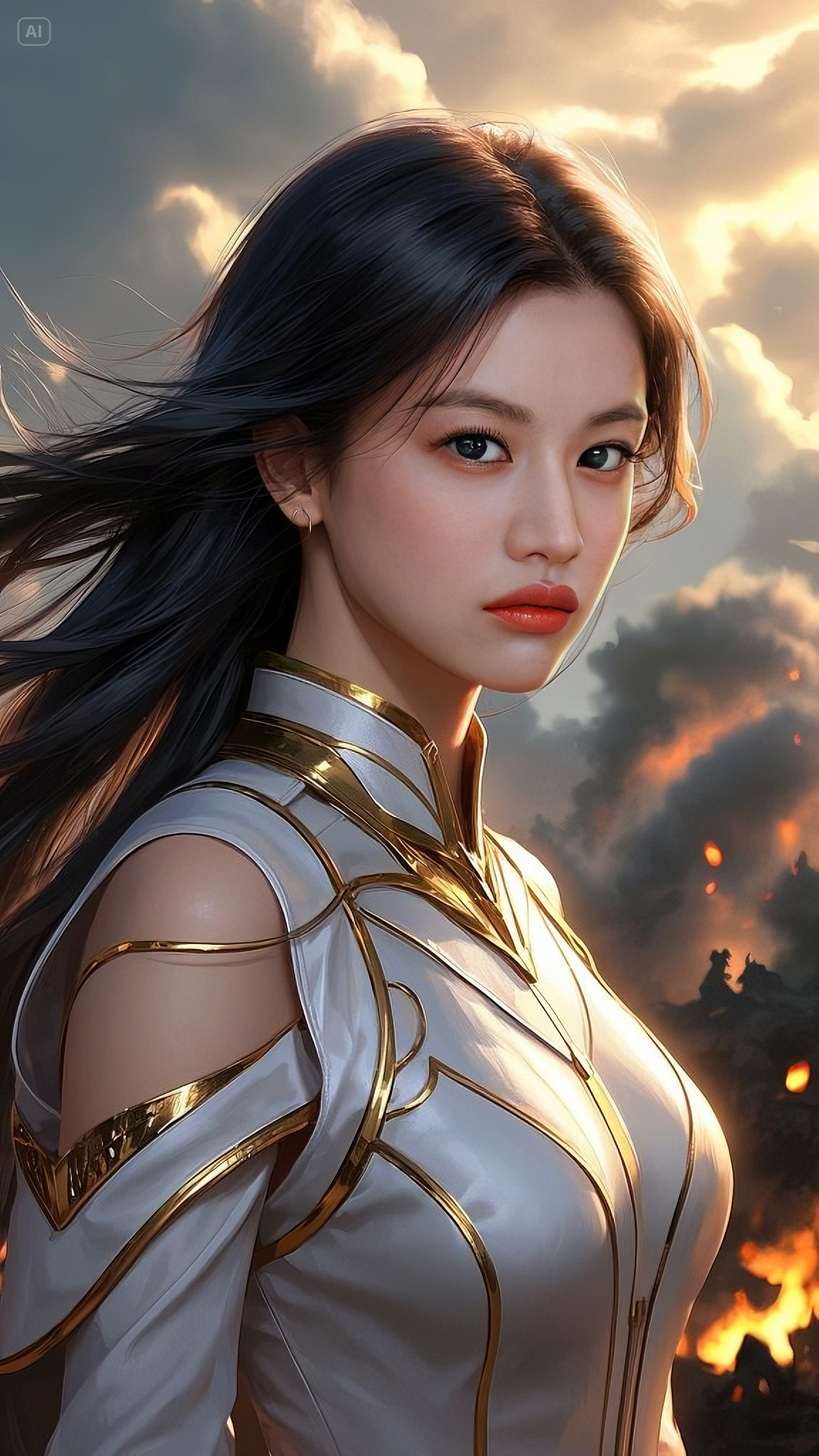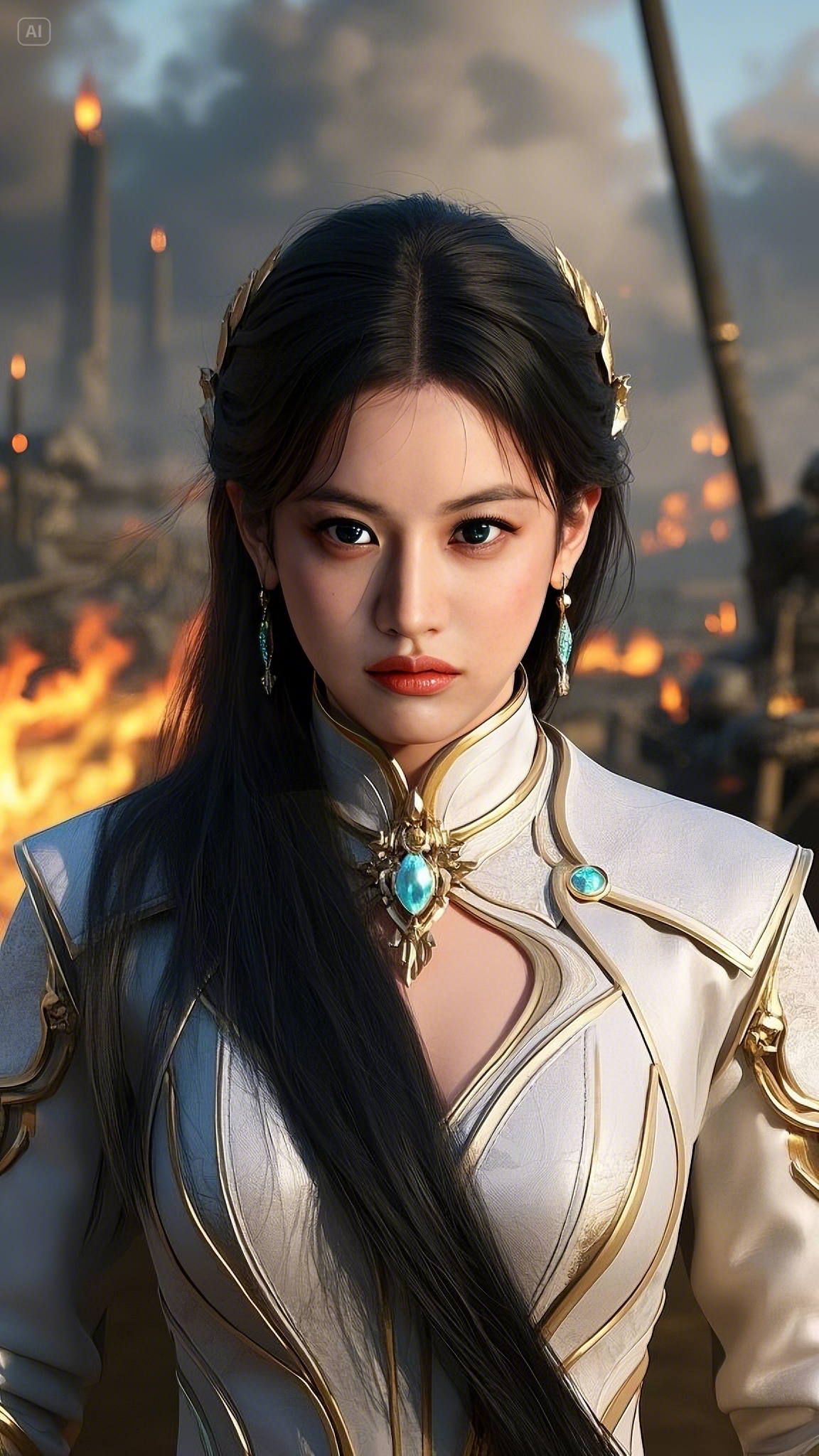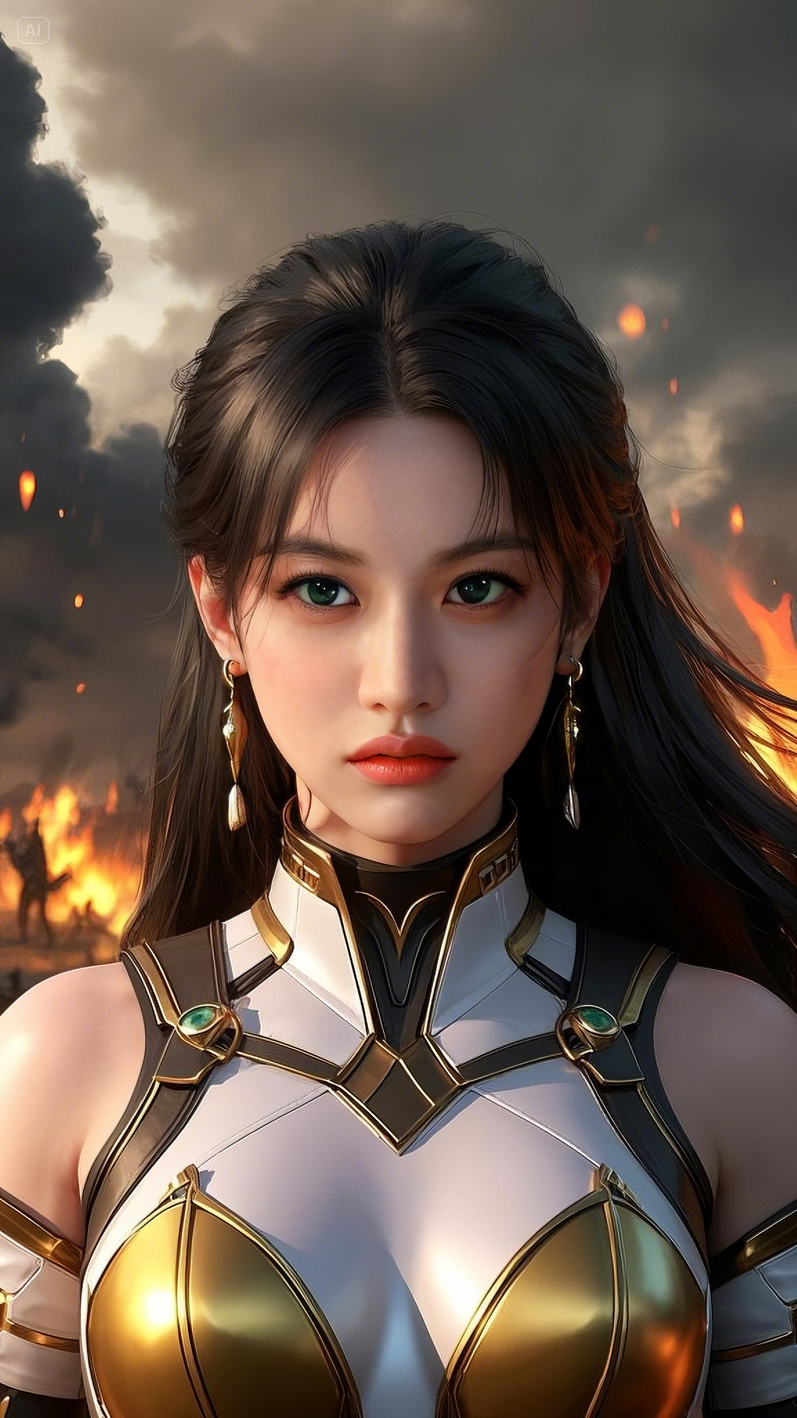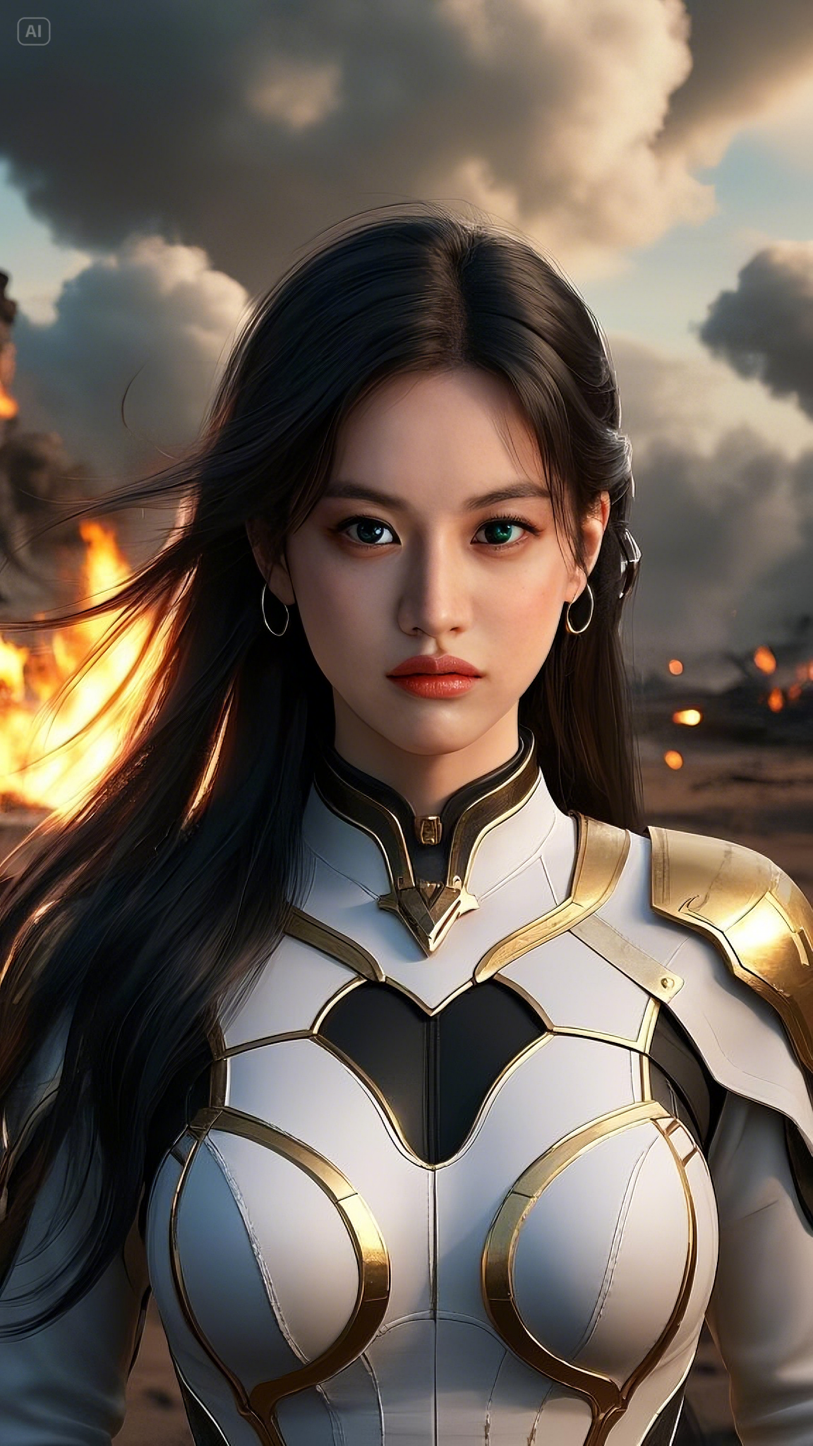 Her emerald-blue eyes glowed, their intensity enough to freeze enemies in place before she even lifted a hand. Her face, untainted by the brutality of war, remained stoic—a porcelain visage of determination carved from the heavens themselves. Every strand of her raven-black hair, cascading down like flowing ink, danced in the wind, shifting with the invisible force that pulsed from her very being.