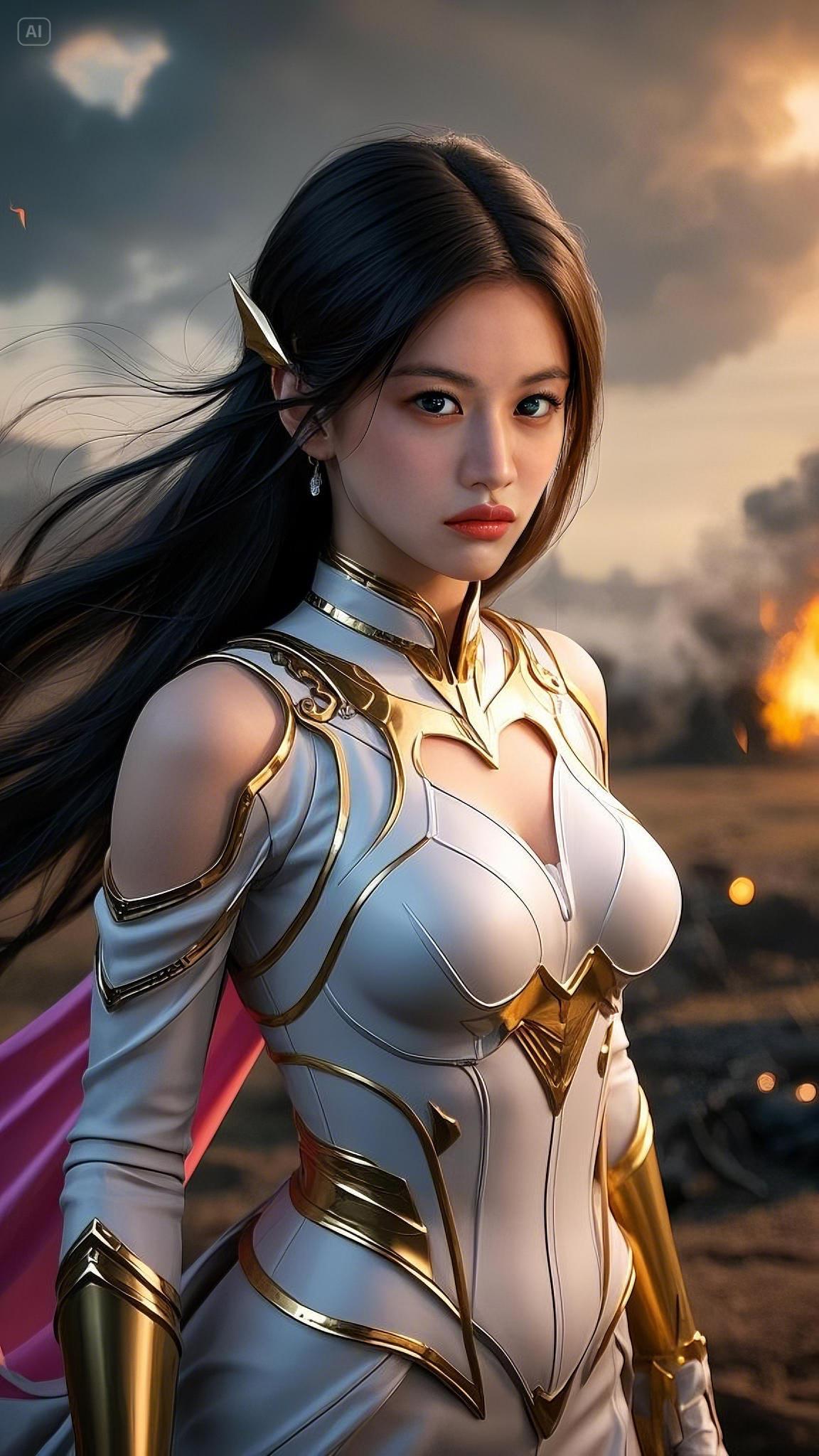 Her presence was both a beacon and a warning, an entity that commanded awe and fear in equal measure. The golden light of the fires reflected against her pristine armor, a creation seemingly forged from divine hands, blending gold and white into a seamless form-fitting masterpiece. The smooth yet unyielding material clung to her frame, reinforcing the illusion of elegance masking unimaginable power.